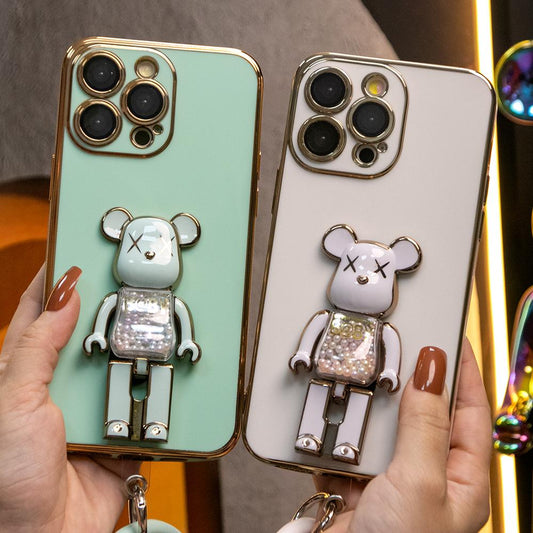 For iPhone 16 15 14 13 Pro Max Phone Case with Silicone Wristband, Candy Bear Kickstand TPU Luxury Plating Slim Soft Full Cover