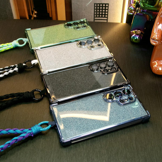 Luxury Glitter Plating Four Corners Shockproof Clear Case With Woven Wristband for Samsung Galaxy S24Ultra S24FE S24 S23FE S22 S21 Plus Transparent Hard Acrylic Hybrid Bumper Armor Cover