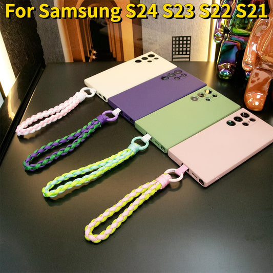 Silicone Matte Phone Case with Braided Rope Bracelet For Samsung S25 S24 S23 S22 S21 Note20 Camera Protect Soft Cover