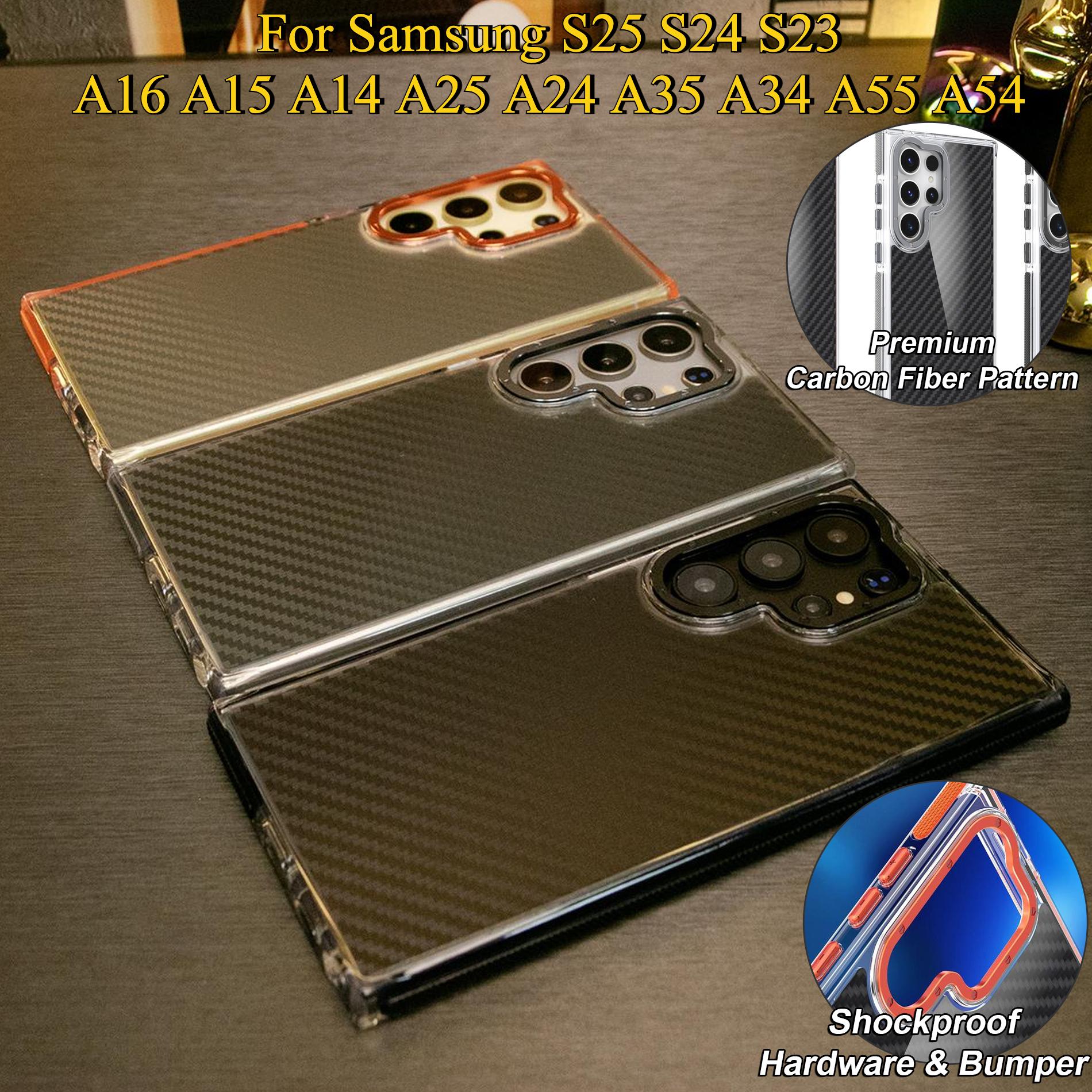 Carbon Fiber Pattern Phone Case, Metal Hardware Camera Protective Acrylic Cover, Clear No Yellow, With Shockproof Anti-Fall Bumper For Samsung S25Ultra S24 S23 S21FE A14 A15 A24 A25 A35 A54 A55 A05