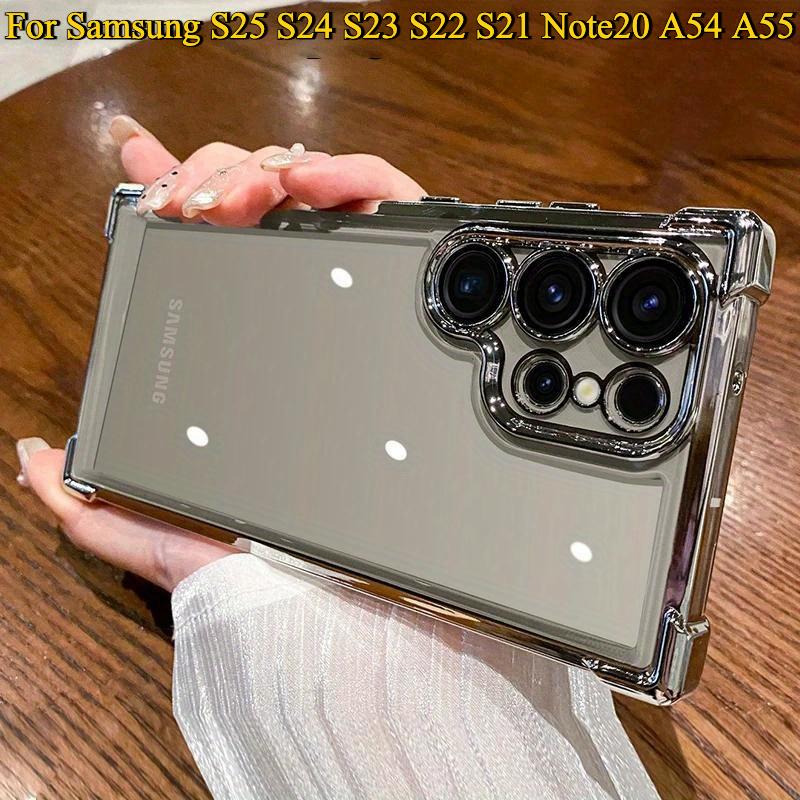 Electroplated Four Corners Anti-fall Transparent Hard PC Phone Case For Samsung S25 S24 S23 S22 S21 Note20 A54 A55, Full Cover with Camera Protector