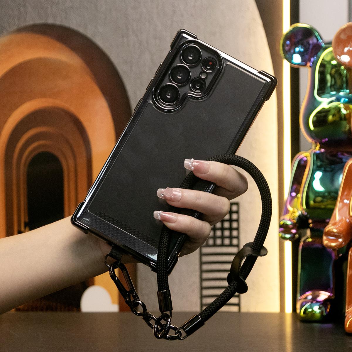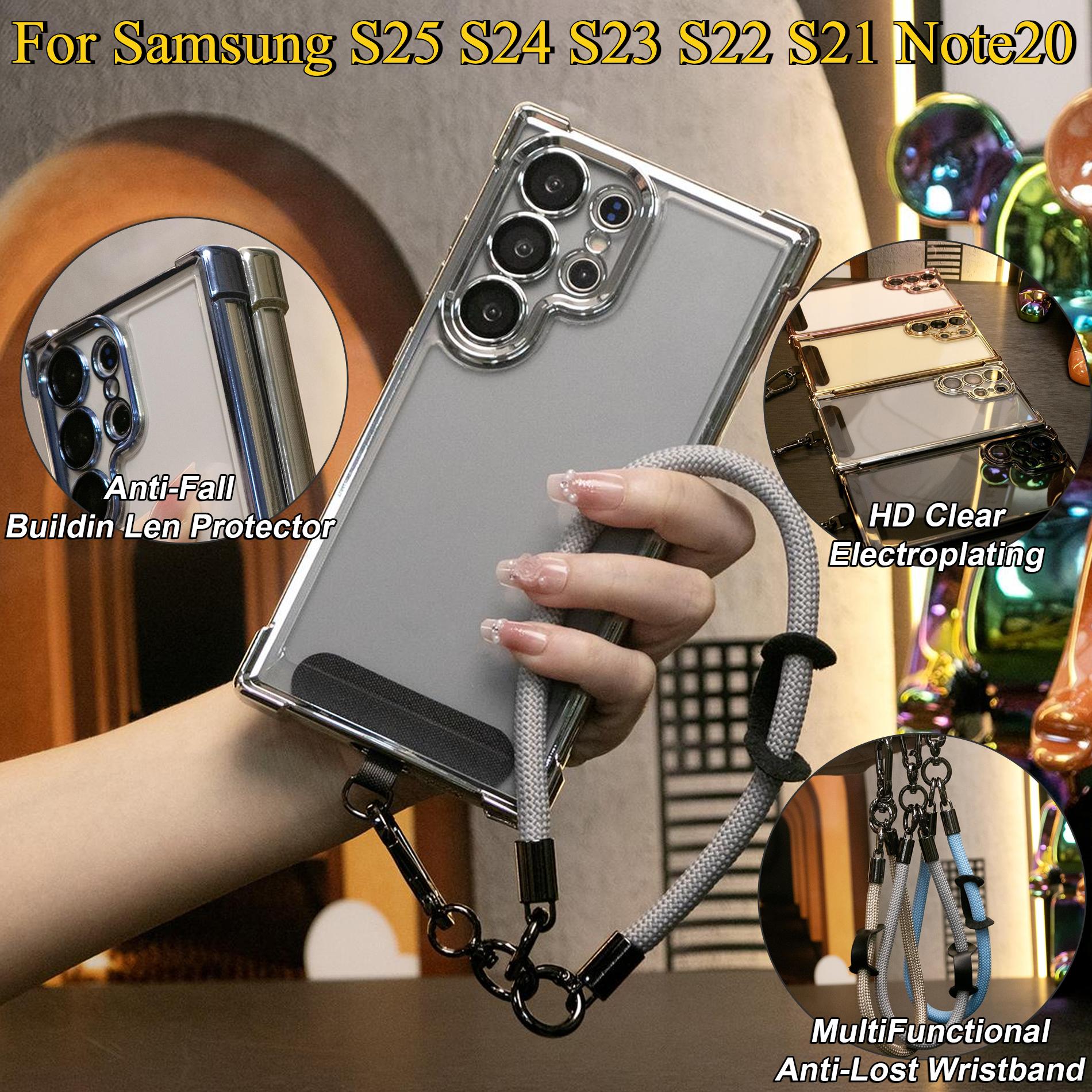 Electroplated Four Corners Anti-fall Transparent Hard PC Phone Case With Multifunctional Wristband For Samsung S25Ultra S25 S24FE S24Ultra S24 S22 S21 Note20, Full Cover with Camera Protector