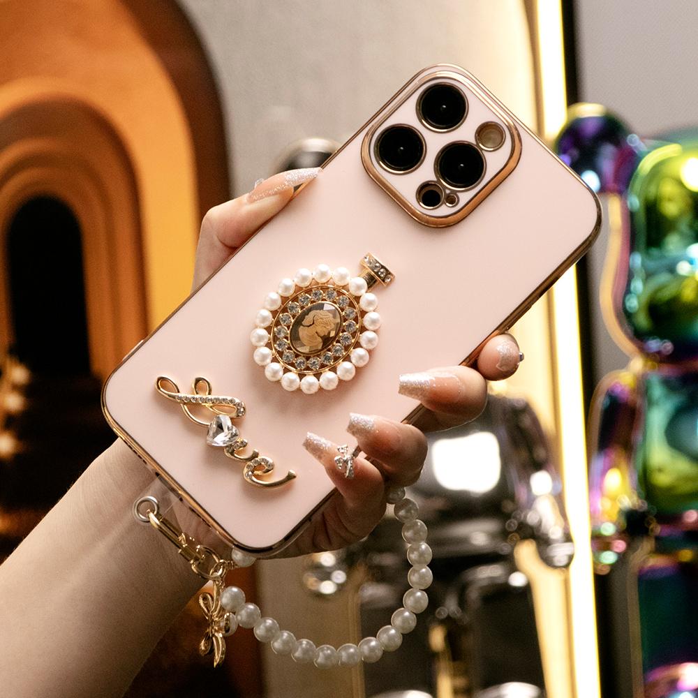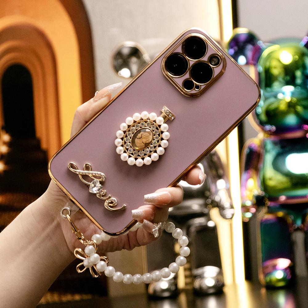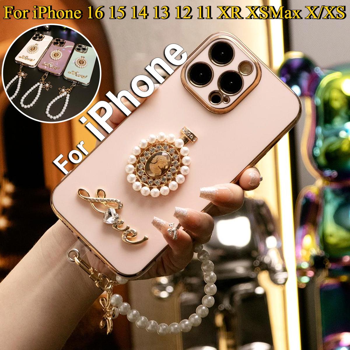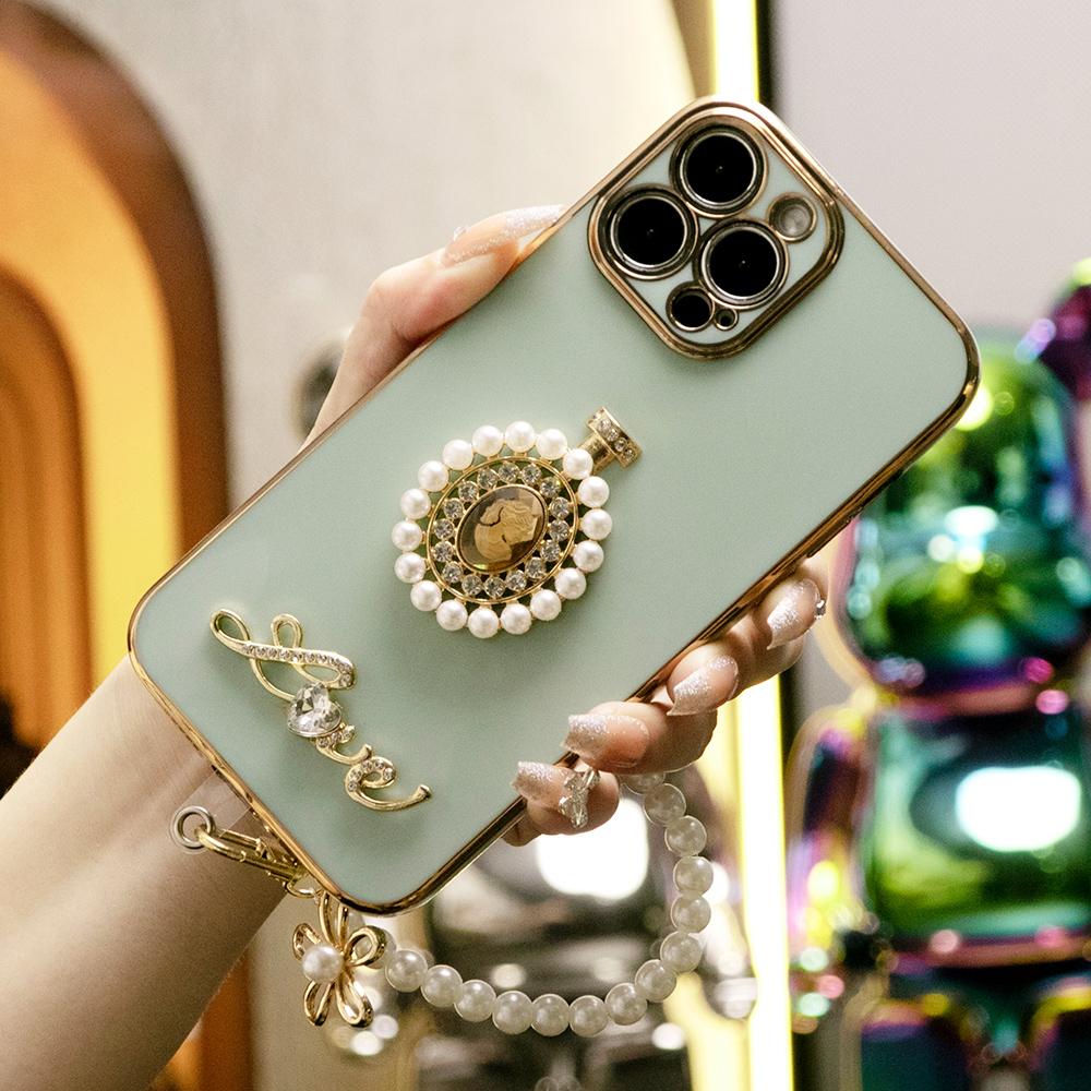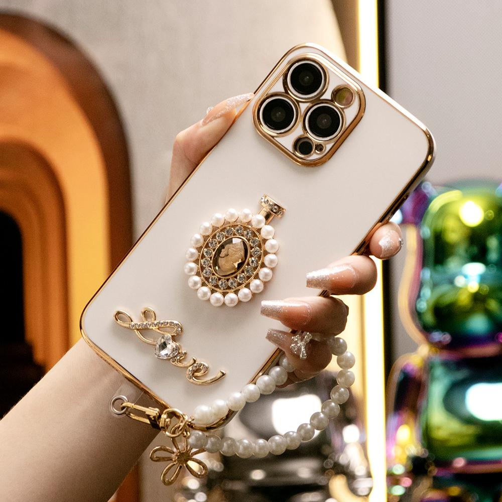 For iPhone 16 15 14 13 12 11 XR XSMax X/XS Phone Case, Pearl Perfume Bottle with Chain, Plating Electroplate Luxury Elegant Case Camera Protector Shockproof Soft Cover