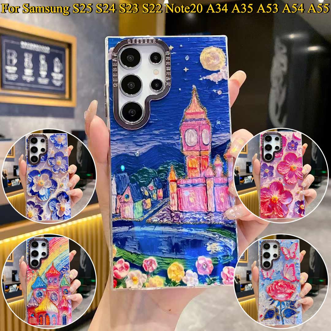For Samsung S25 S24 S23 S22 A34 A35 A53 A54 A55 Note20Ultra Phone Case, Luxury Elegant Colorful Rainbow Castle Butterfly Flower Oil Painting Metal Camera Frame Anti-drop Hard Shockproof Full Cover