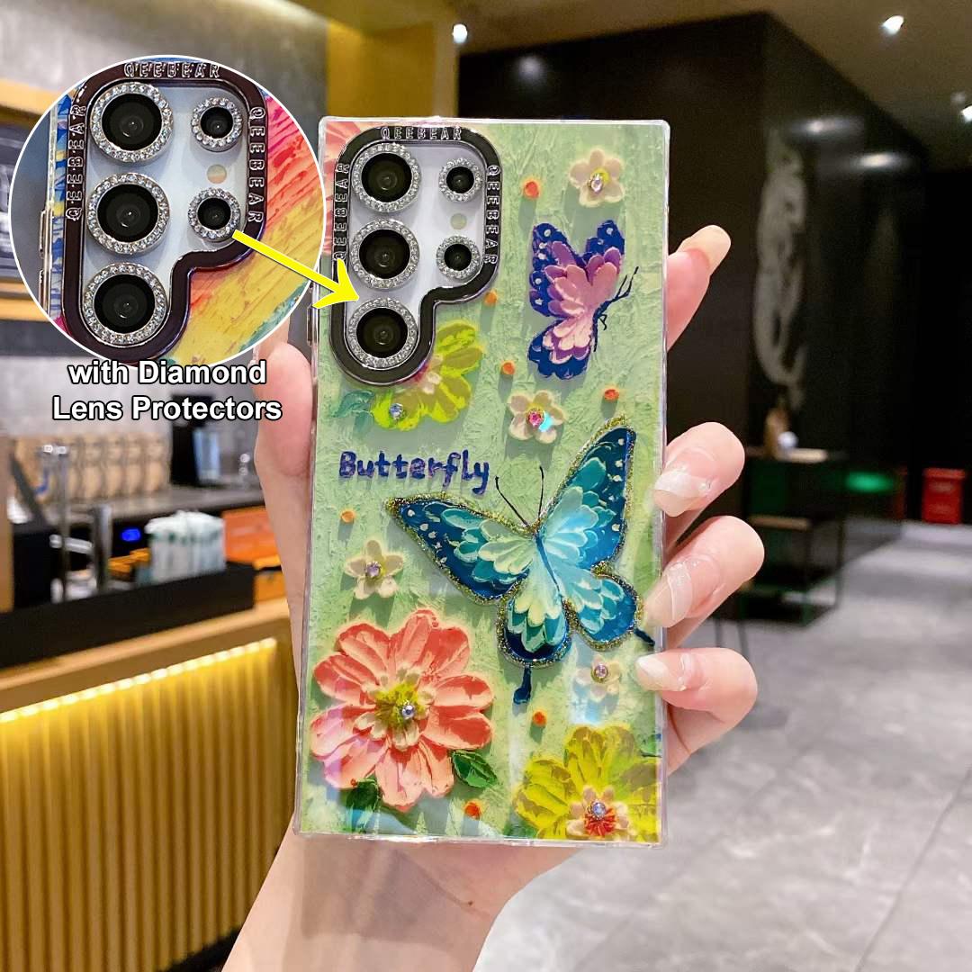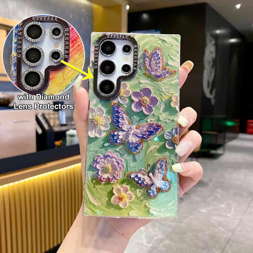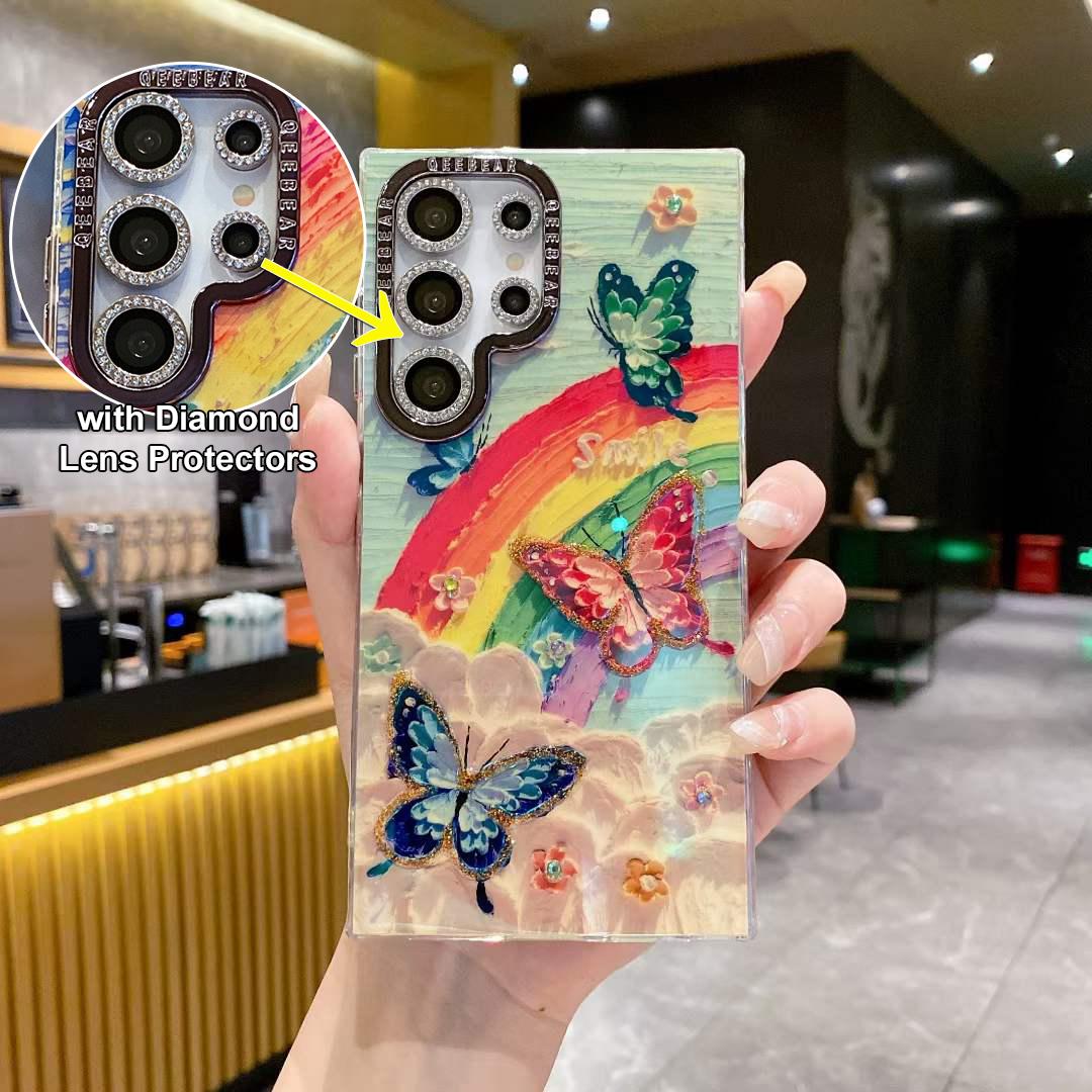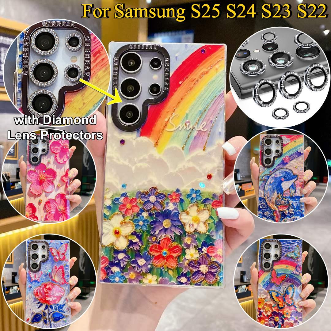 For Samsung S25 S24 S23 S22 Phone Case with Diamond Lens Protectors, Luxury Panda Leopard Rainbow Butterfly Elephant Oil Painting Metal Camera Frame Anti-drop Hard Shockproof Full Cover