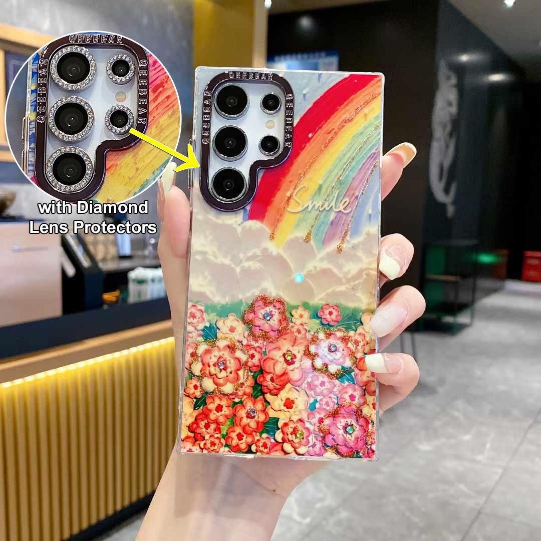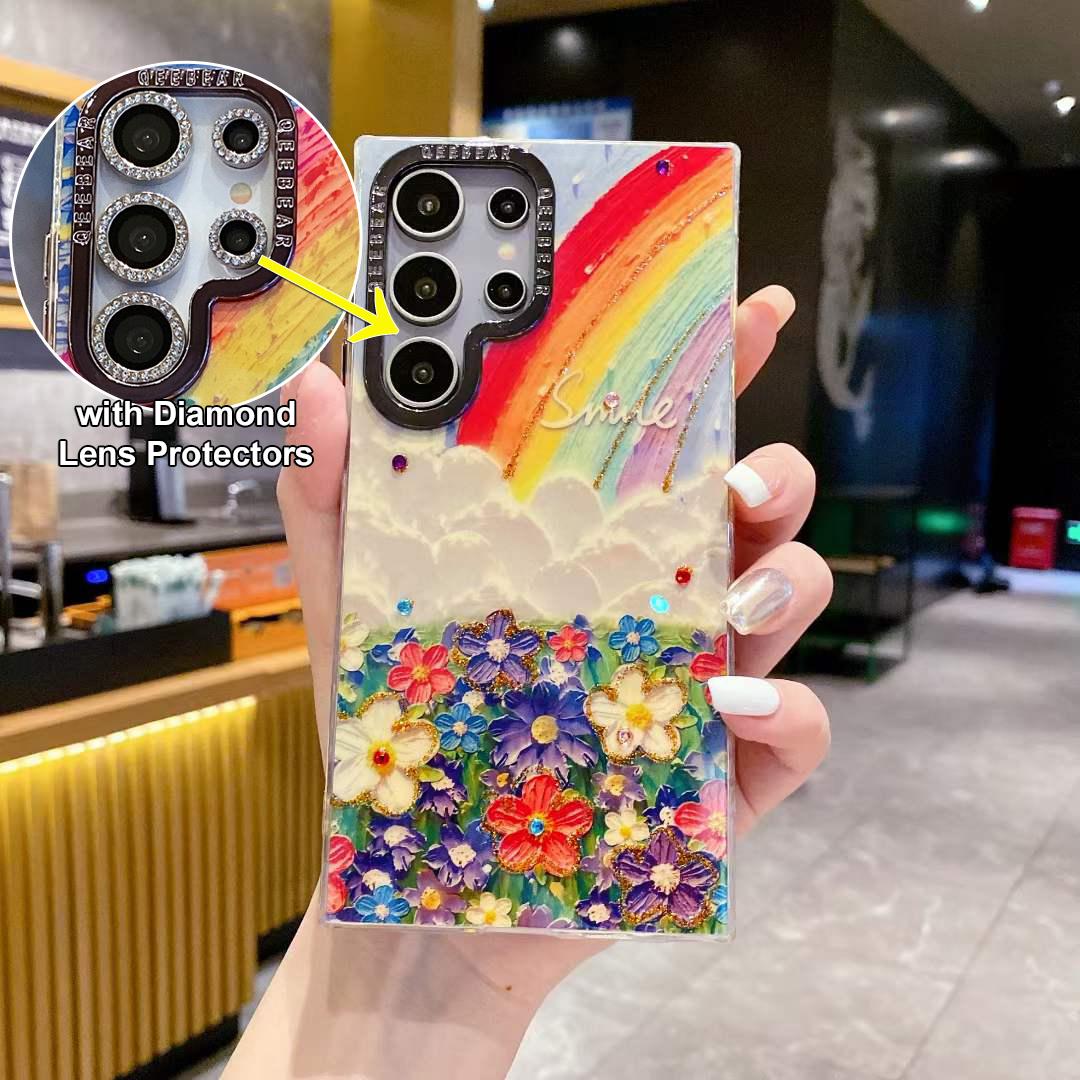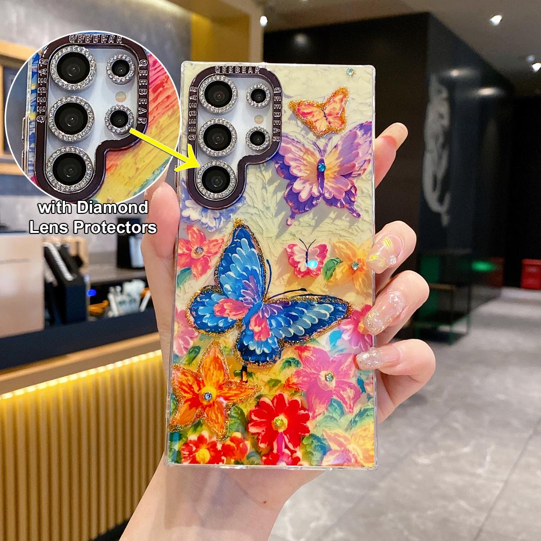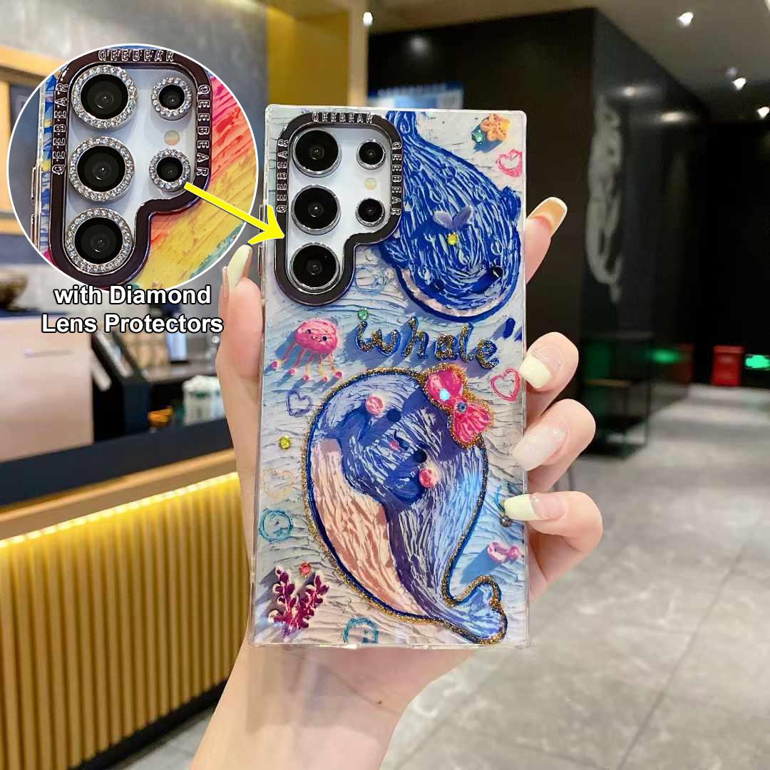 For Samsung S25 S24 S23 S22 Phone Case with Diamond Lens Protectors, Luxury Panda Leopard Rainbow Butterfly Elephant Oil Painting Metal Camera Frame Anti-drop Hard Shockproof Full Cover