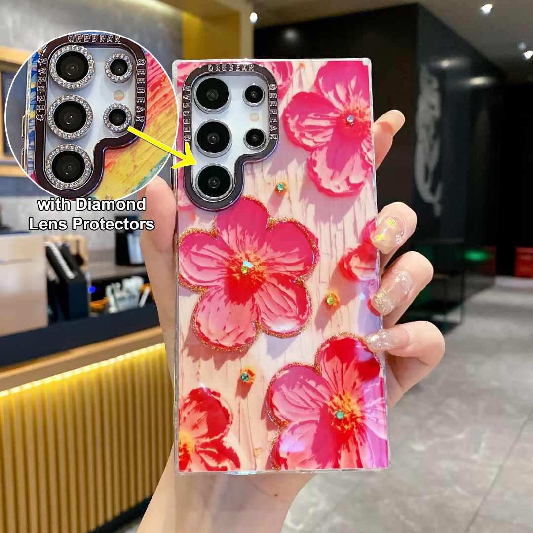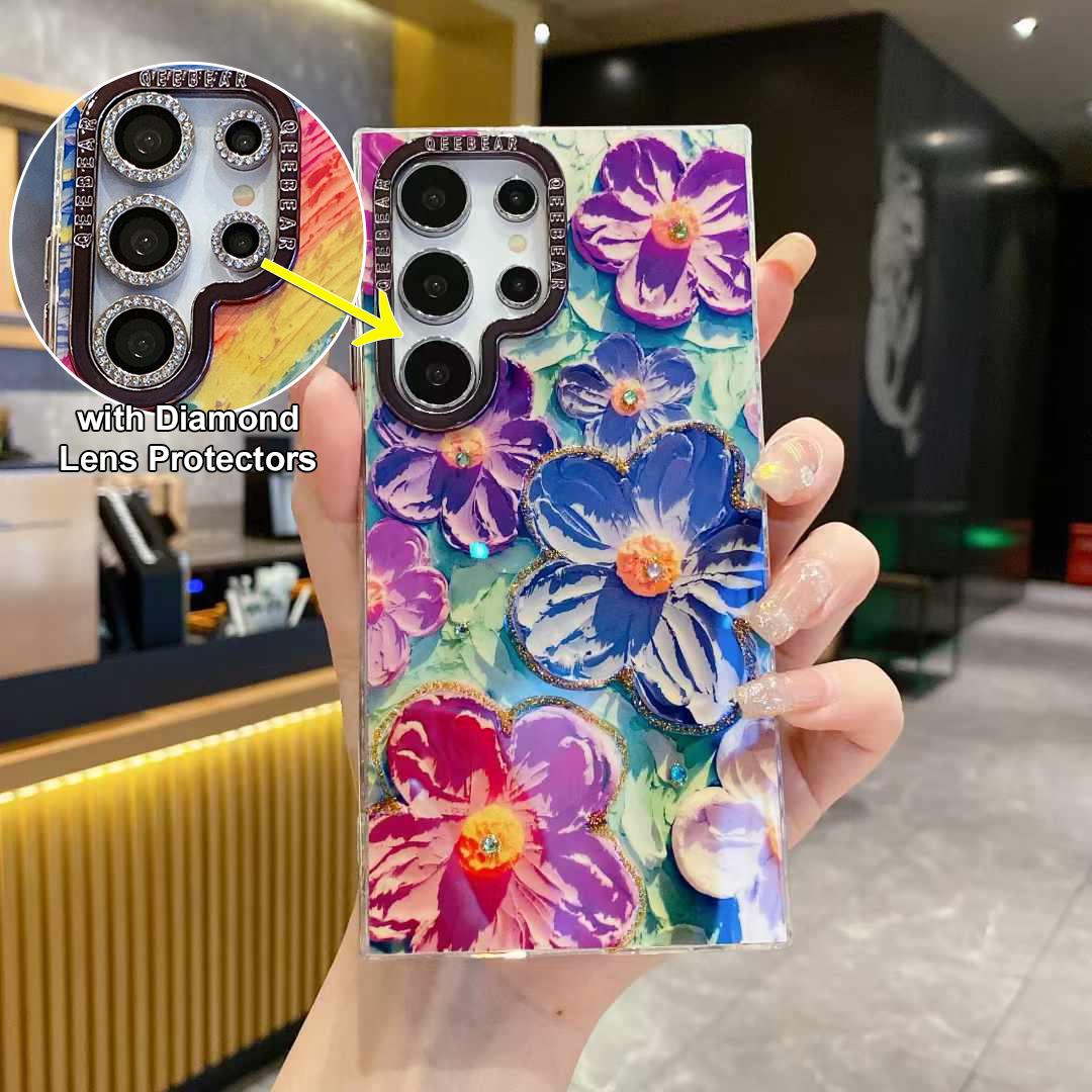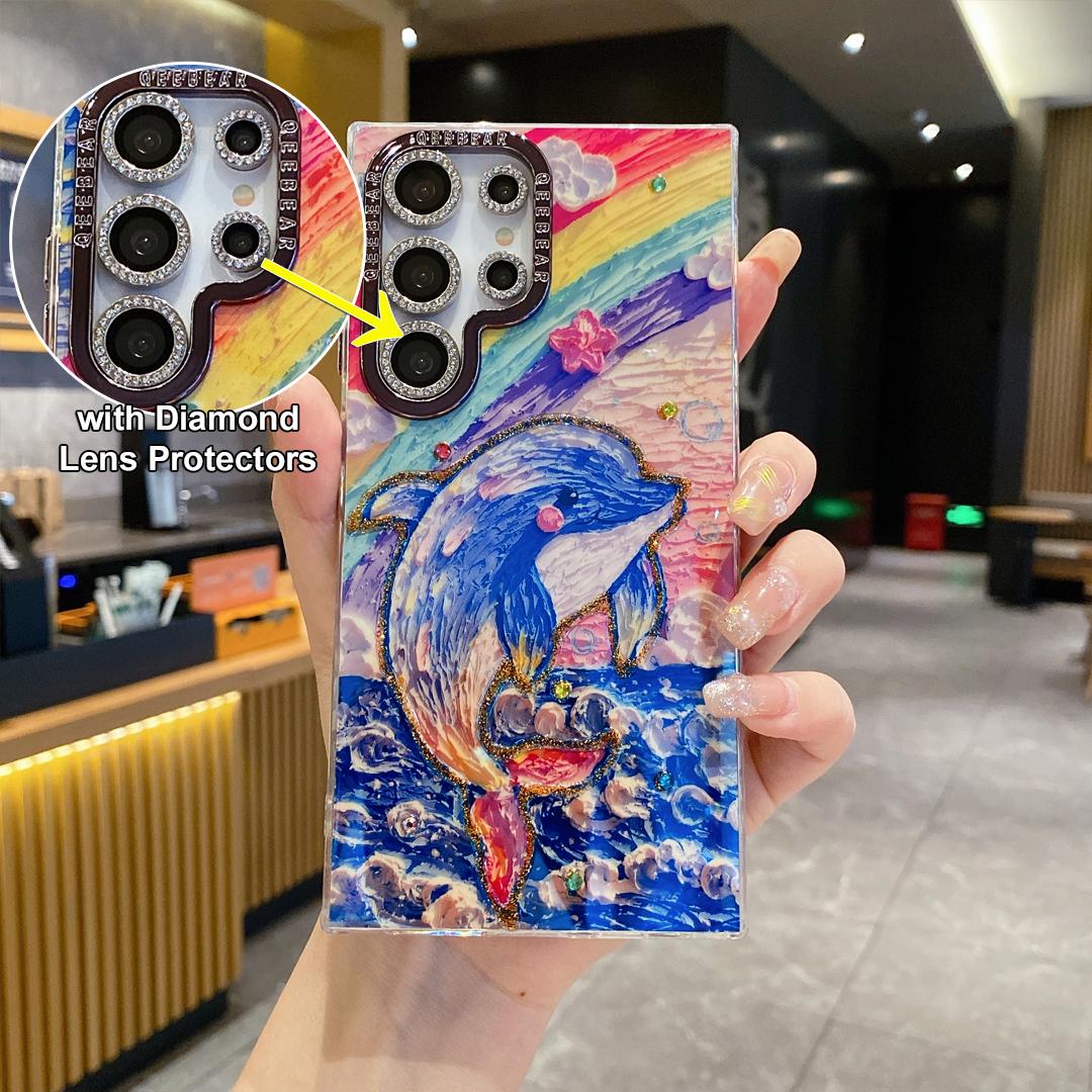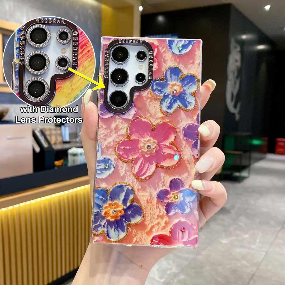 For Samsung S25 S24 S23 S22 Phone Case with Diamond Lens Protectors, Luxury Panda Leopard Rainbow Butterfly Elephant Oil Painting Metal Camera Frame Anti-drop Hard Shockproof Full Cover