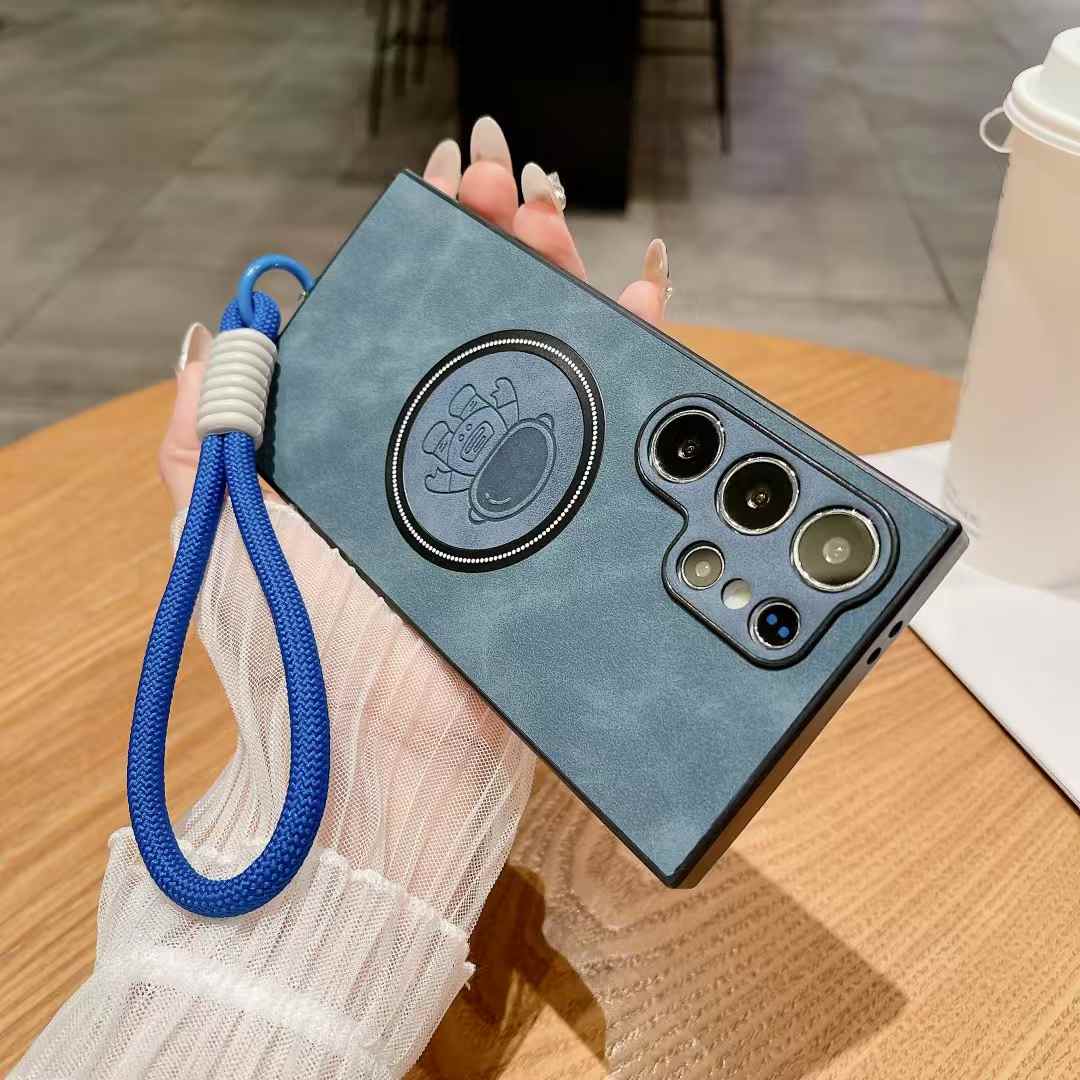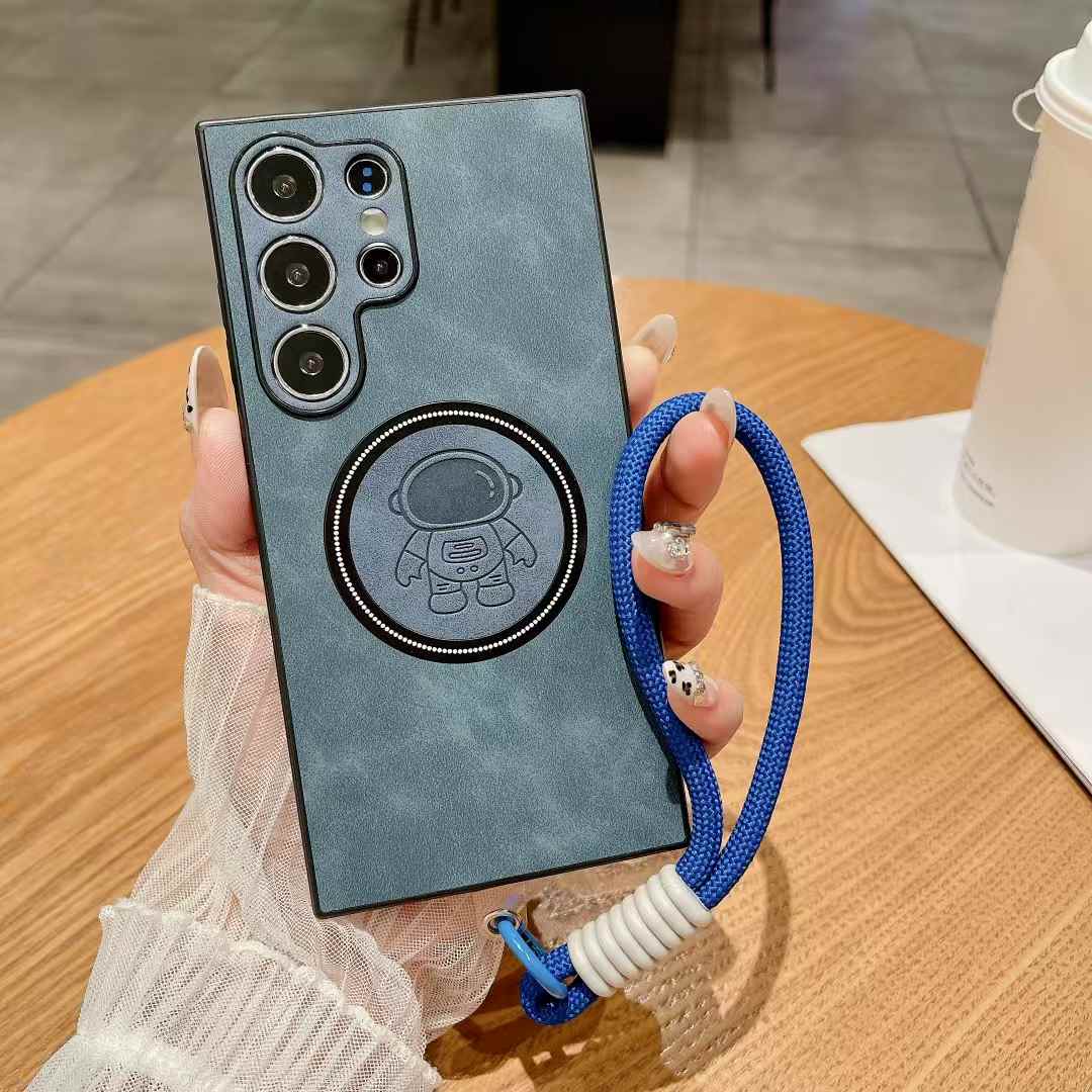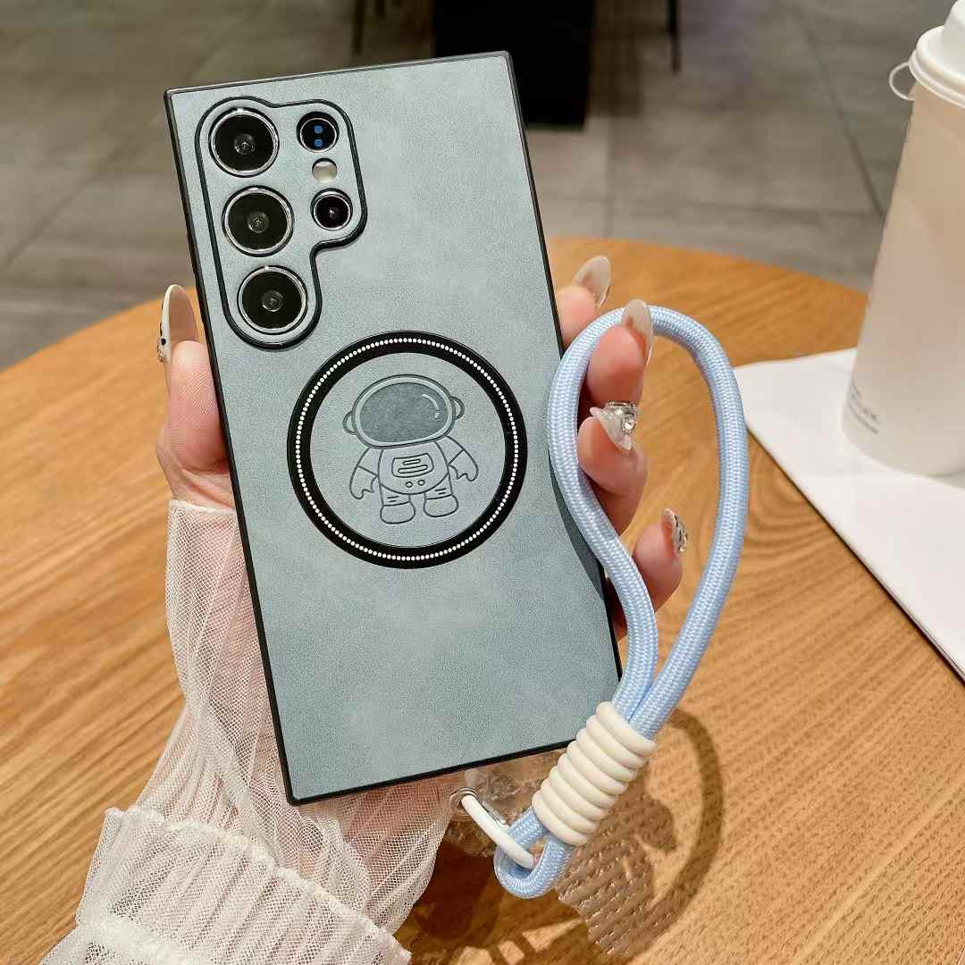 For Samsung S25Ultra S25Edge S24 S23 S22 S21 Note20 Case With Weave Wristband, Astronaut Pattern Matte Suede Leather Magnetic Shockproof Anti-Slip Hard Phone Case