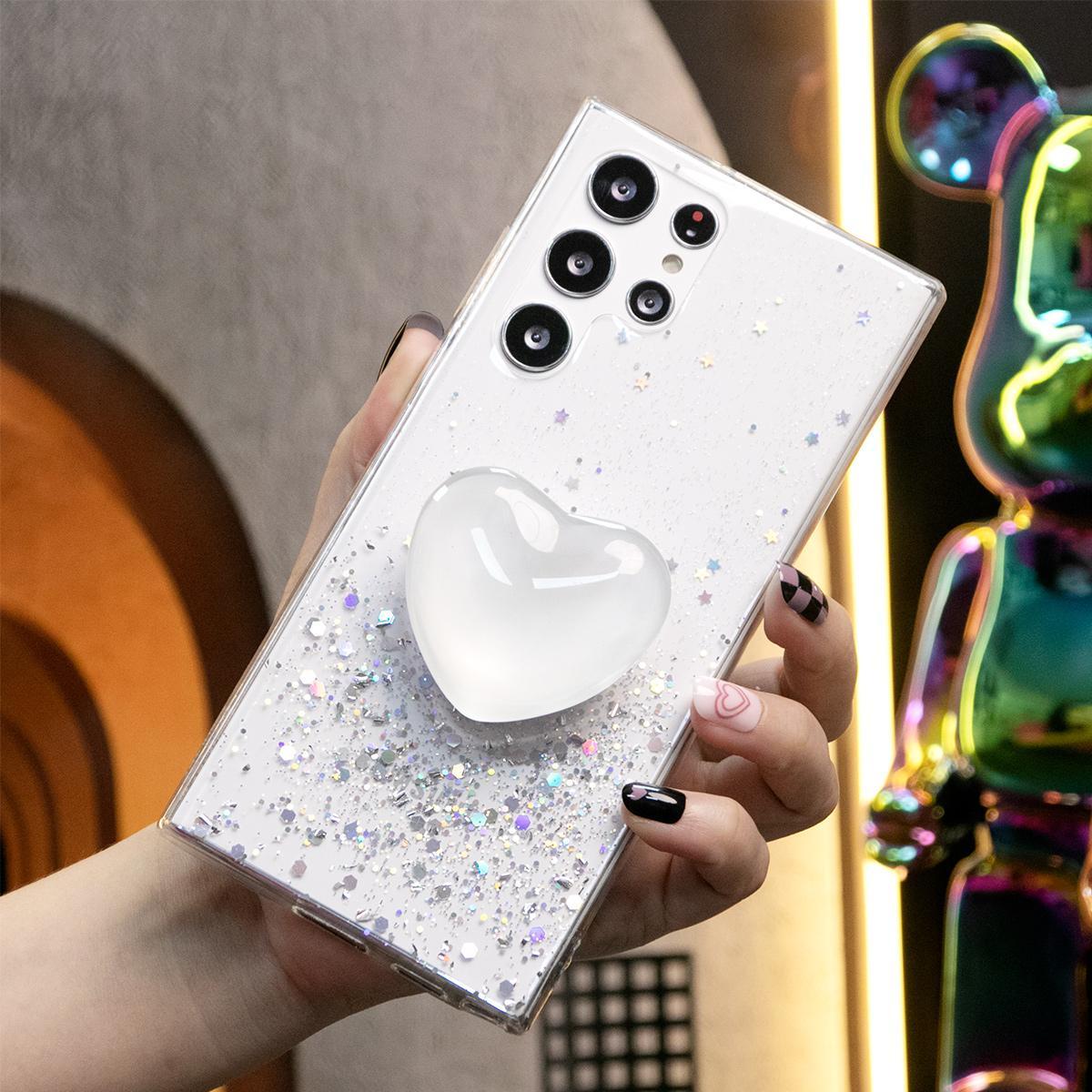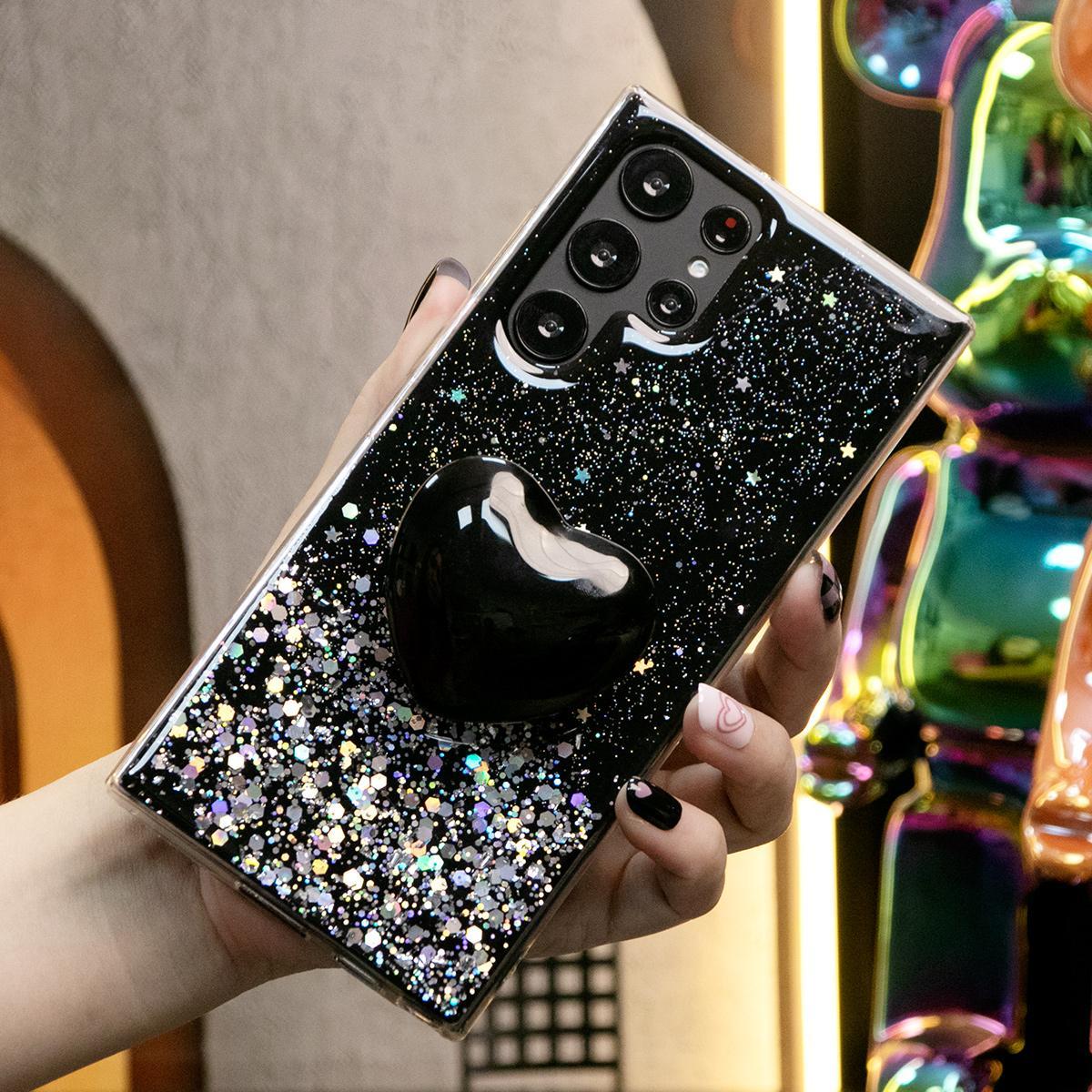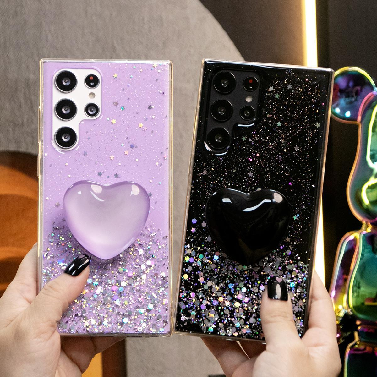 Glitter Star Sequin Crystal Love Heart Stand Phone Case For Samsung Galaxy S24Ultra S24FE S24 S23 S22 S21 FE Note20 Ultra A15 A25 A35 A55 Clear Soft TPU Back Cover