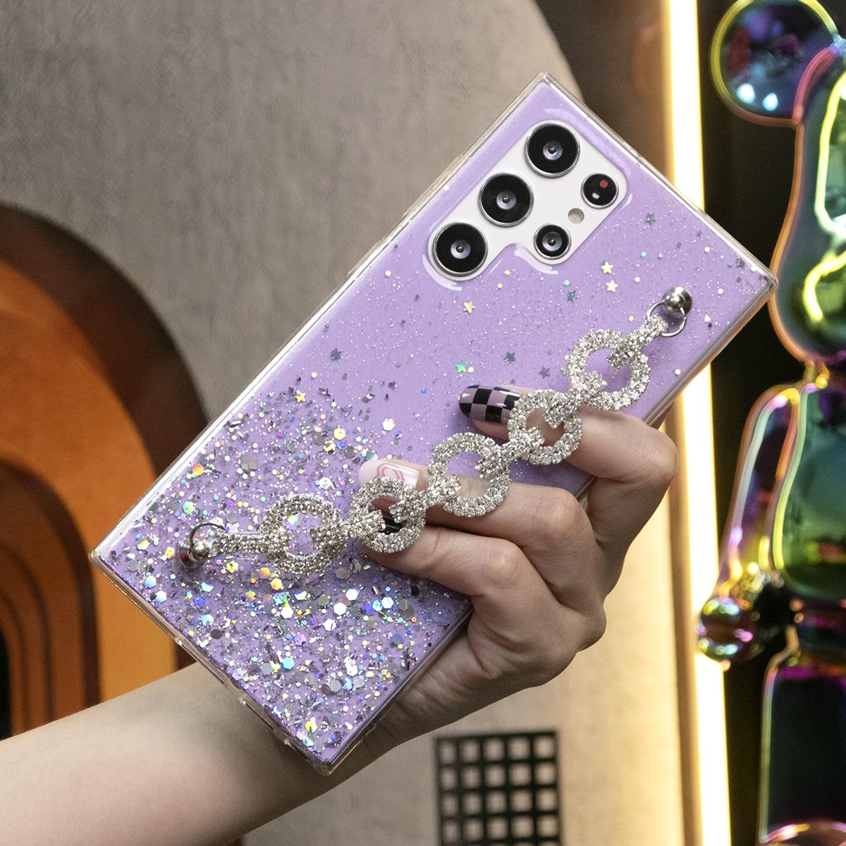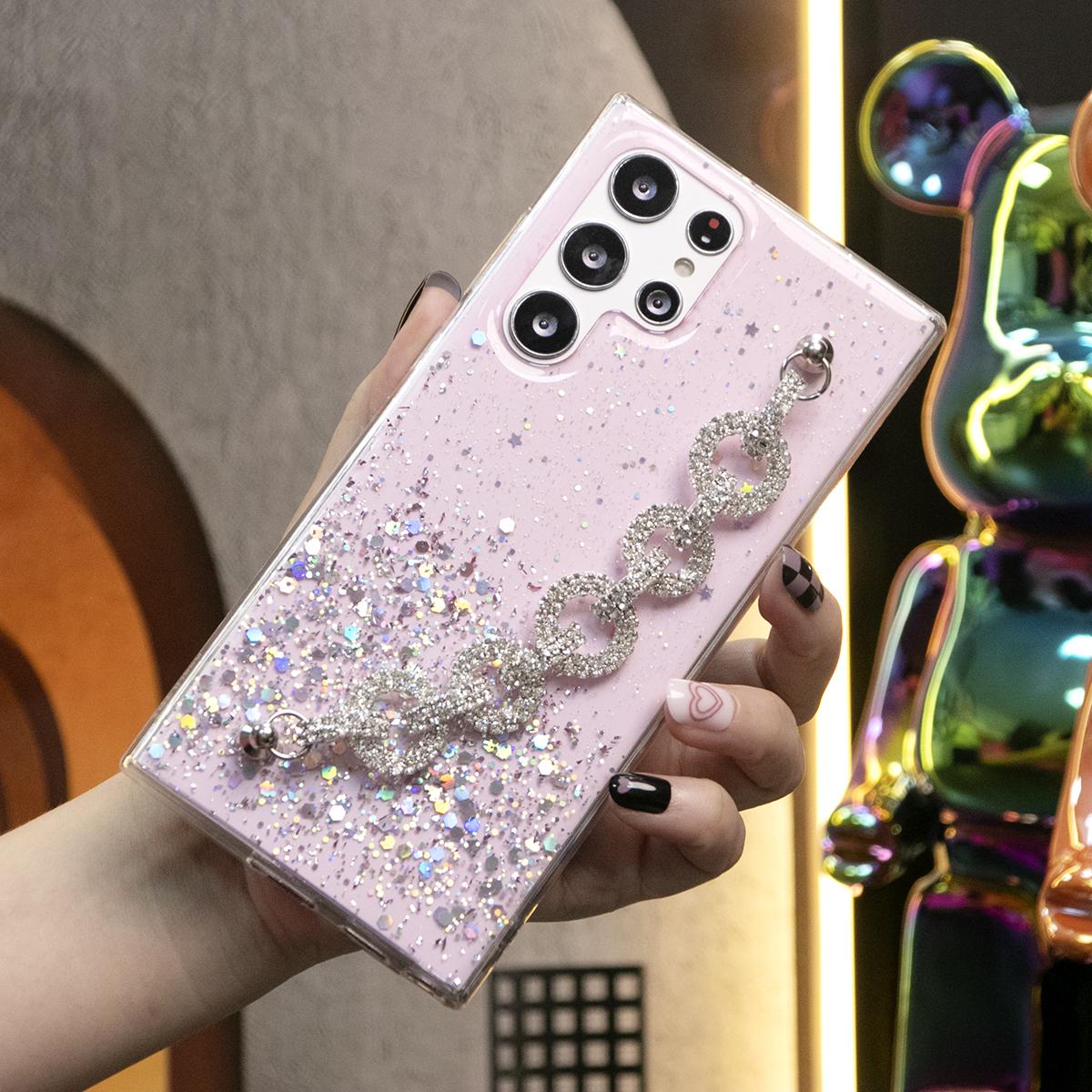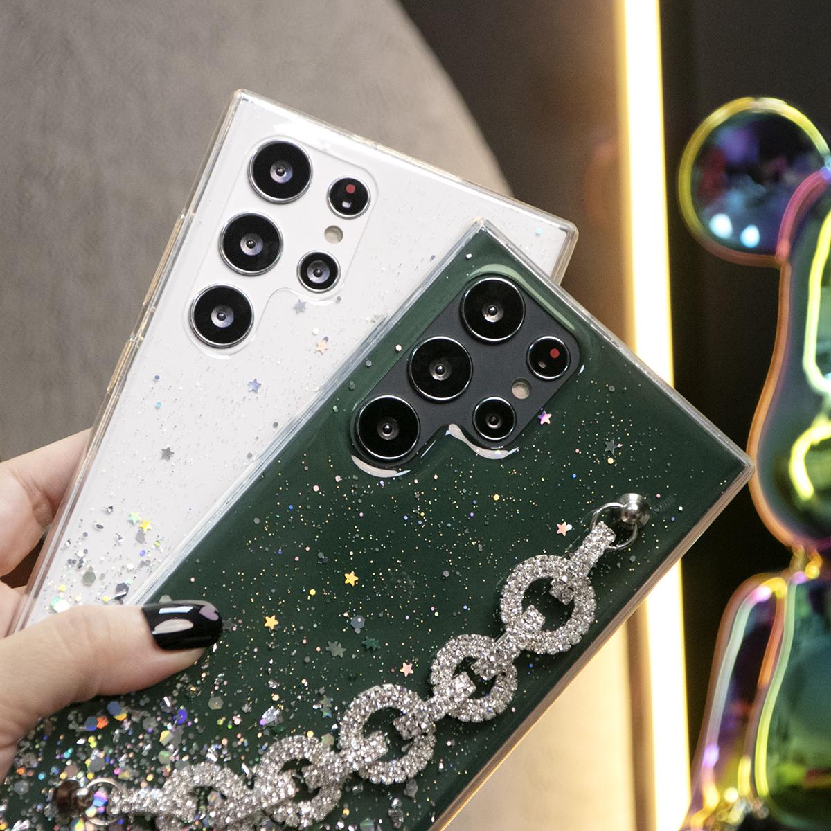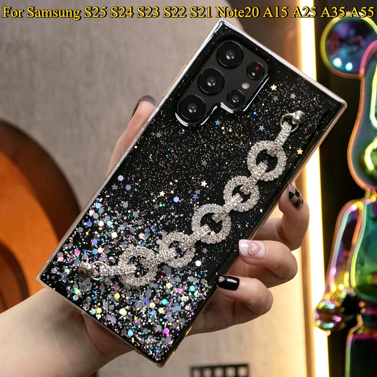 Glitter Star Sequin With Diamond Chain Phone Case For Samsung S25 S24 S23 S22 S21 Note20 A15 A25 A35 A55 Clear Soft TPU Back Cover