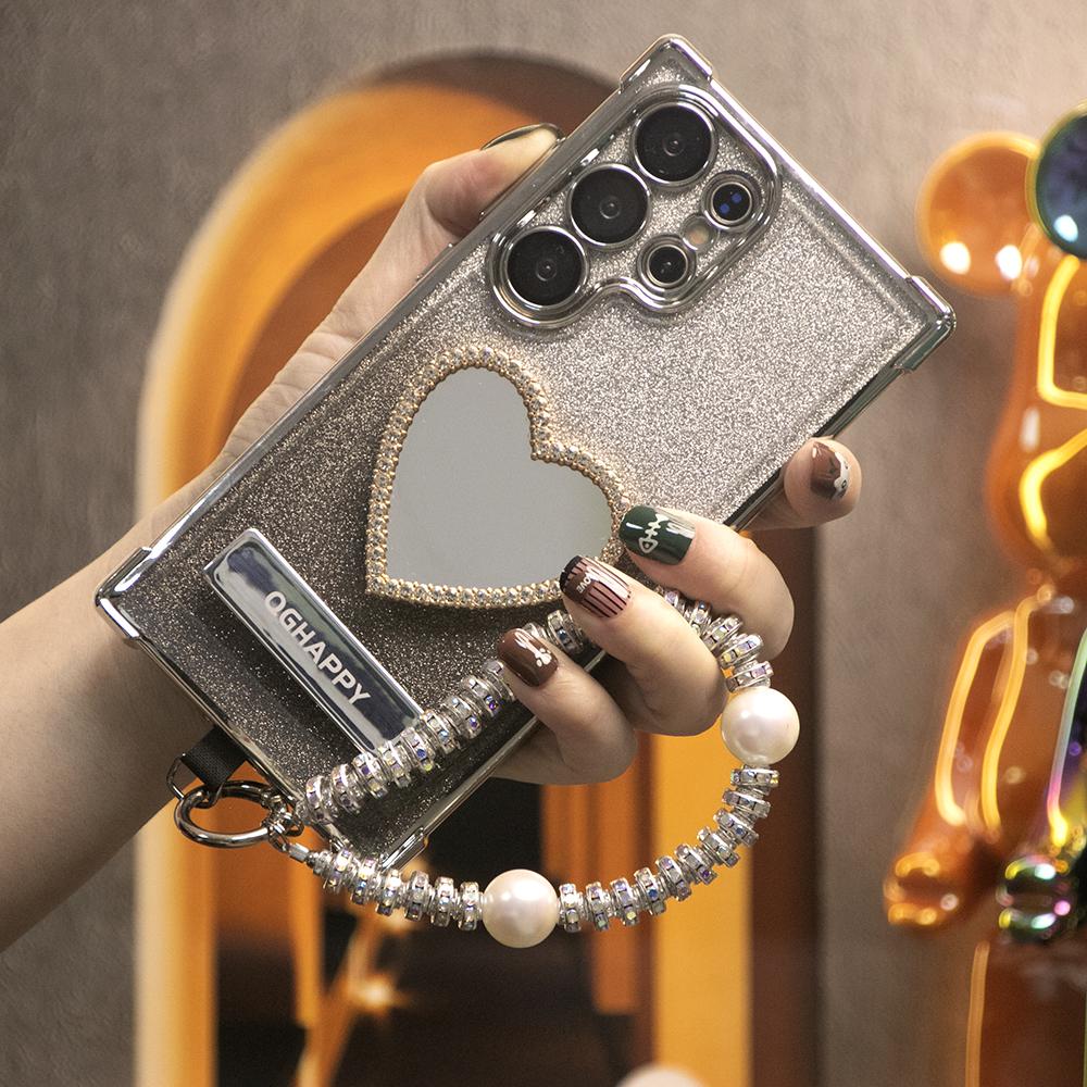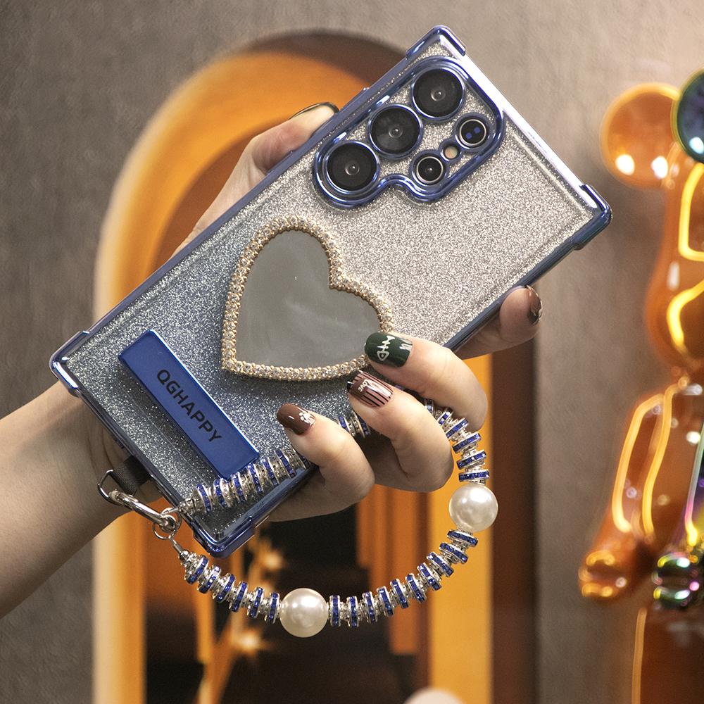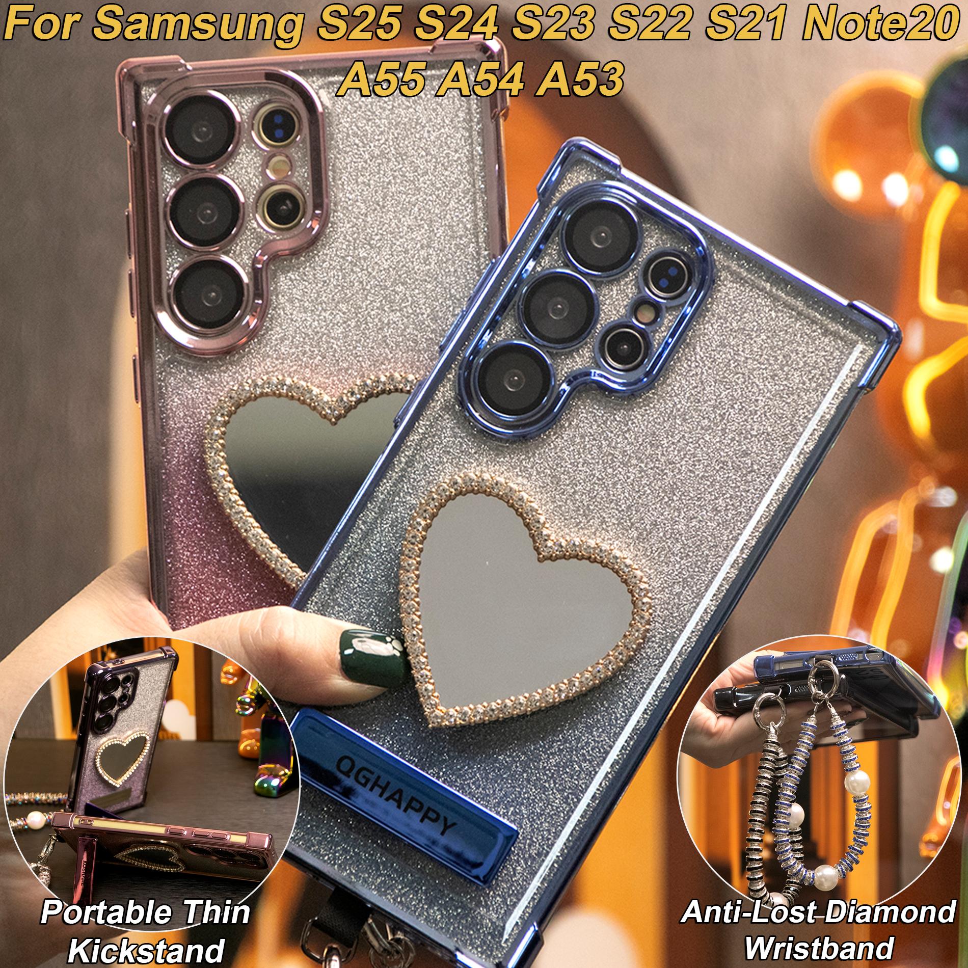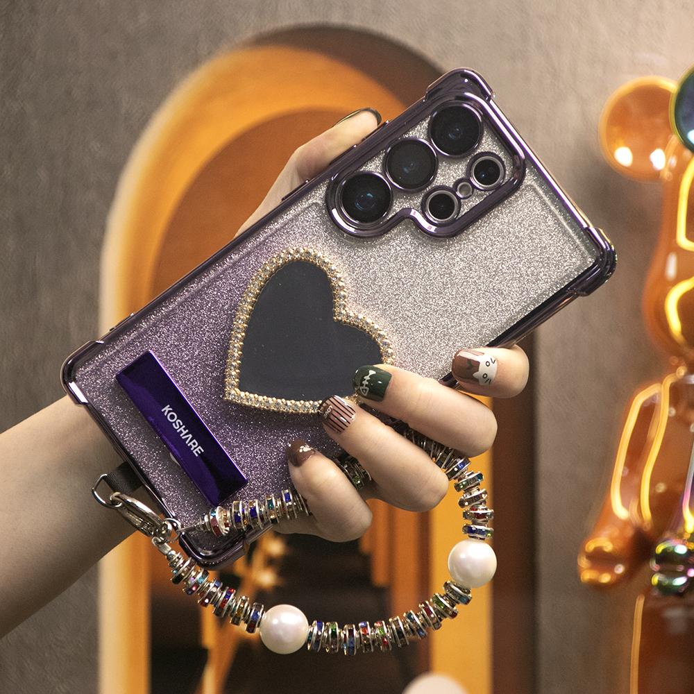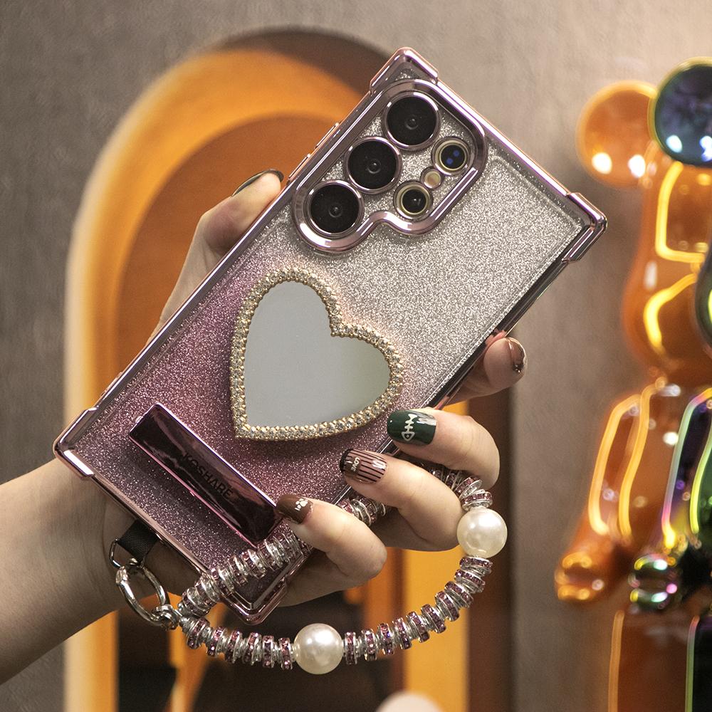Gradient Plating Four Corners Love Heart Mirror Thin Kickstand Case with Pearl Diamond Wristband for Samsung S25Ultra S25 S24 S23 S22 S21 Note20 A53 A54 A55 Hard Acrylic Bumper Full Cover