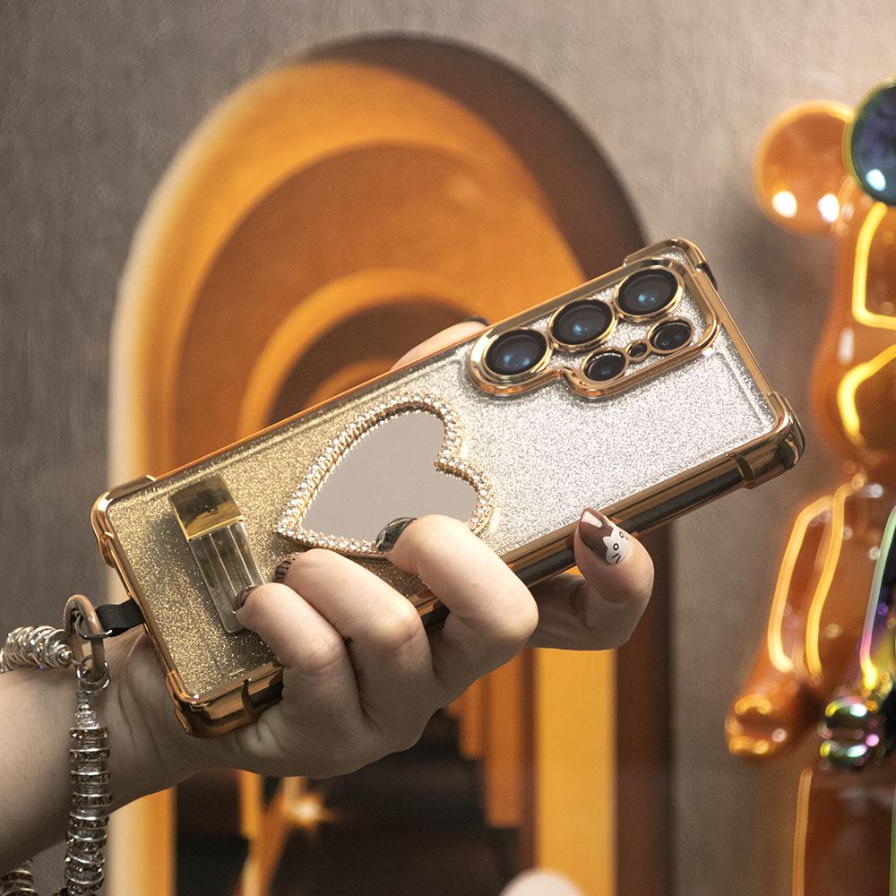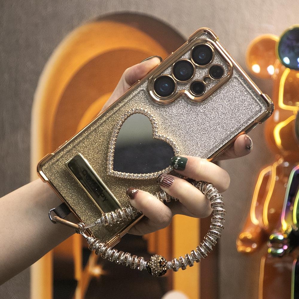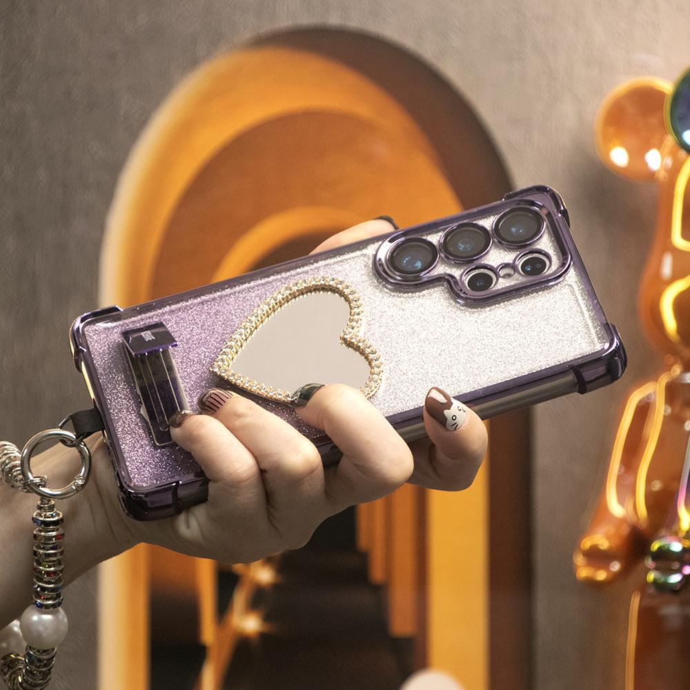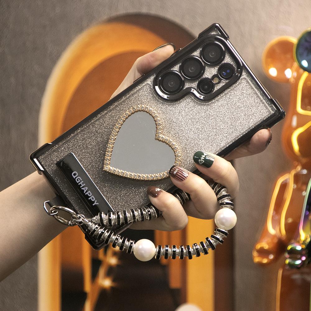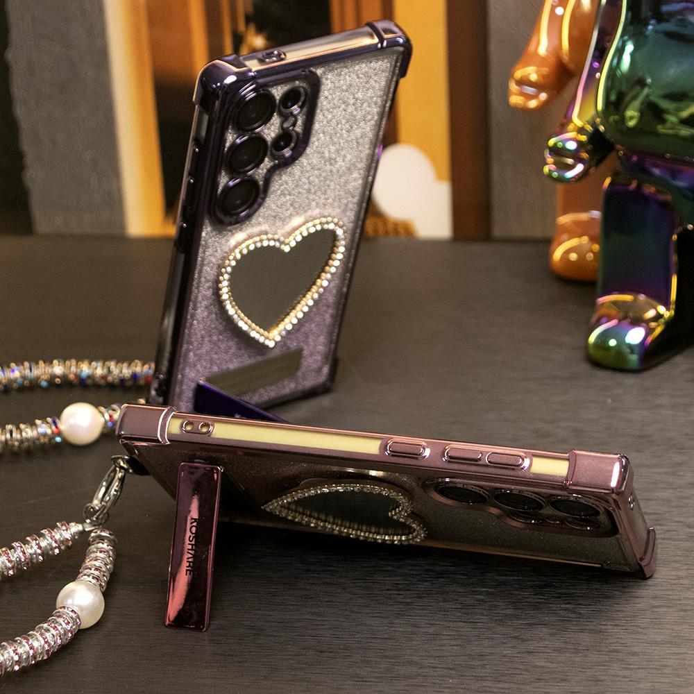 Gradient Plating Four Corners Love Heart Mirror Thin Kickstand Case with Pearl Diamond Wristband for Samsung S25Ultra S25 S24 S23 S22 S21 Note20 A53 A54 A55 Hard Acrylic Bumper Full Cover