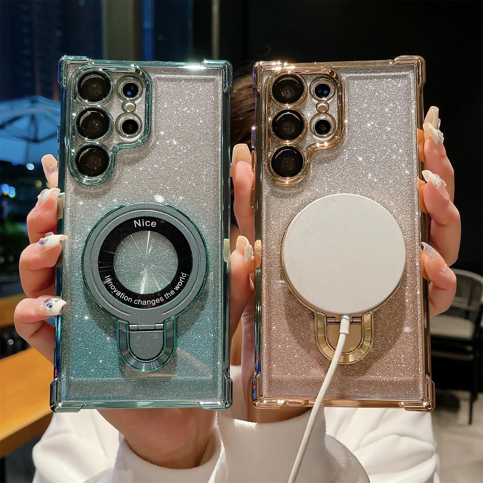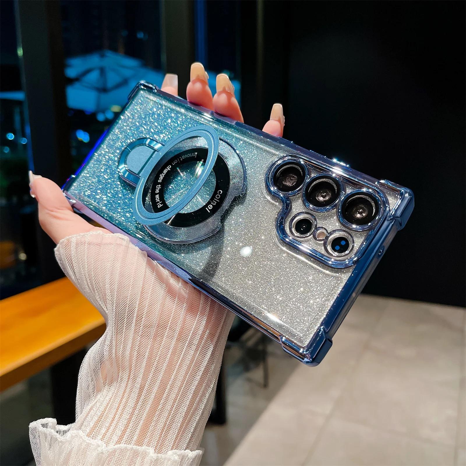 Gradient Plating Four Corners Shockproof Clear Kickstand Phone Case For Samsung S25 S24 S23 S22 S21 Note20 A55 A54 Transparent Hard Acrylic Hybrid Bumper Armor Cover