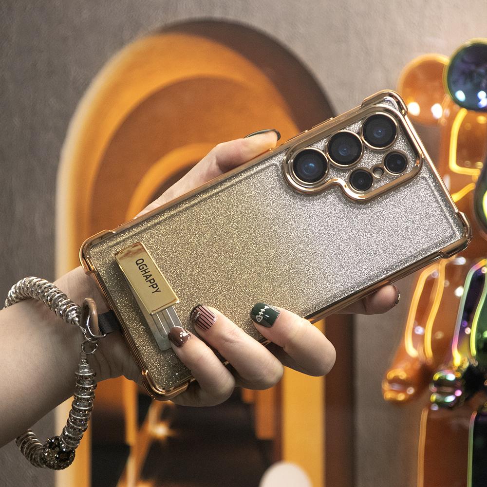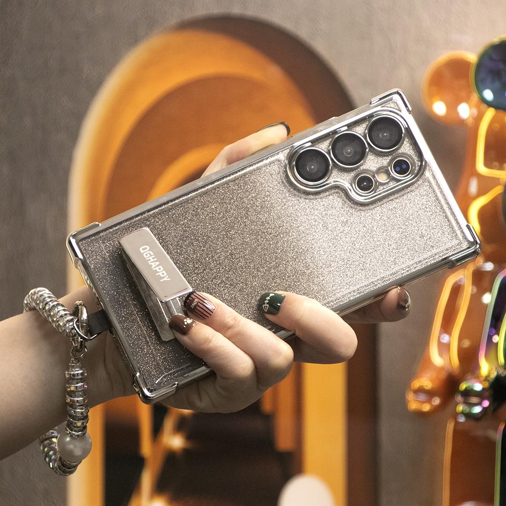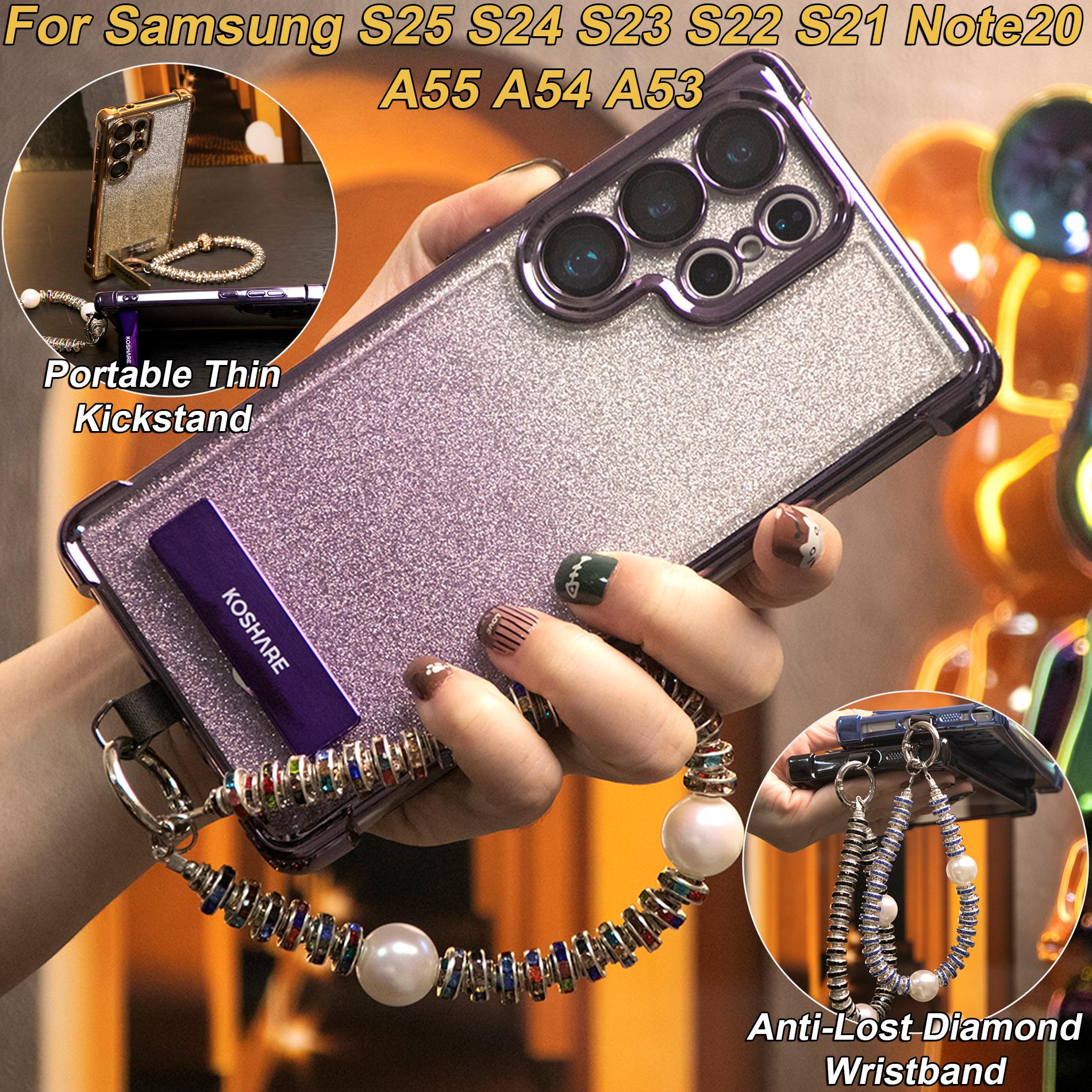 Gradient Plating Four Corners Thin Kickstand Case with Pearl Diamond Wristband for Samsung S25Ultra S25 S24 S23 S22 S21 Note20 A53 A54 A55 Hard Acrylic Bumper Full Cover