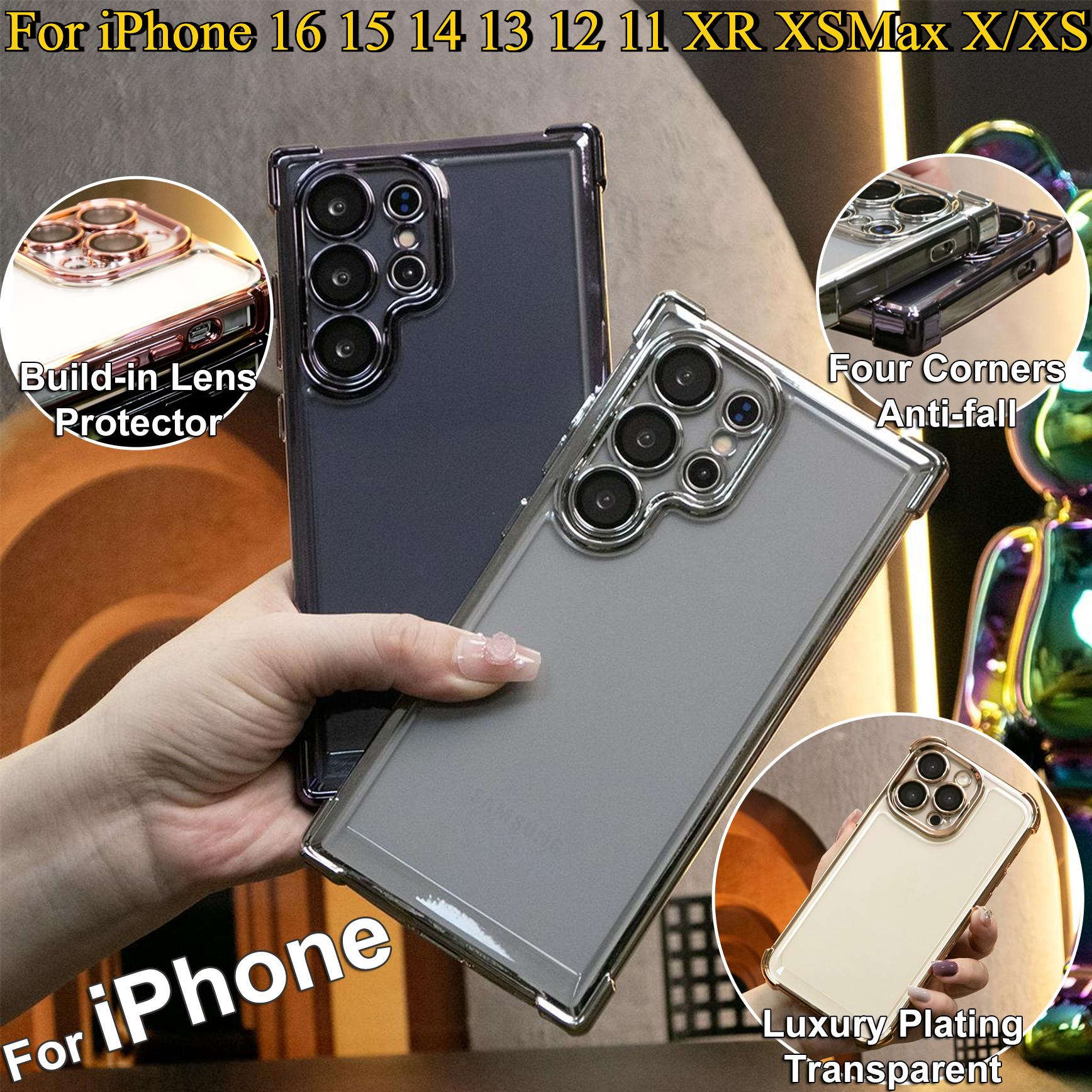 Luxury Plating Four Corners Shockproof Clear Case For iPhone 16 15 14 13 12 11 XR XSMax X/XS Transparent Built-in Camera Protector Hard Acrylic Bumper Armor Full Cover