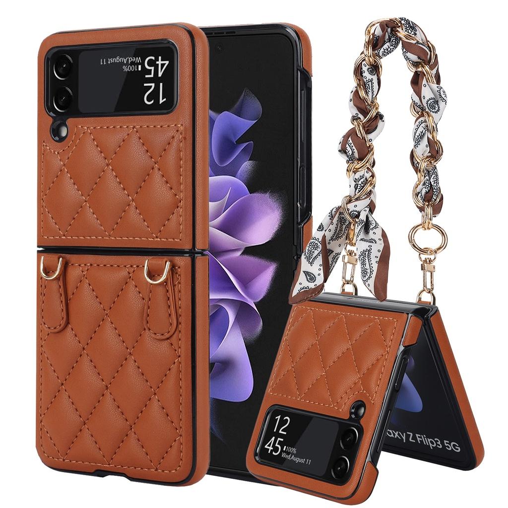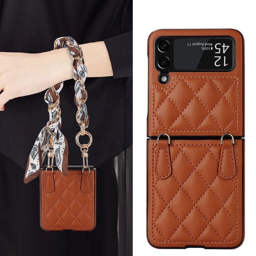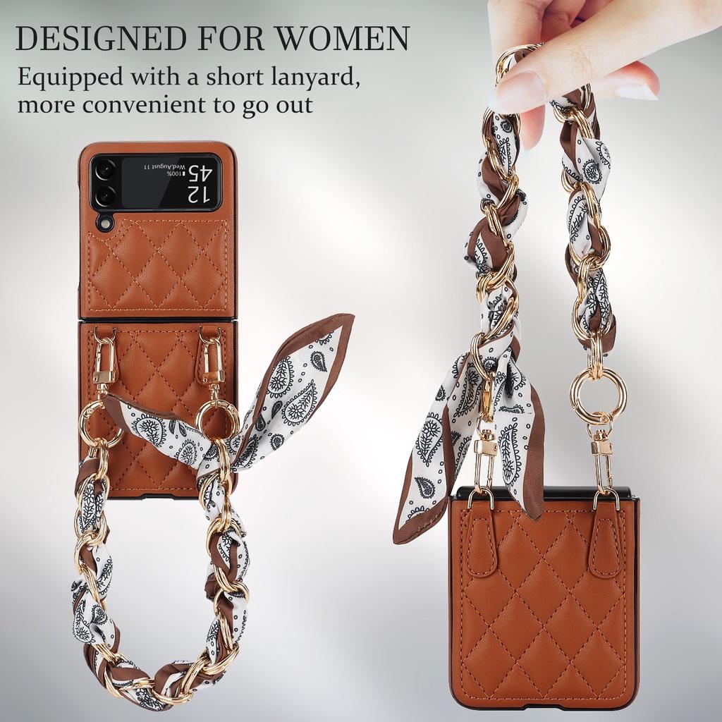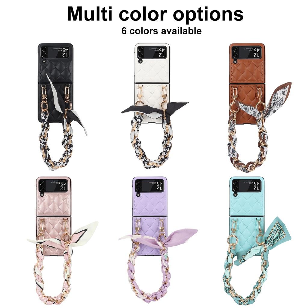 Luxury Silk Scarf Chian Leather Case For Samsung Galaxy Z Flip 6 Flip 5 Flip 4 Flip3 5G Luxury Crossbody Strap Smart Phone Cover