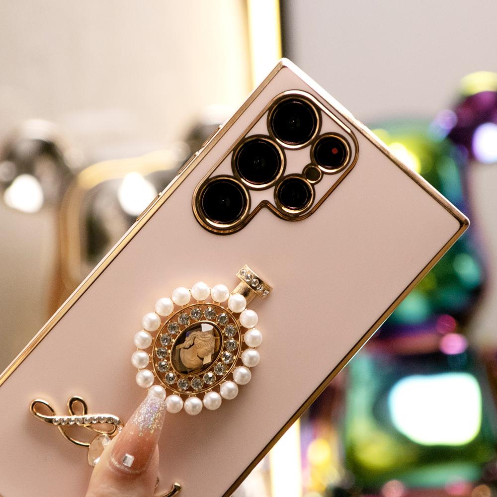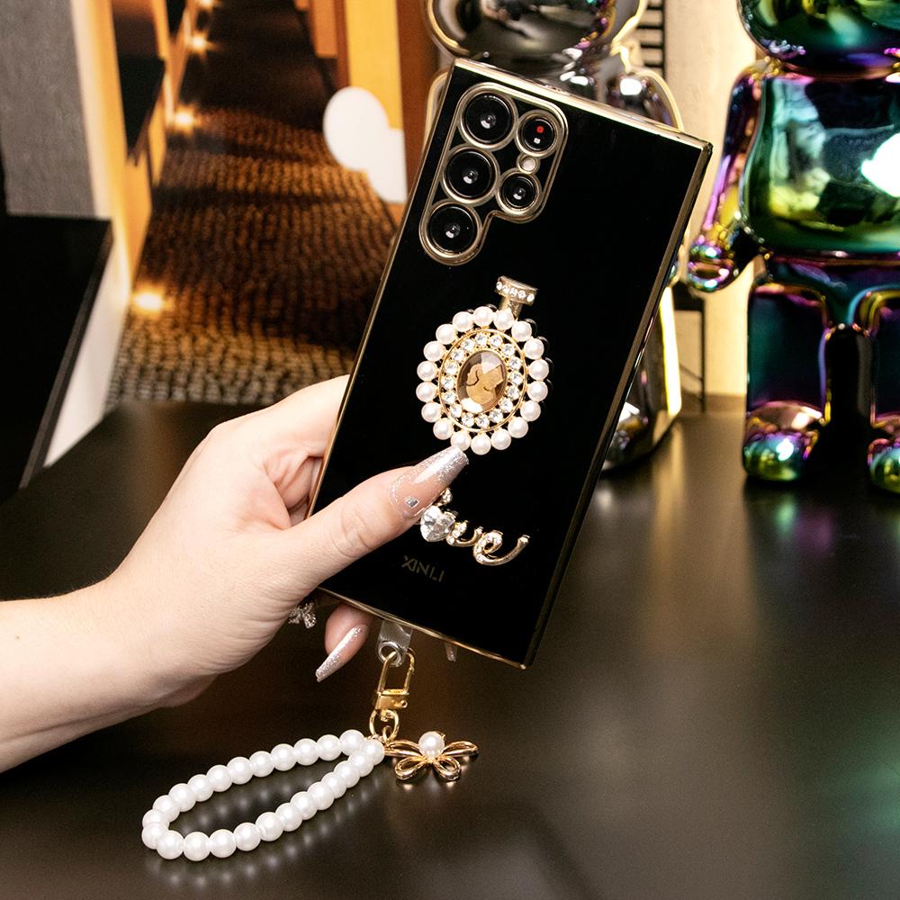 Pearl Perfume Bottle Plus Pearl Chain Plating Phone Case For Samsung S24Ultra S24FE S23 S22 S21 FE Plus Ultra Note 20