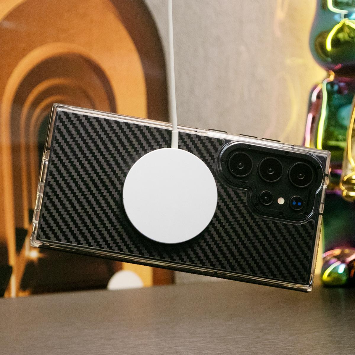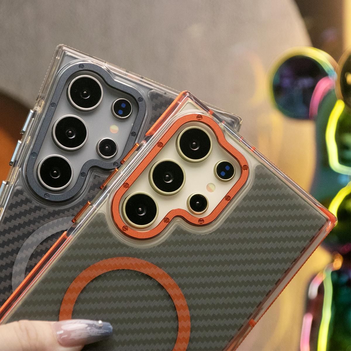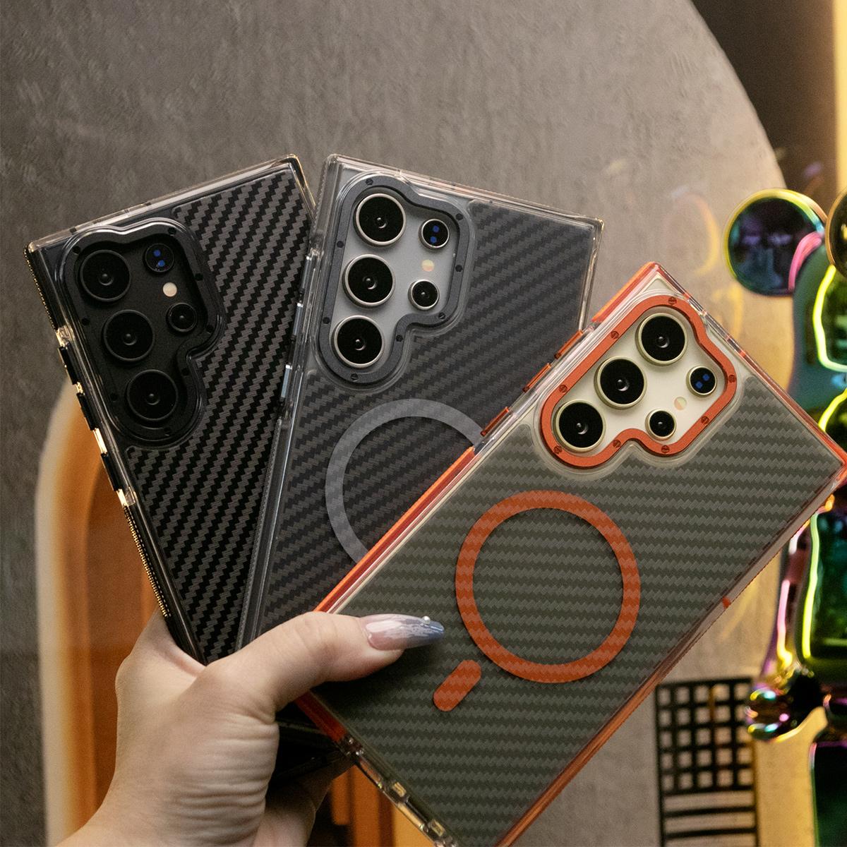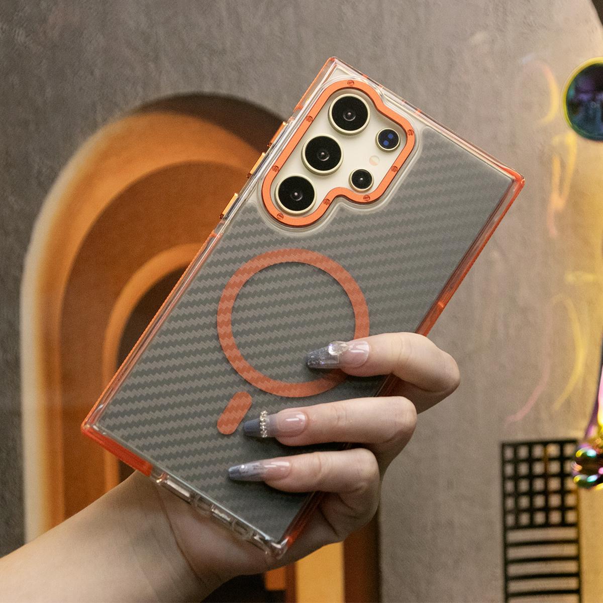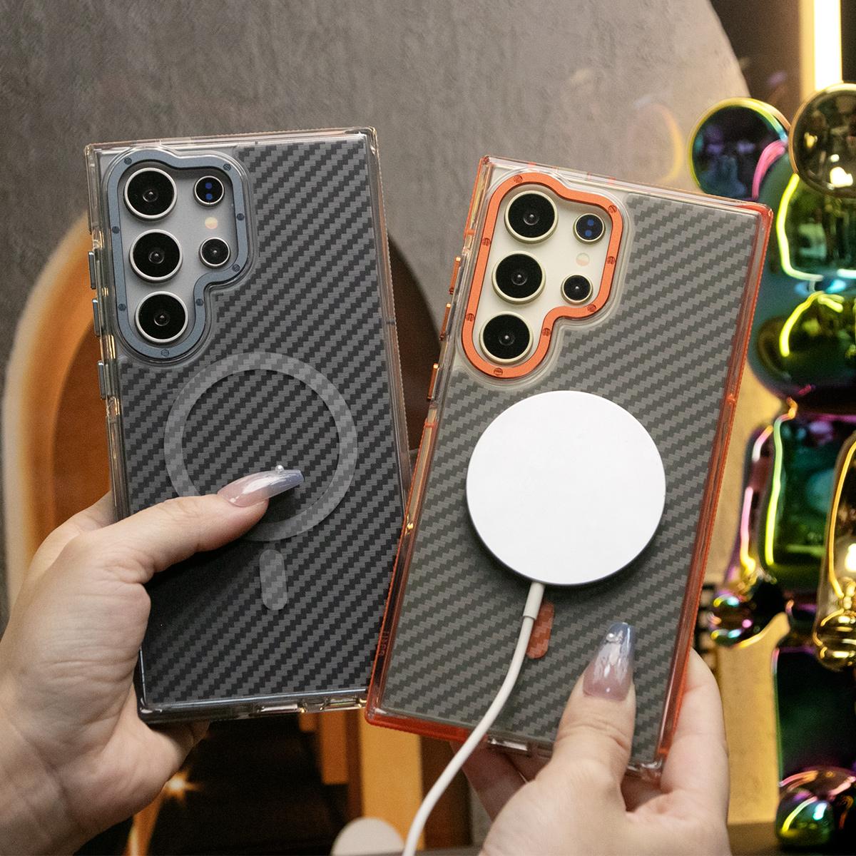 Strong Magnetic Carbon Fiber Phone Case,Metal Hardware Camera Protective Acrylic,Clear No Yellow,With Shockproof Anti-Fall Bumper For Samsung S24 S23 S21FE A14 A15 A24 A25 A35 A54 A55 A05