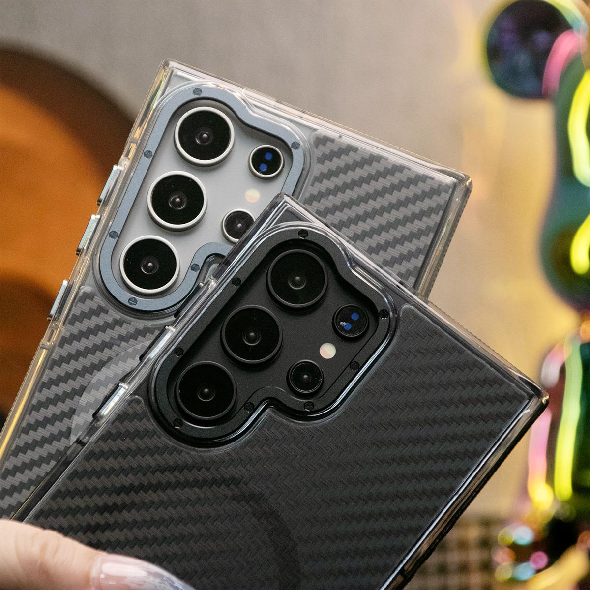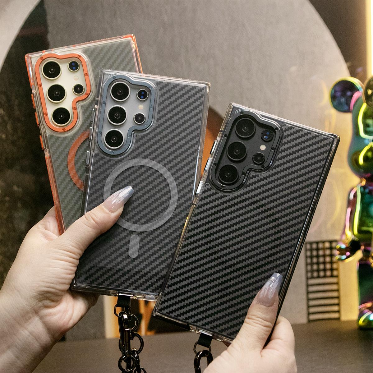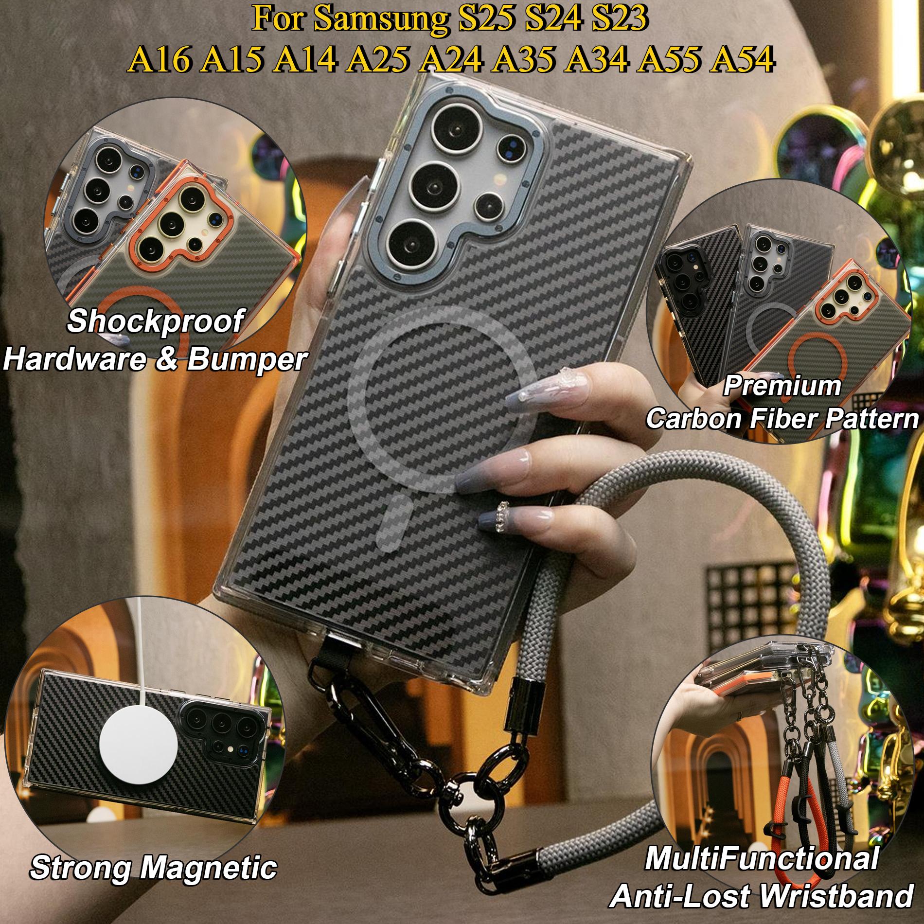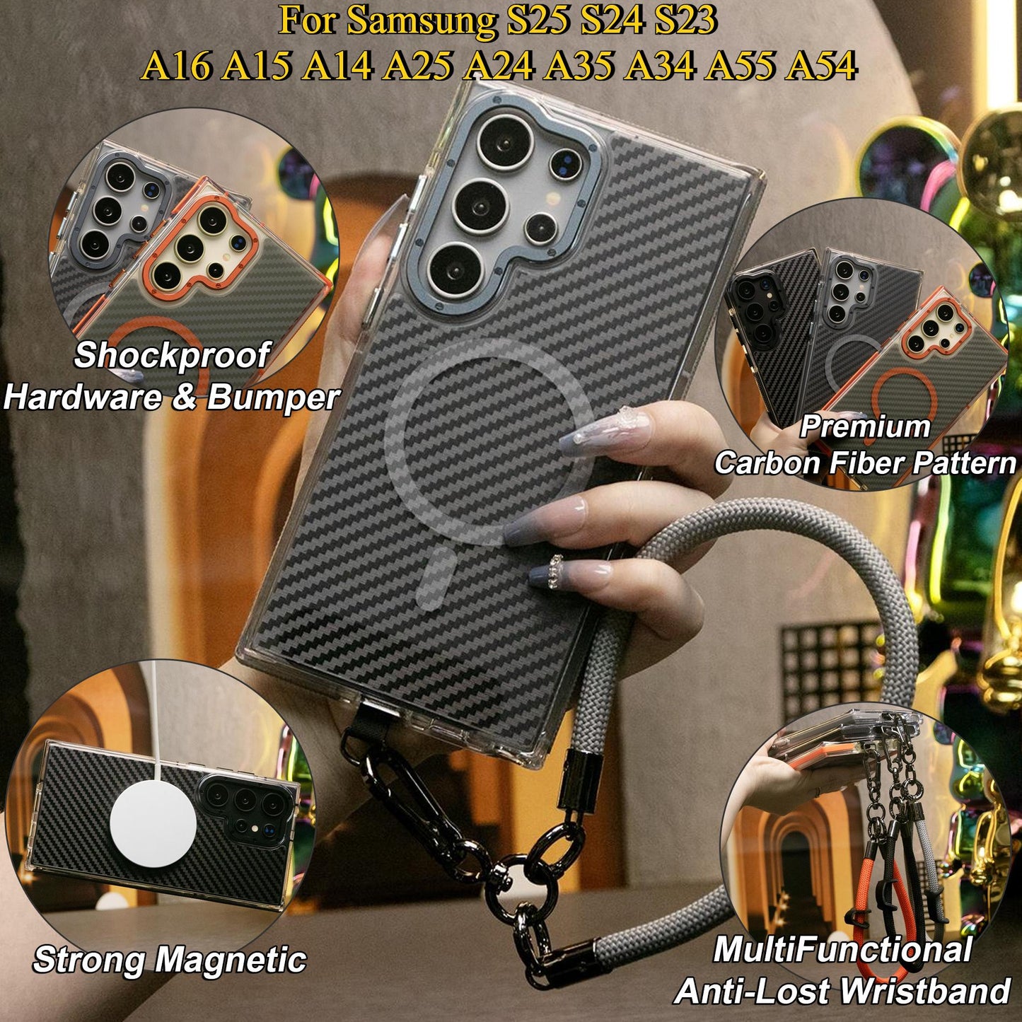 Strong Magnetic Carbon Fiber Phone Case, With MultiFunctional Wristband, Metal Hardware Acrylic, Shockproof Anti-Fall Bumper For Samsung S25Ultra S25 S24 S23 S21FE A14 A15 A24 A25 A35 A54 A55 A05