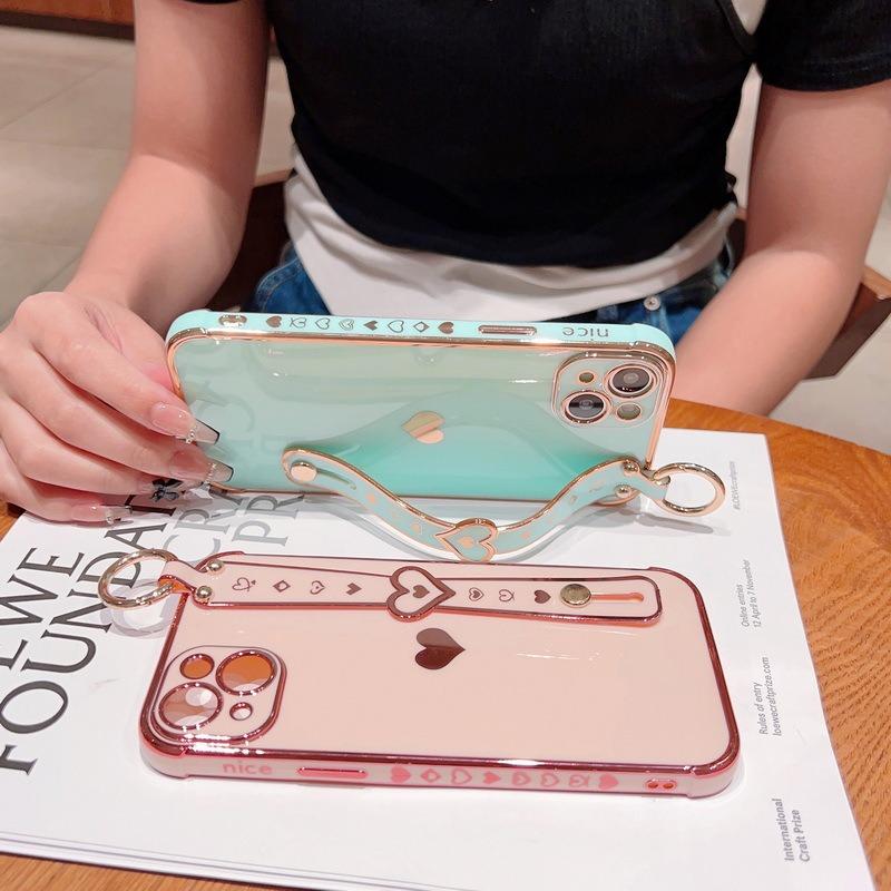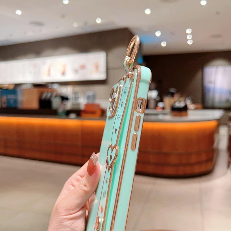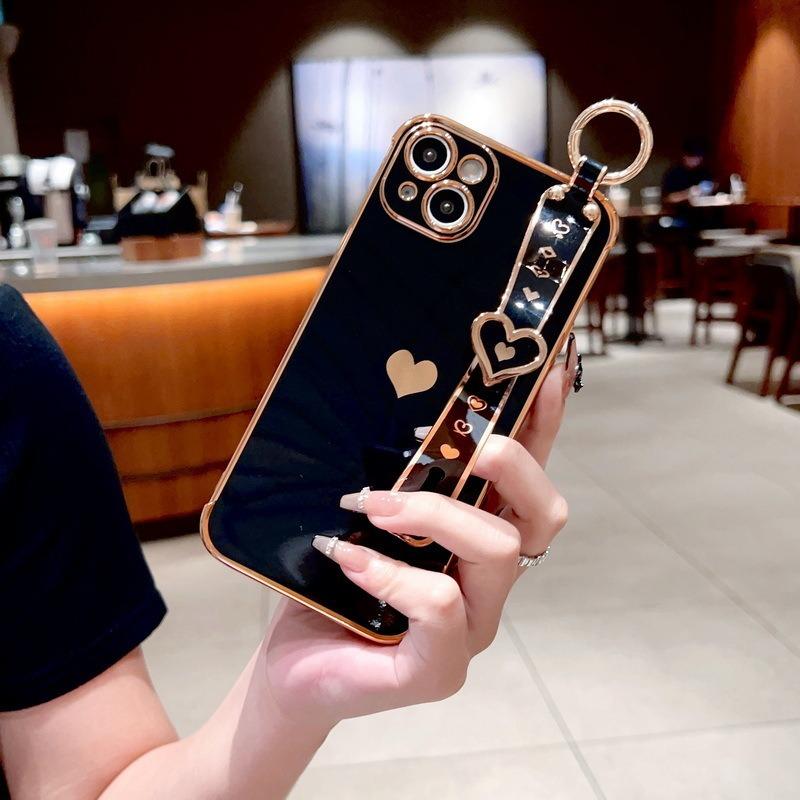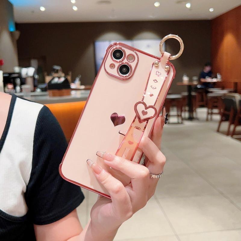 Plating Love Heart TPU Phone Case with Wristband For iPhone 16ProMax 15 14 13 12 Shockproof Soft Full Cover