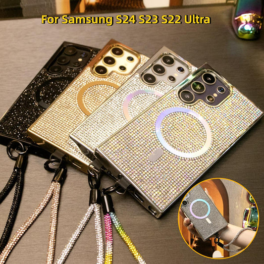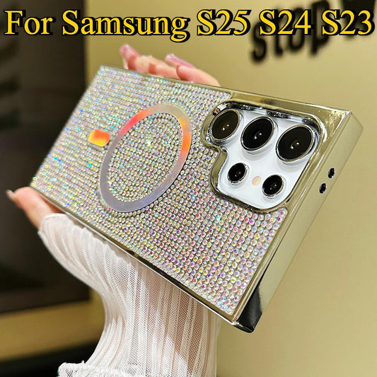 Luxury Glitter Rhinestone Plating Diamonds Magnetic Wireless Charging Phone Case For Samsung S25 S24 S23 Shockproof Protection Soft Bumper Cover