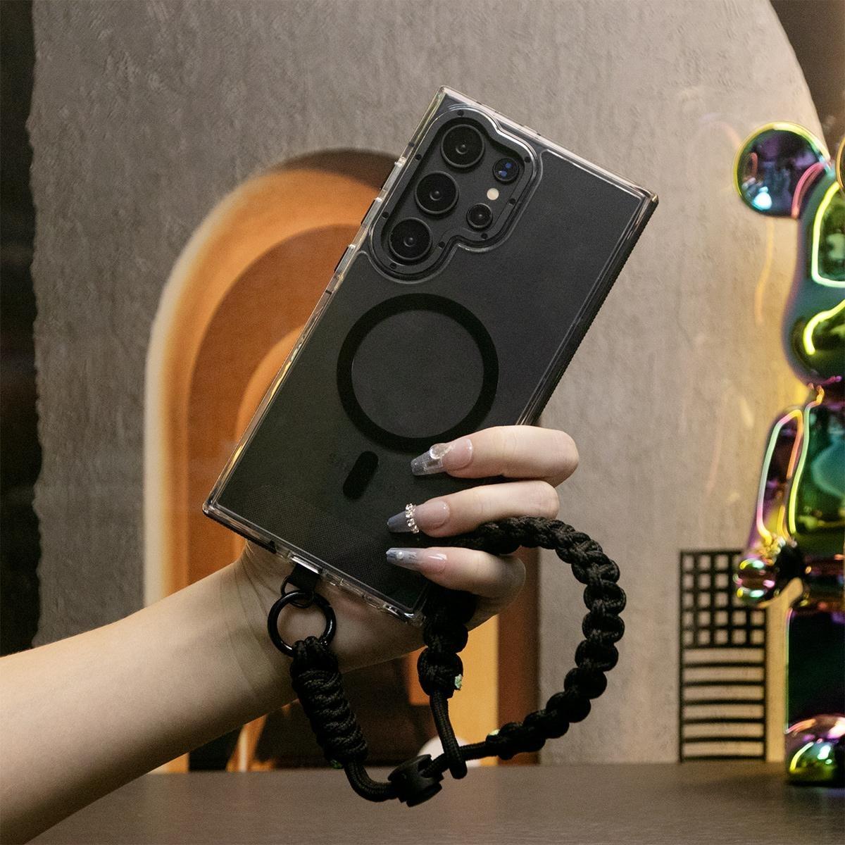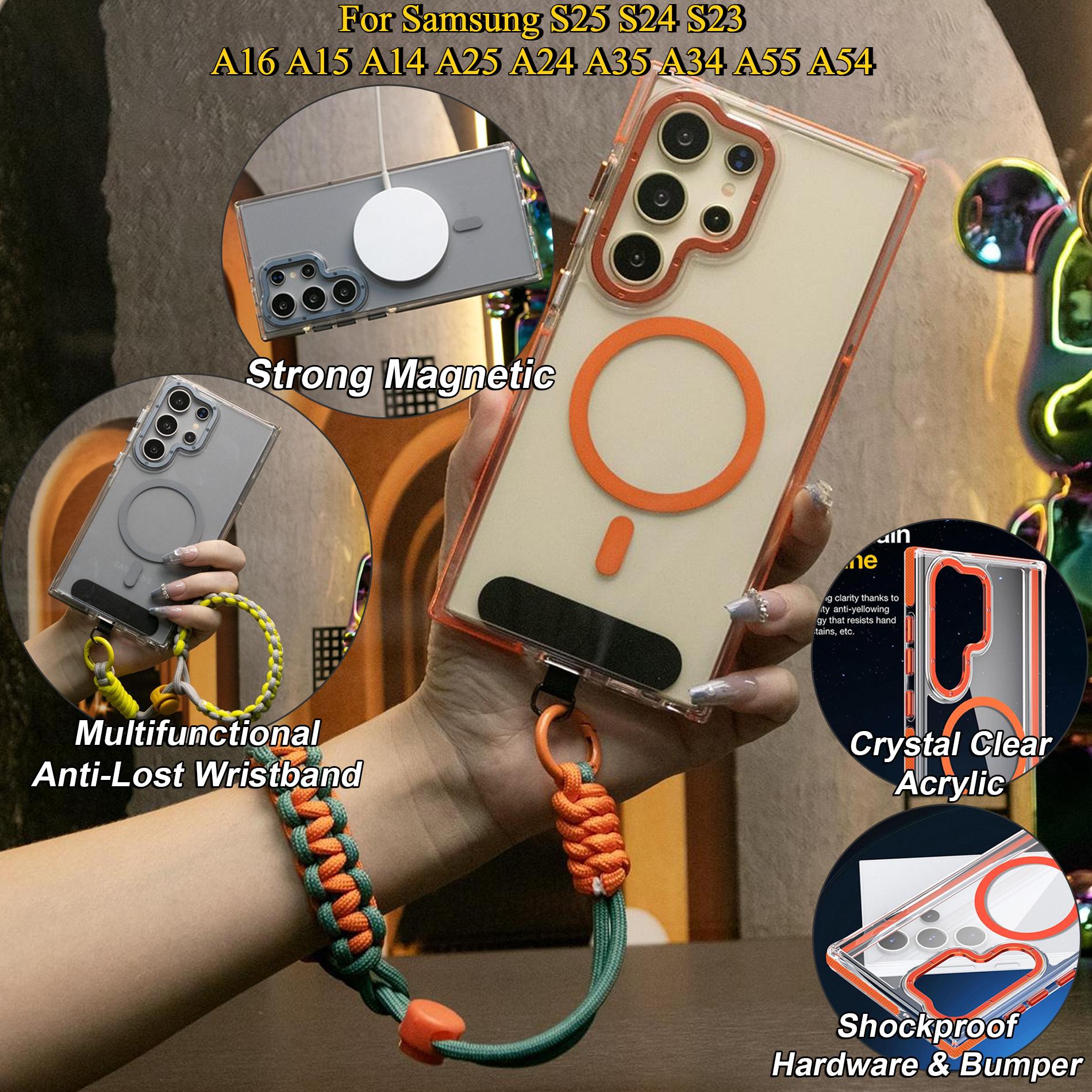 Clear Dual Color Strong Magnetic Wireless Charging Case For Samsung S25Ultra S24+ S23FE A14 A15 A16 A24 A25 A34 A35 A54 A55 Metal Camera Frame Bumper Acrylic Hard Cover with Adjustable Wristband
