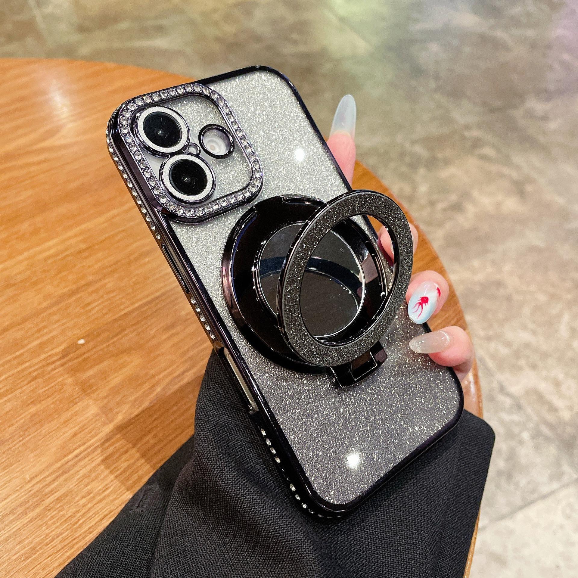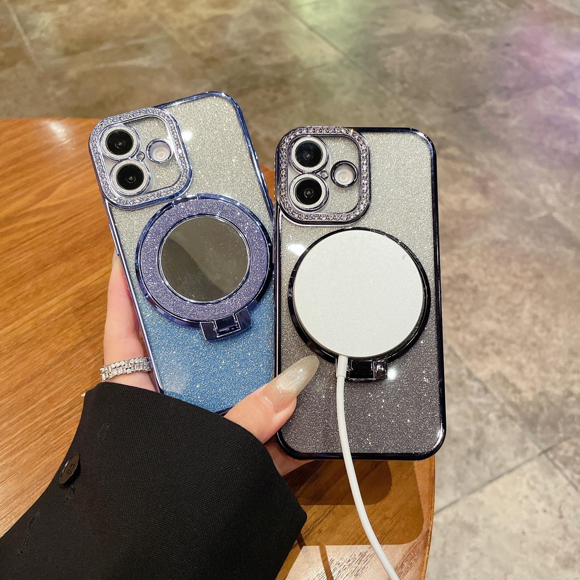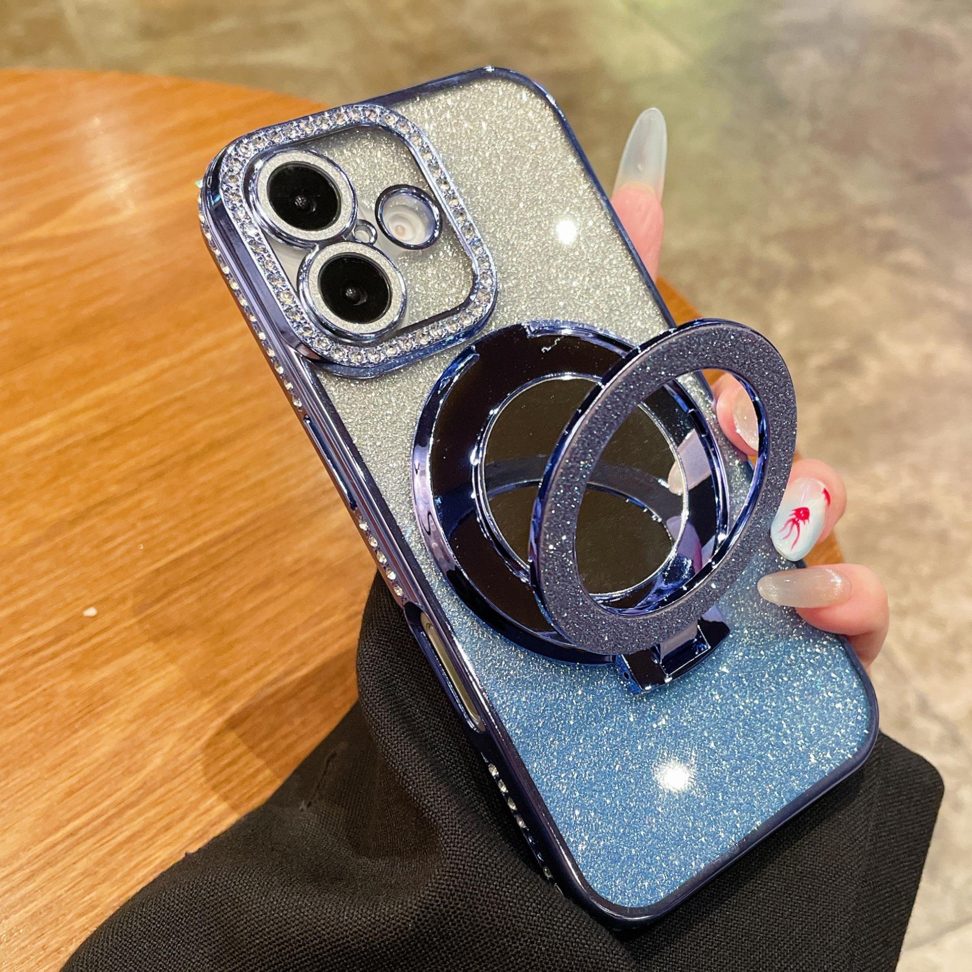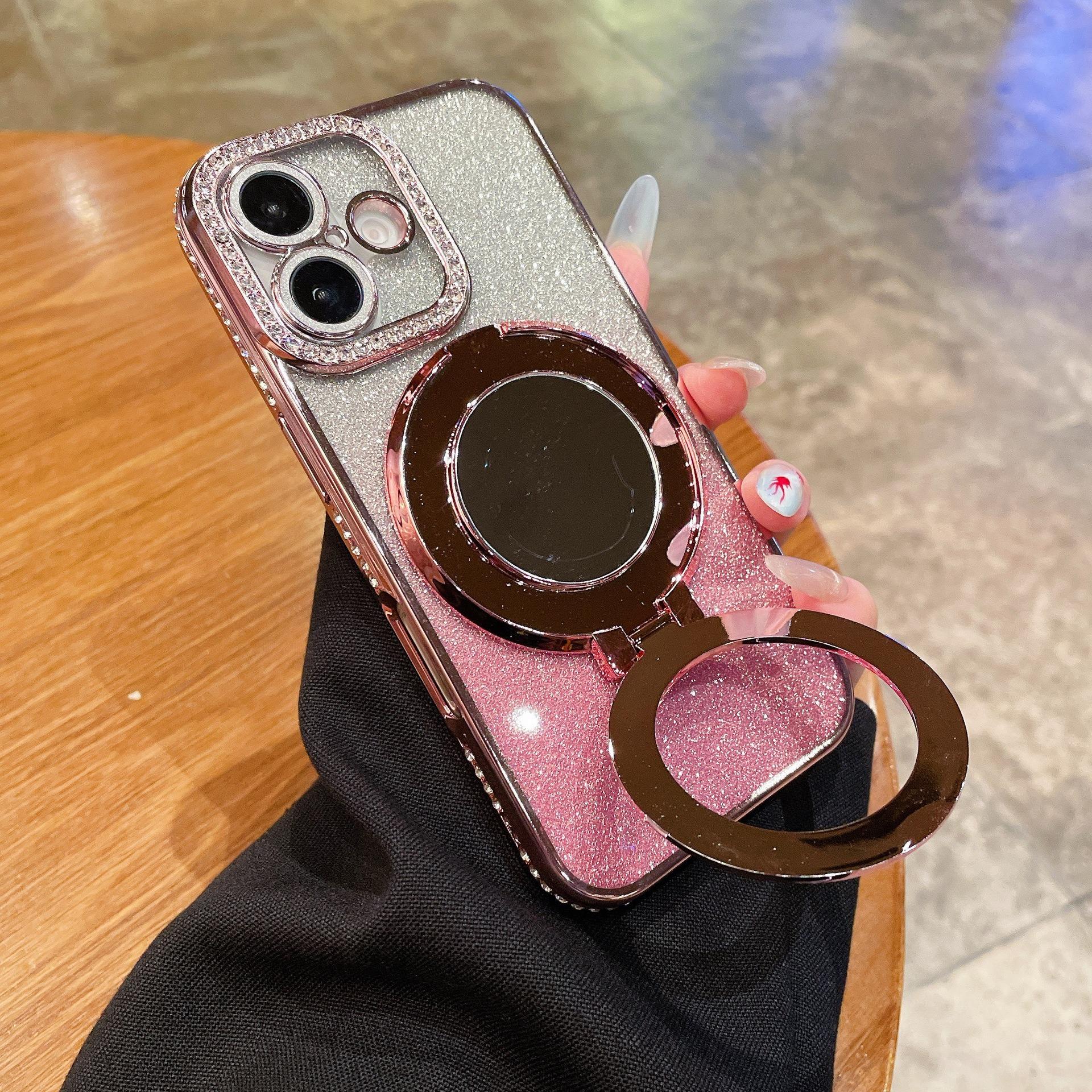 Glitter Gradient Plating Rhinestone TPU Phone Case with Mirror Kickstand For iPhone 16ProMax 15 14 13 12 Shockproof Soft Full Cover
