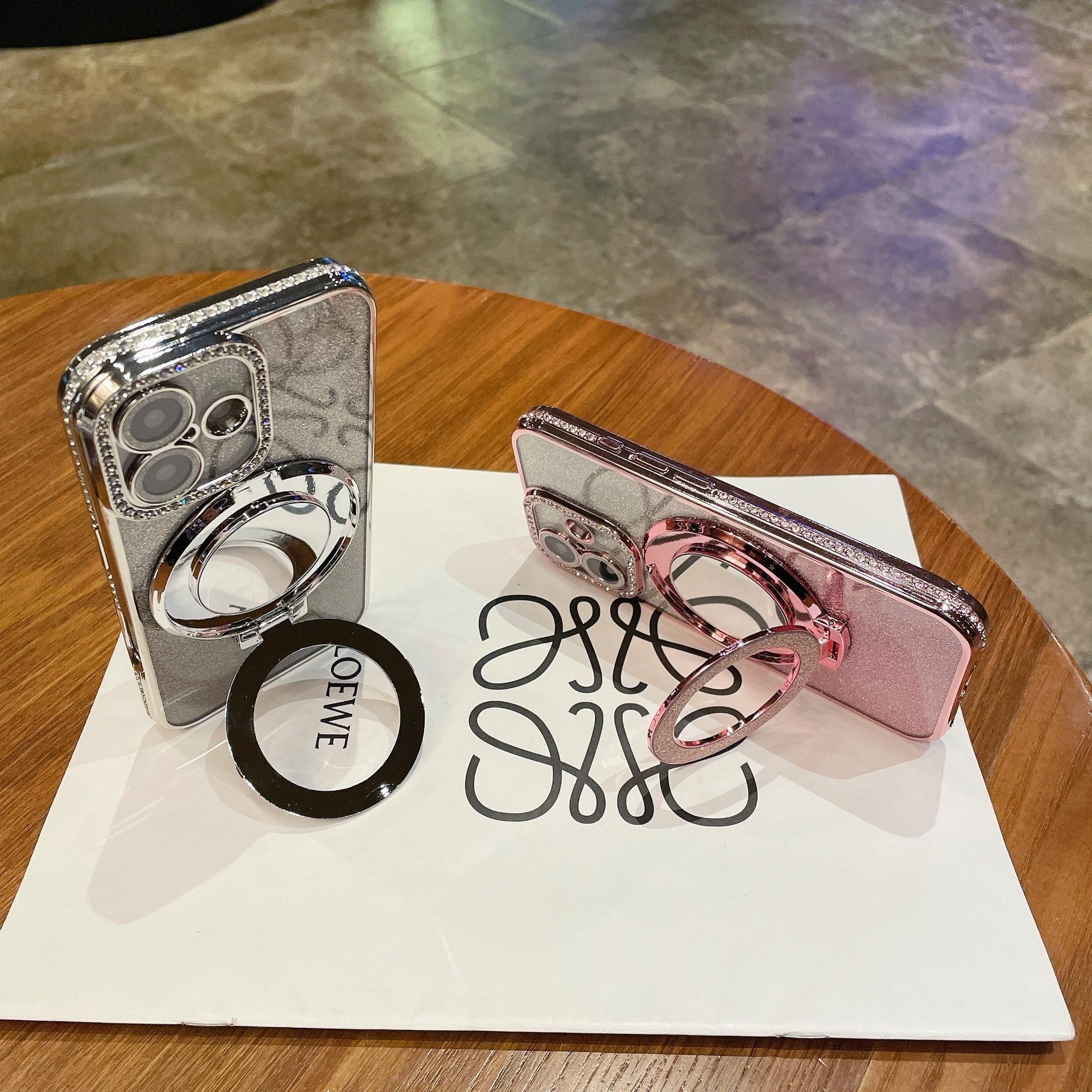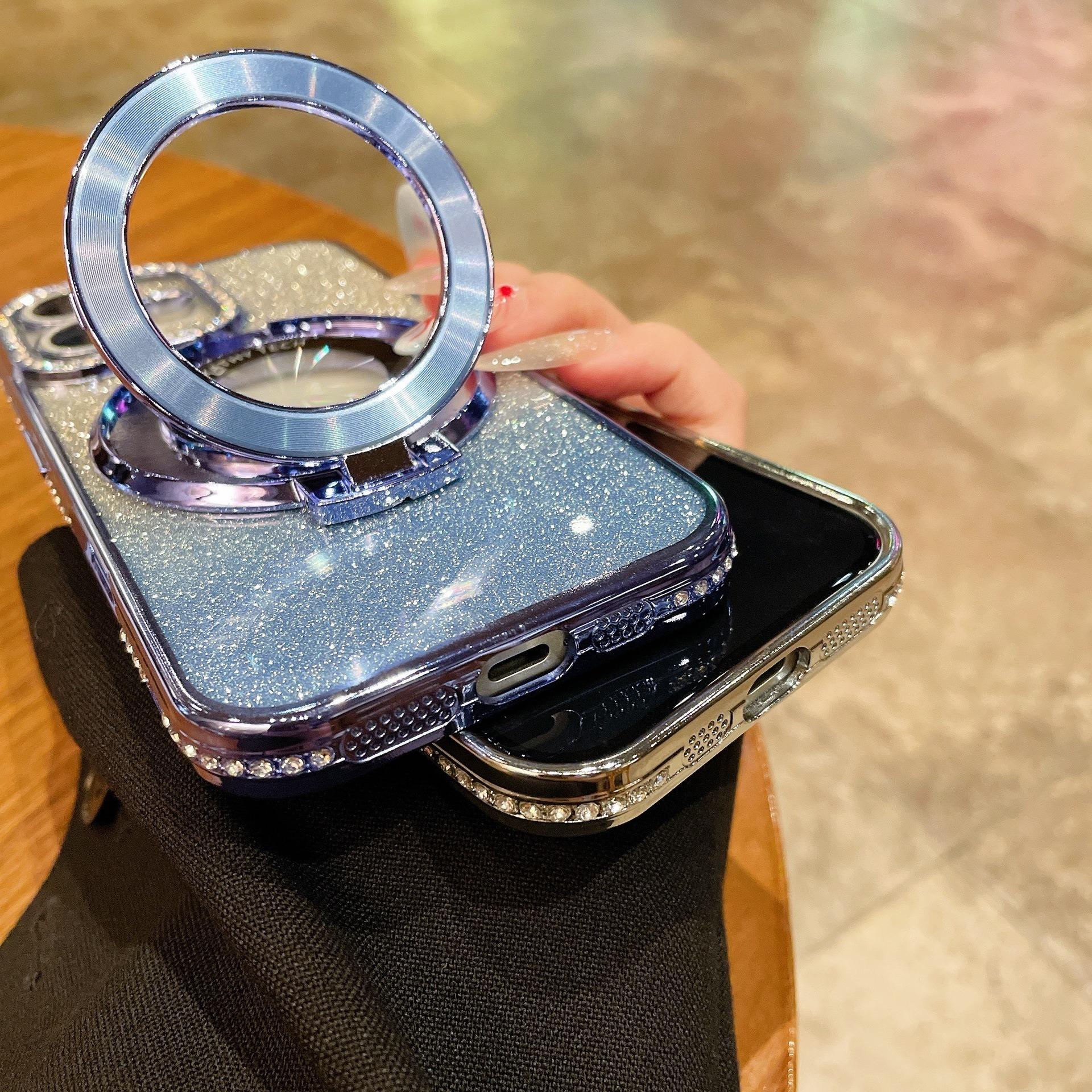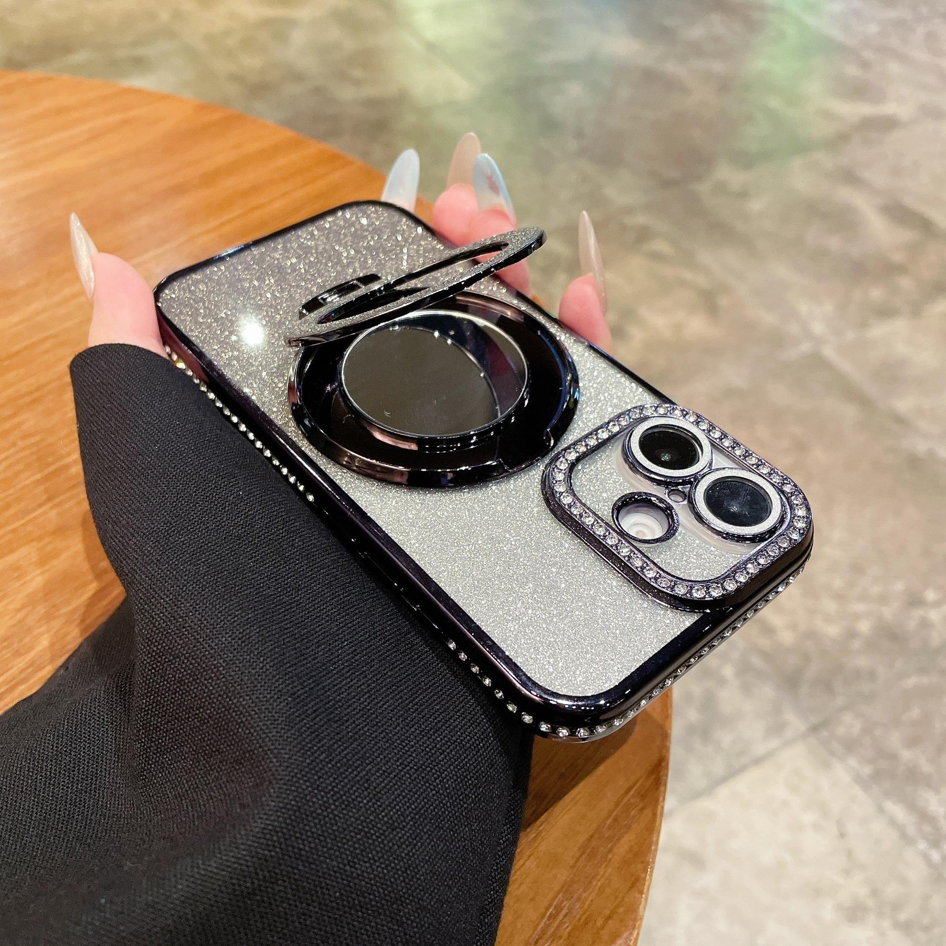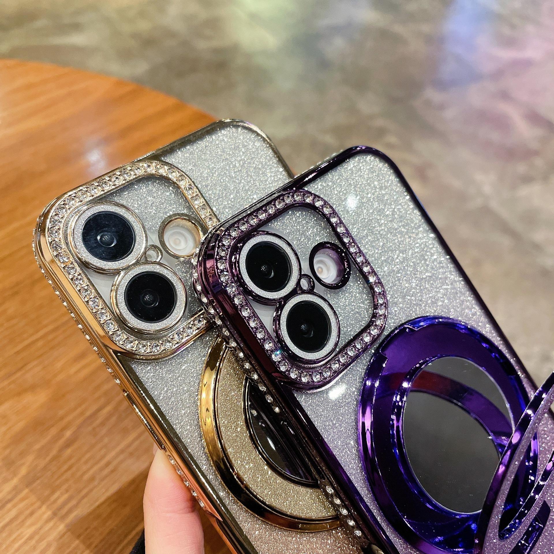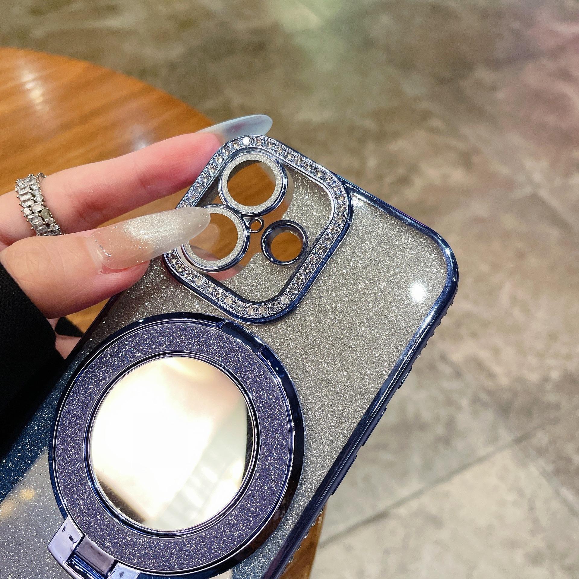 Glitter Gradient Plating Rhinestone TPU Phone Case with Mirror Kickstand For iPhone 16ProMax 15 14 13 12 Shockproof Soft Full Cover