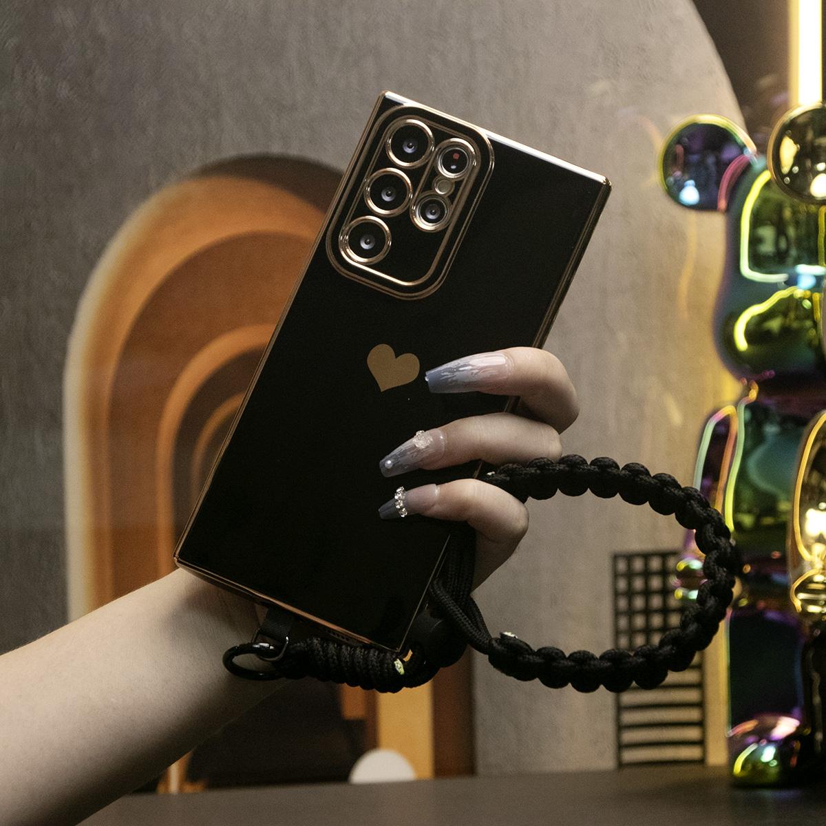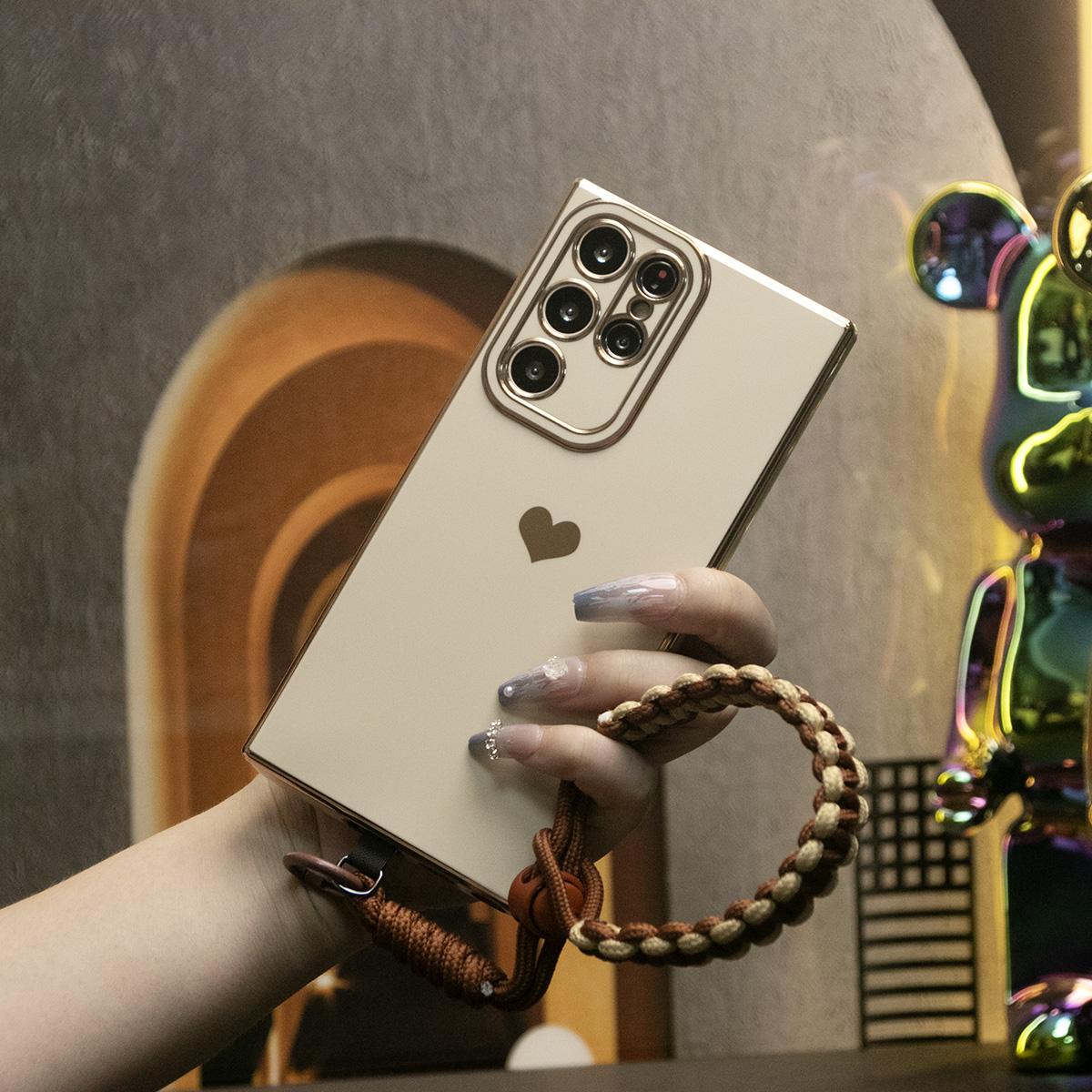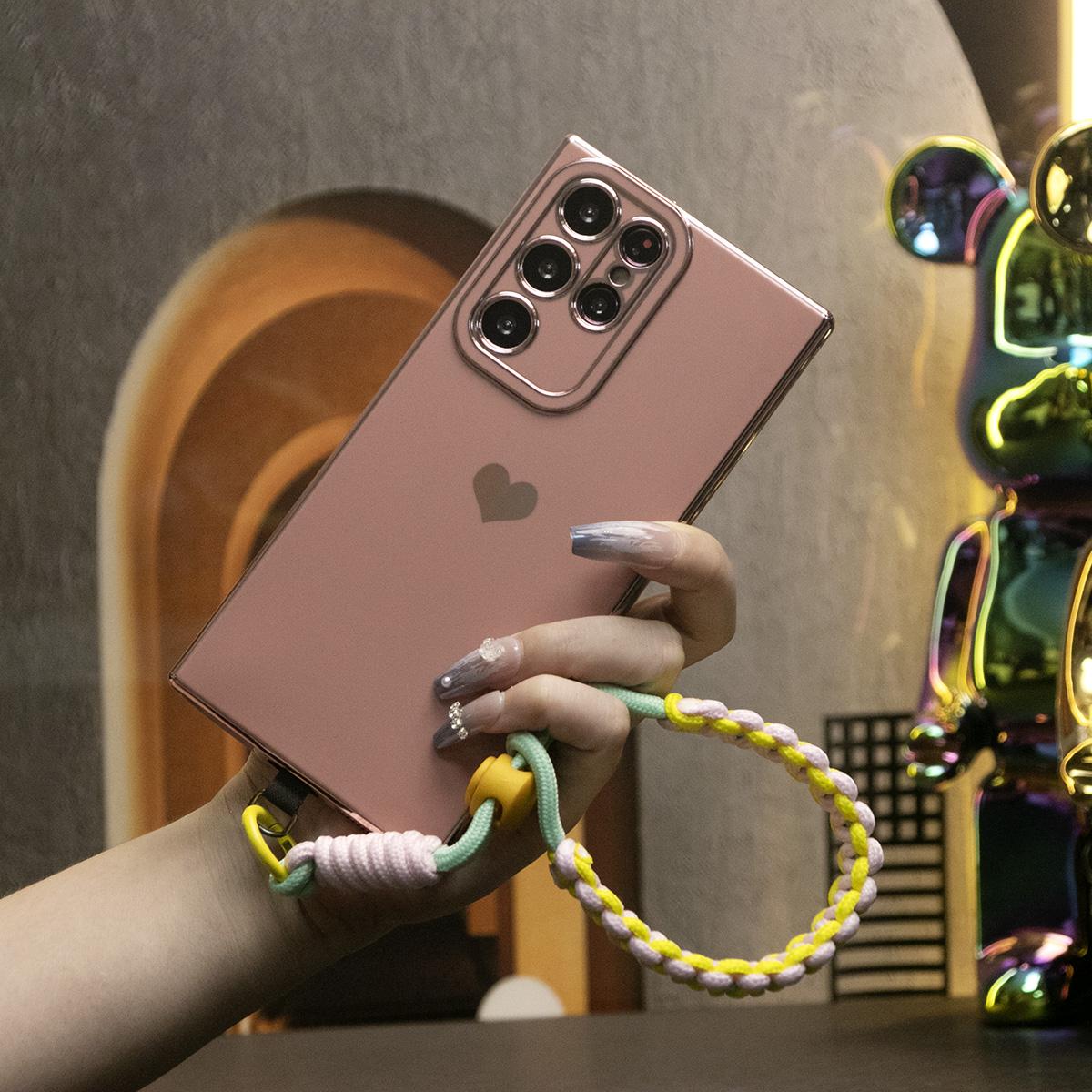 Love Heart Side Pattern Plating Basic Phone Case With Adjustable Wristbands For Samsung S21 S21FE S21Plus S21Ultra S22 S22Plus S22Ultra S23 S23Plus S23Ultra S24Ultra Plus