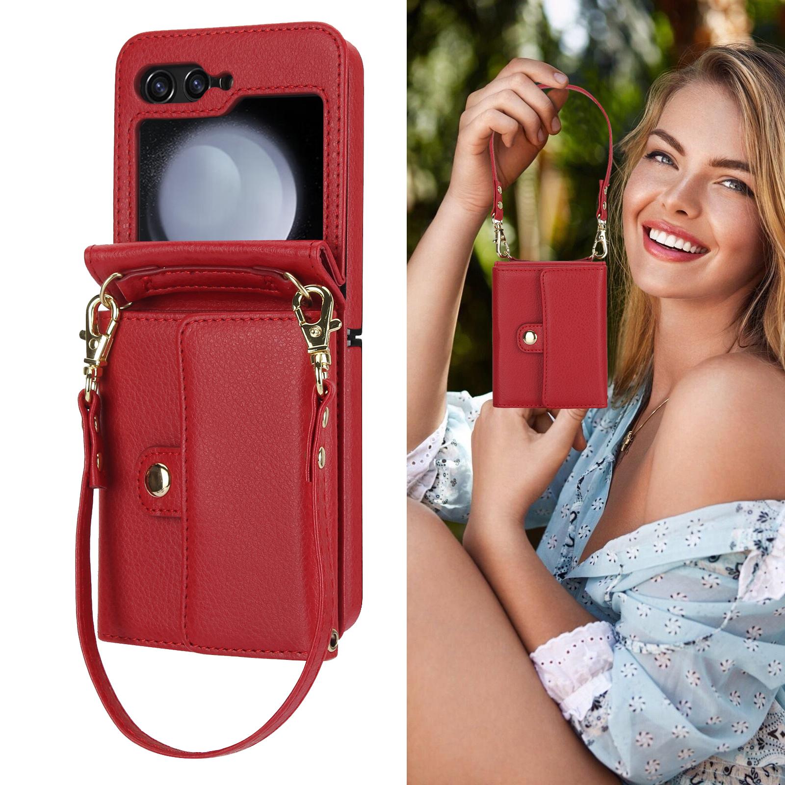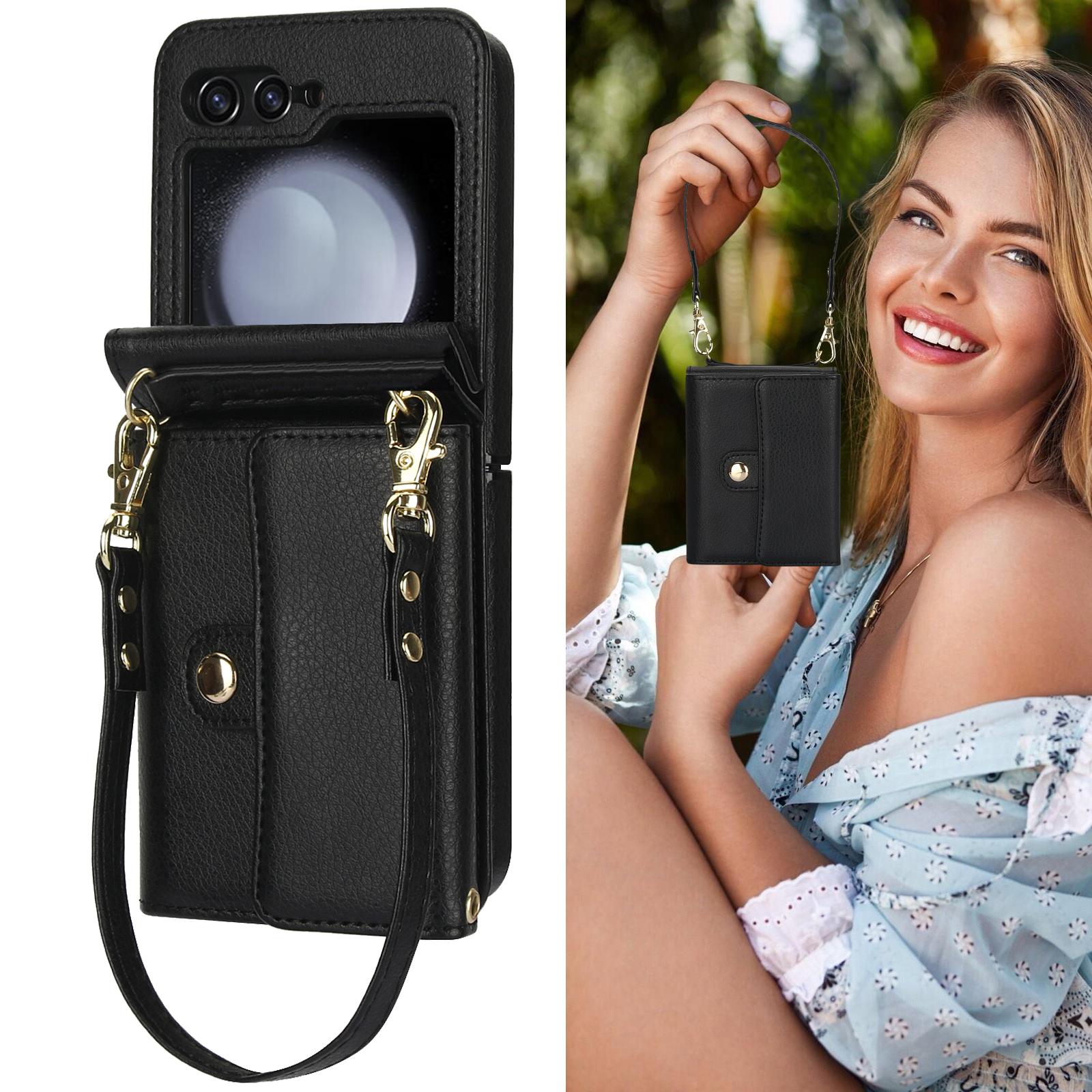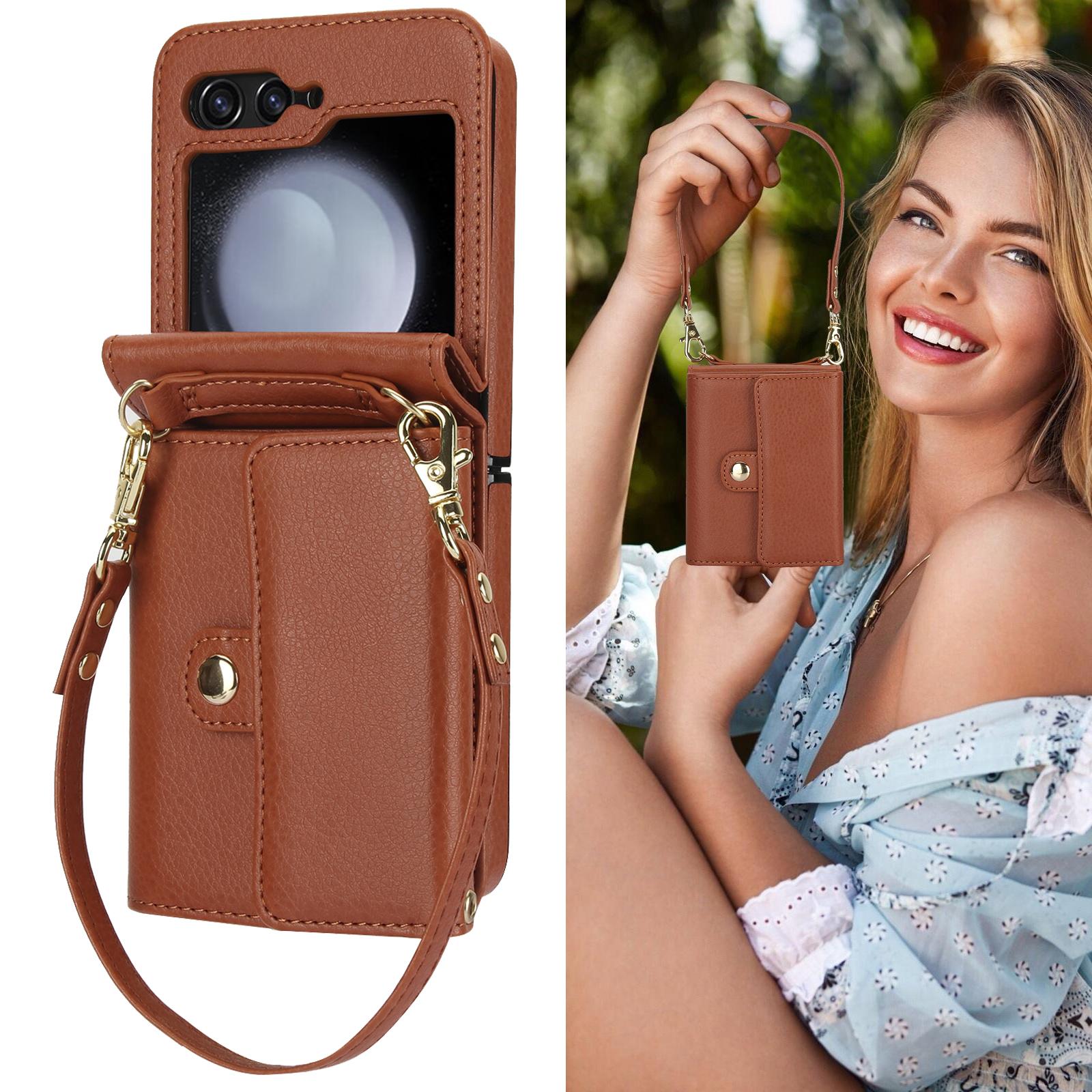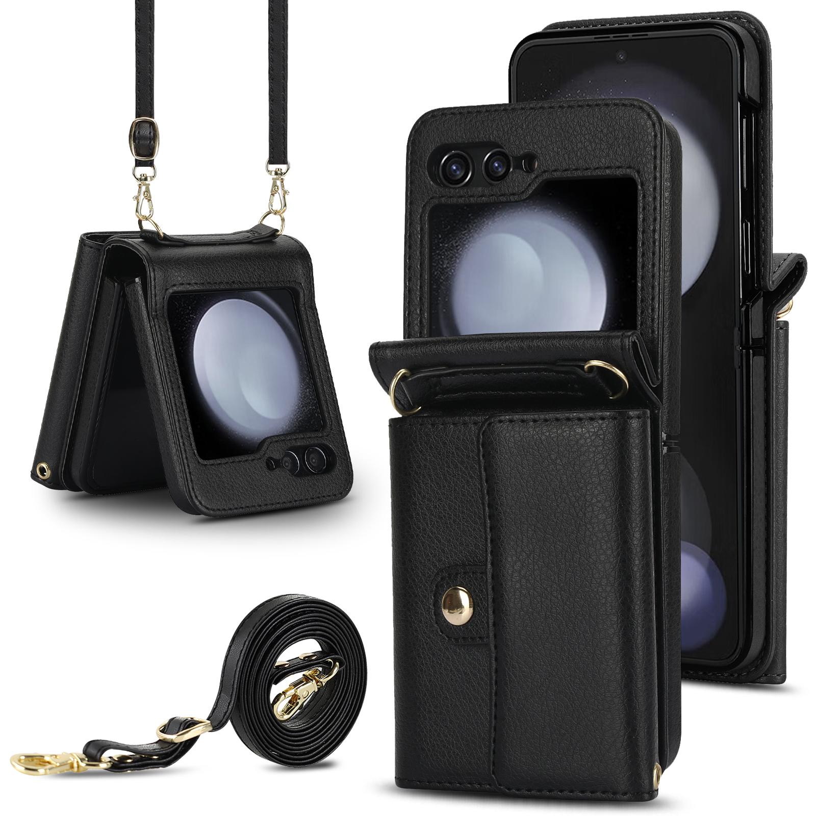 Crossbody Wrist Strap Leather with Card Holder Phone Case for Samsung Galaxy Z Flip 6 5 4 3 Flip6 Flip5 Flip4 Flip3 Wallet Cover