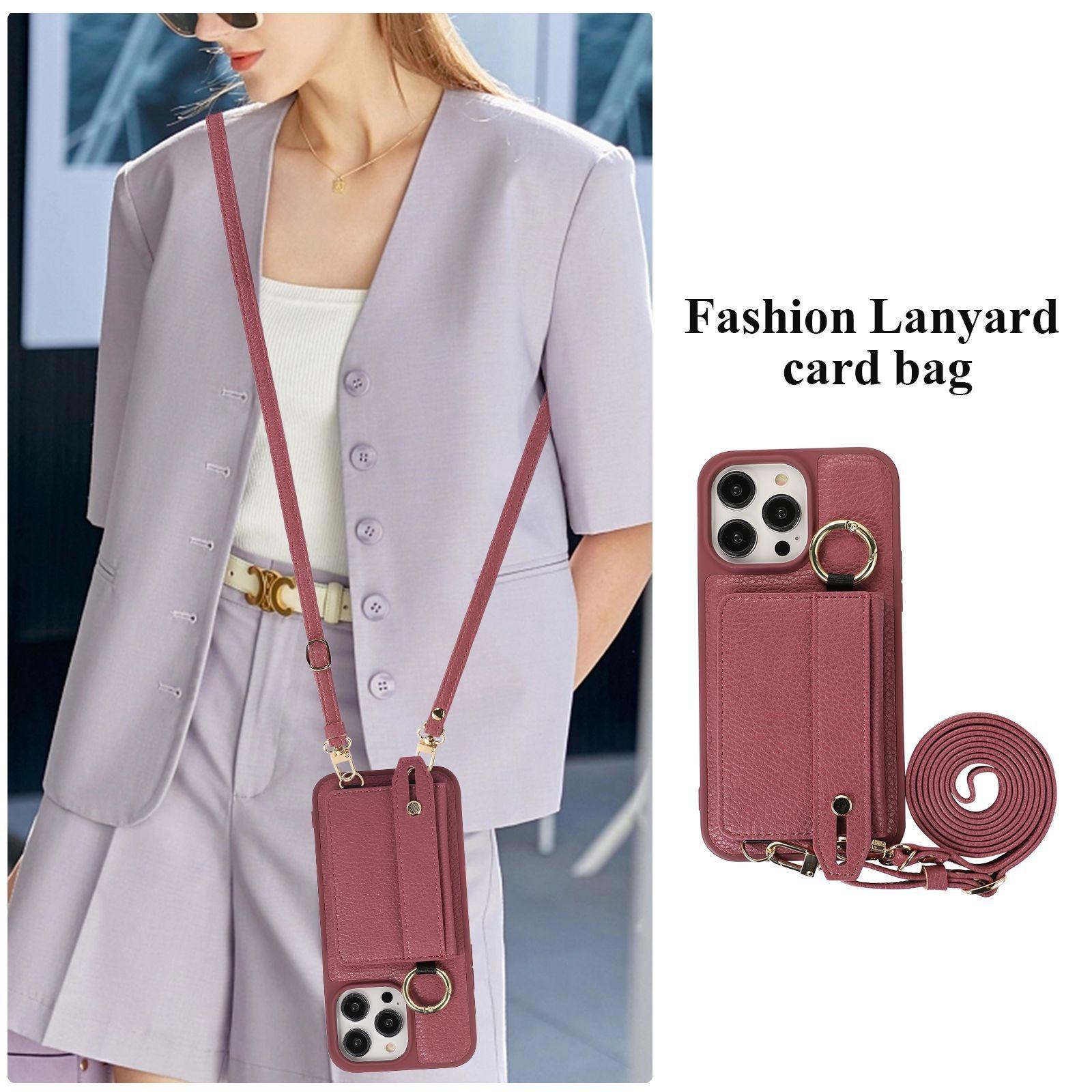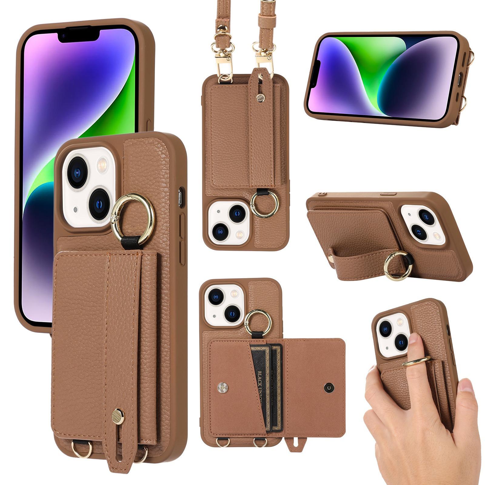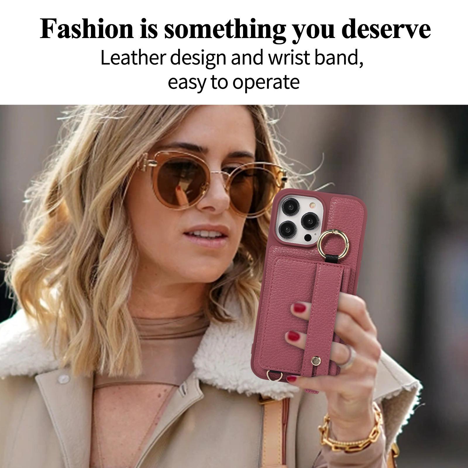 For iPhone 16ProMax 16 15 14 13 12 11 Leather Phone Case with Double Folding Wallet Lanyard, Anti-Fall Card Slot Wristband Ring Kickstand Shockproof Business Hard Full Cover