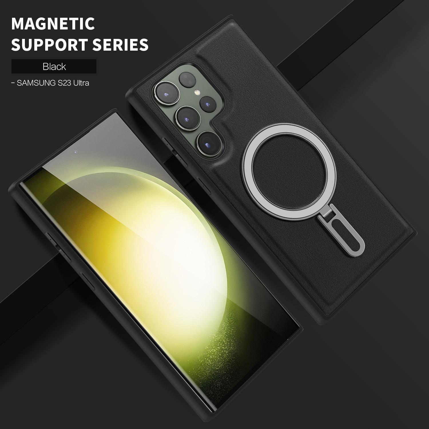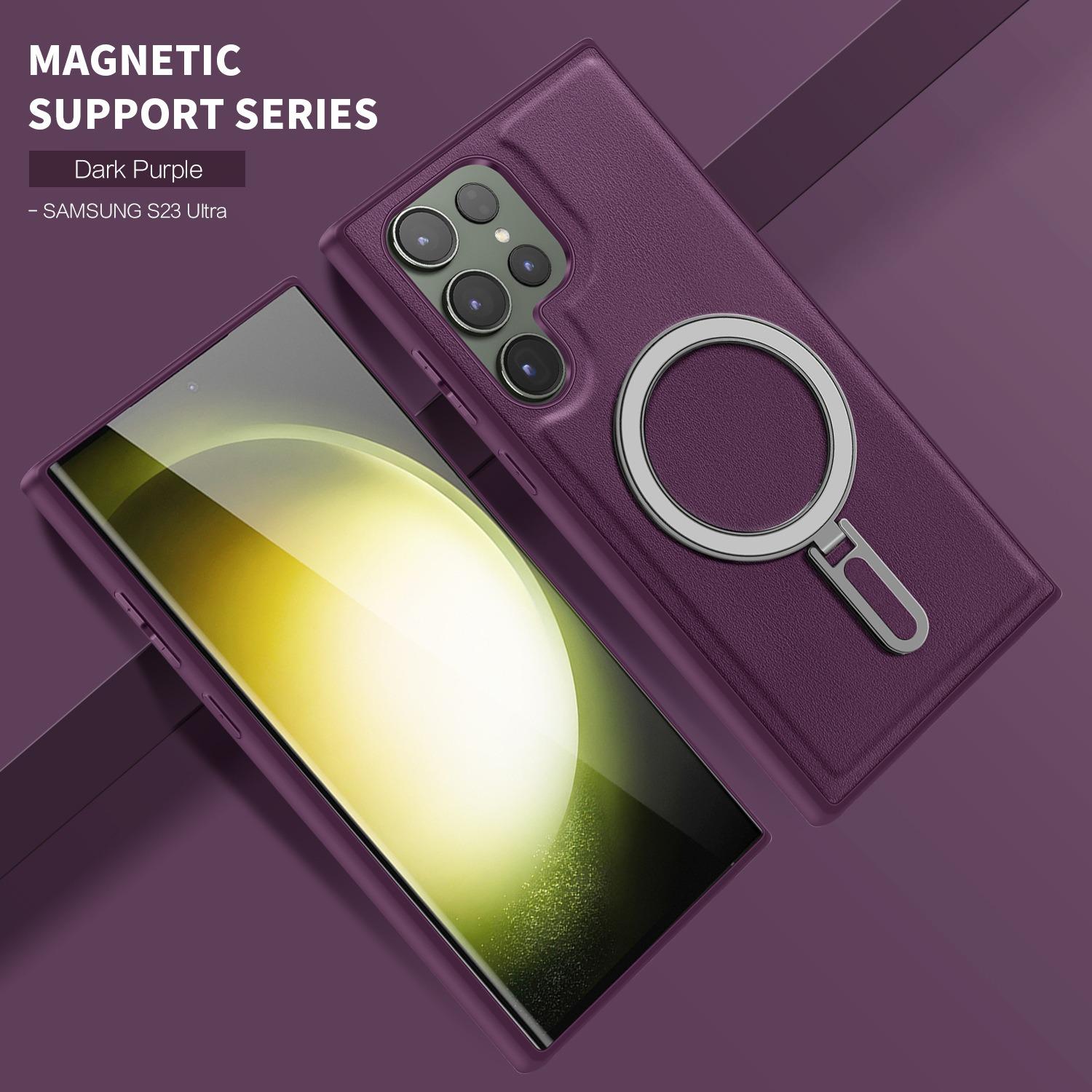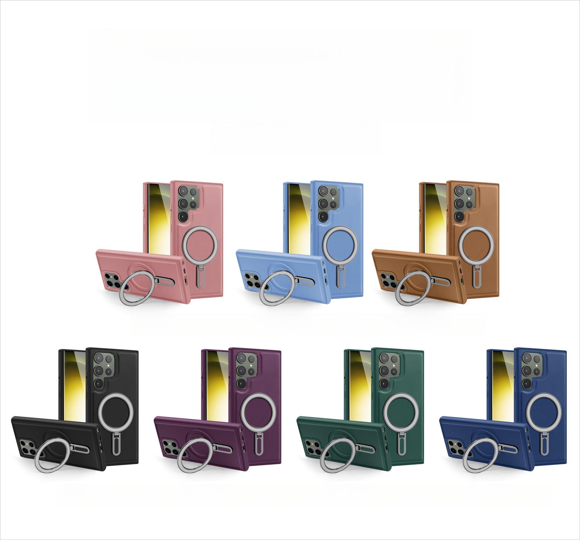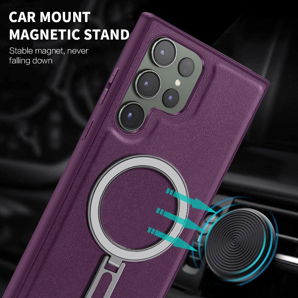 Luxury Full Leather Glossy Kickstand Phone Case For Magsafe For Samsung S25Ultra S25+ S25 S24FE S24 Ultra S23 S22 Ultra Plus Metal Ring Magnetic Metal Holder Shockproof Stand Back Cover