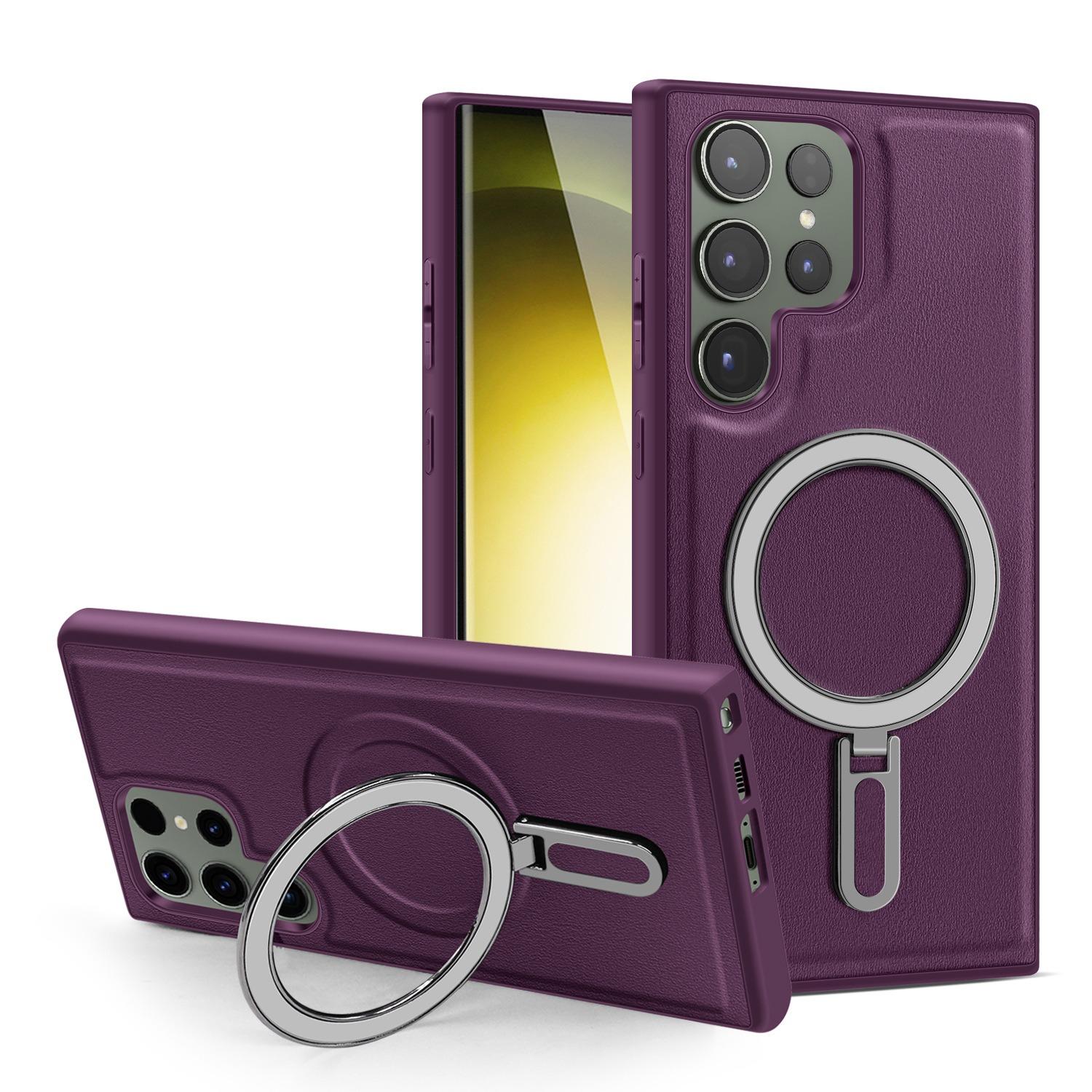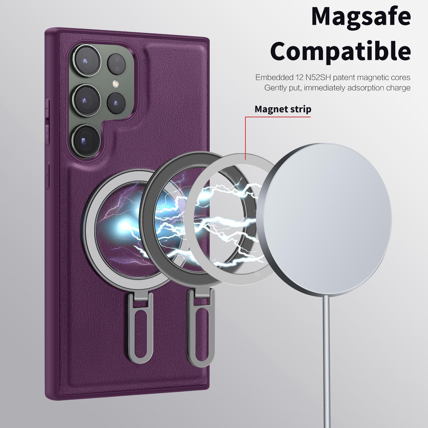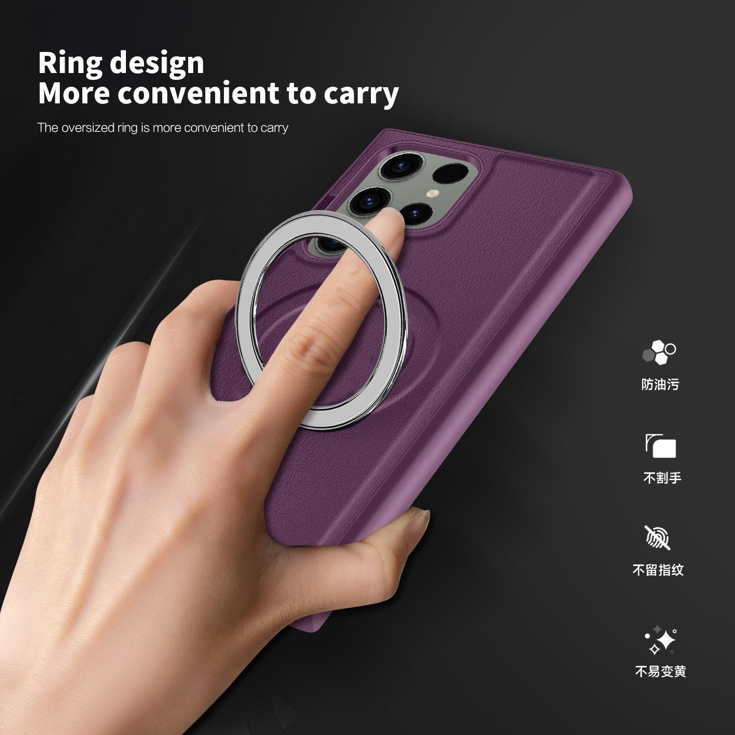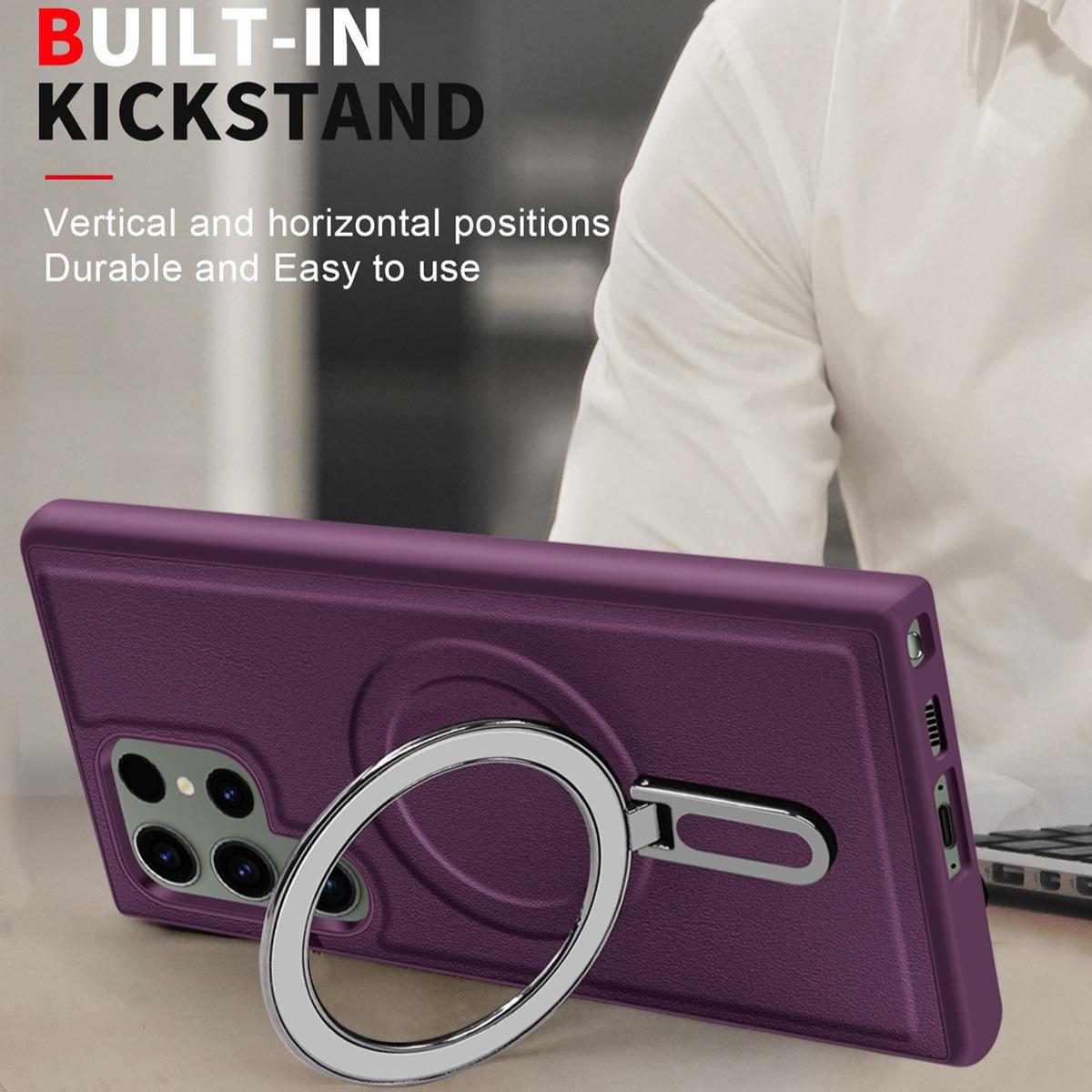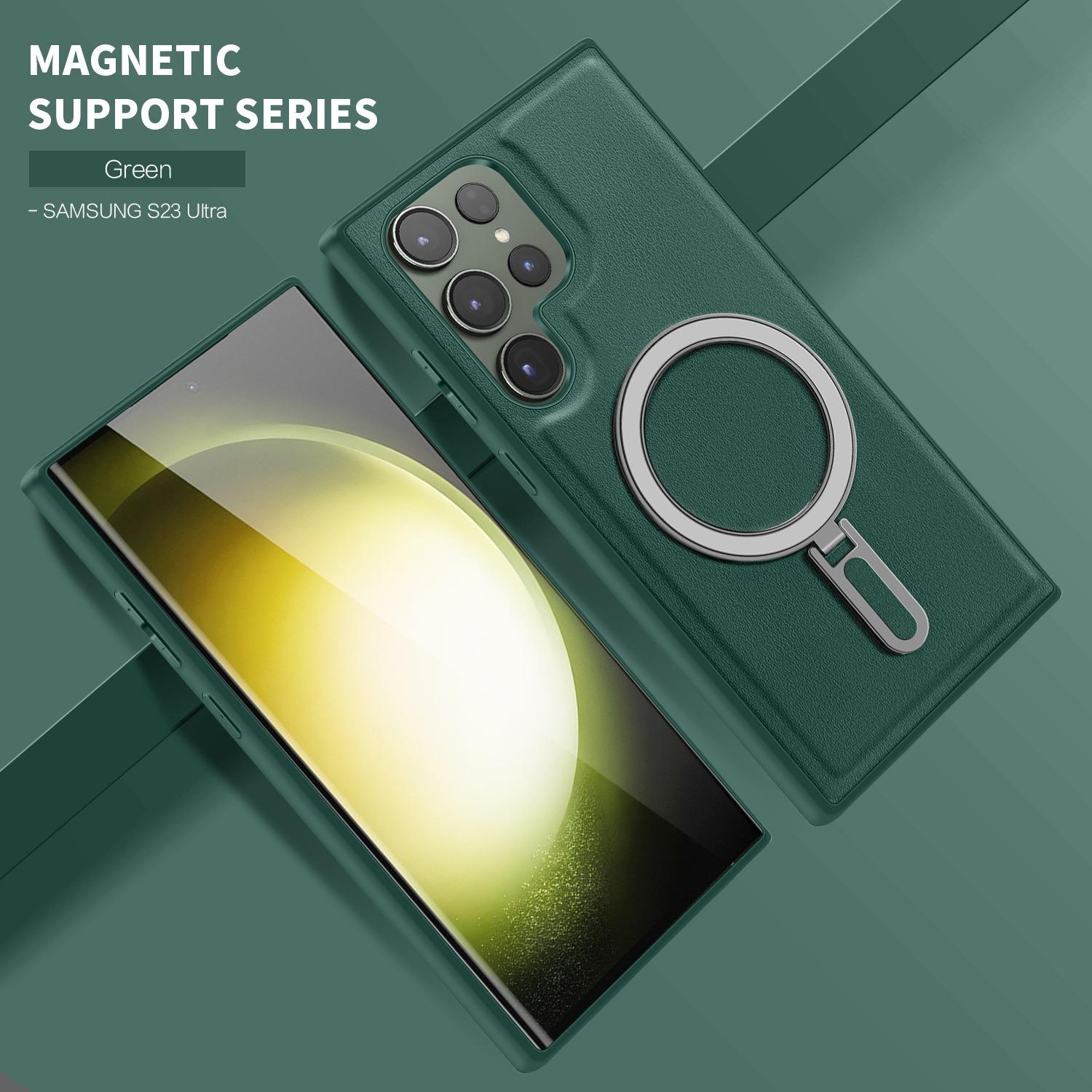 Luxury Full Leather Glossy Kickstand Phone Case For Magsafe For Samsung S25Ultra S25+ S25 S24FE S24 Ultra S23 S22 Ultra Plus Metal Ring Magnetic Metal Holder Shockproof Stand Back Cover