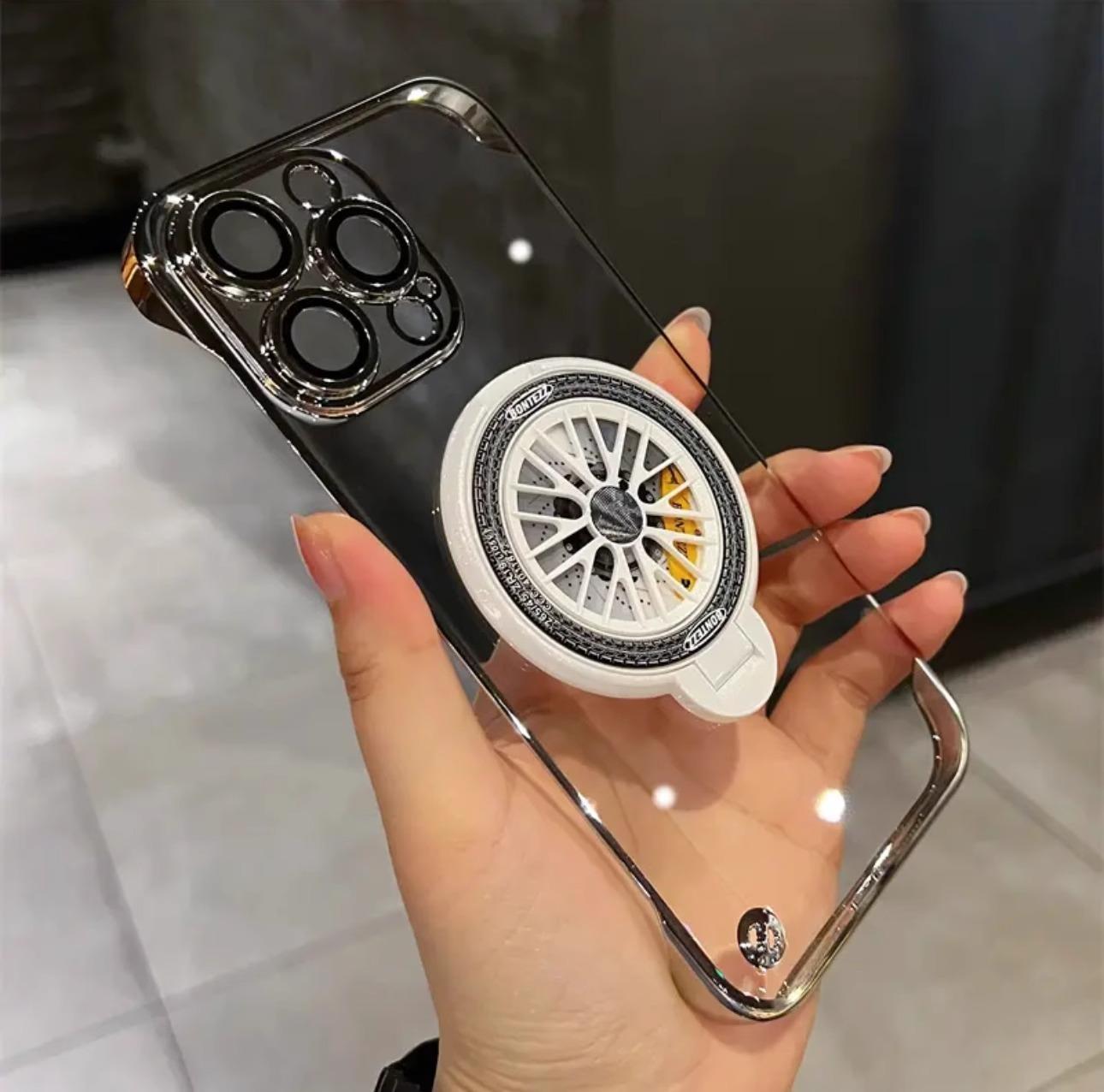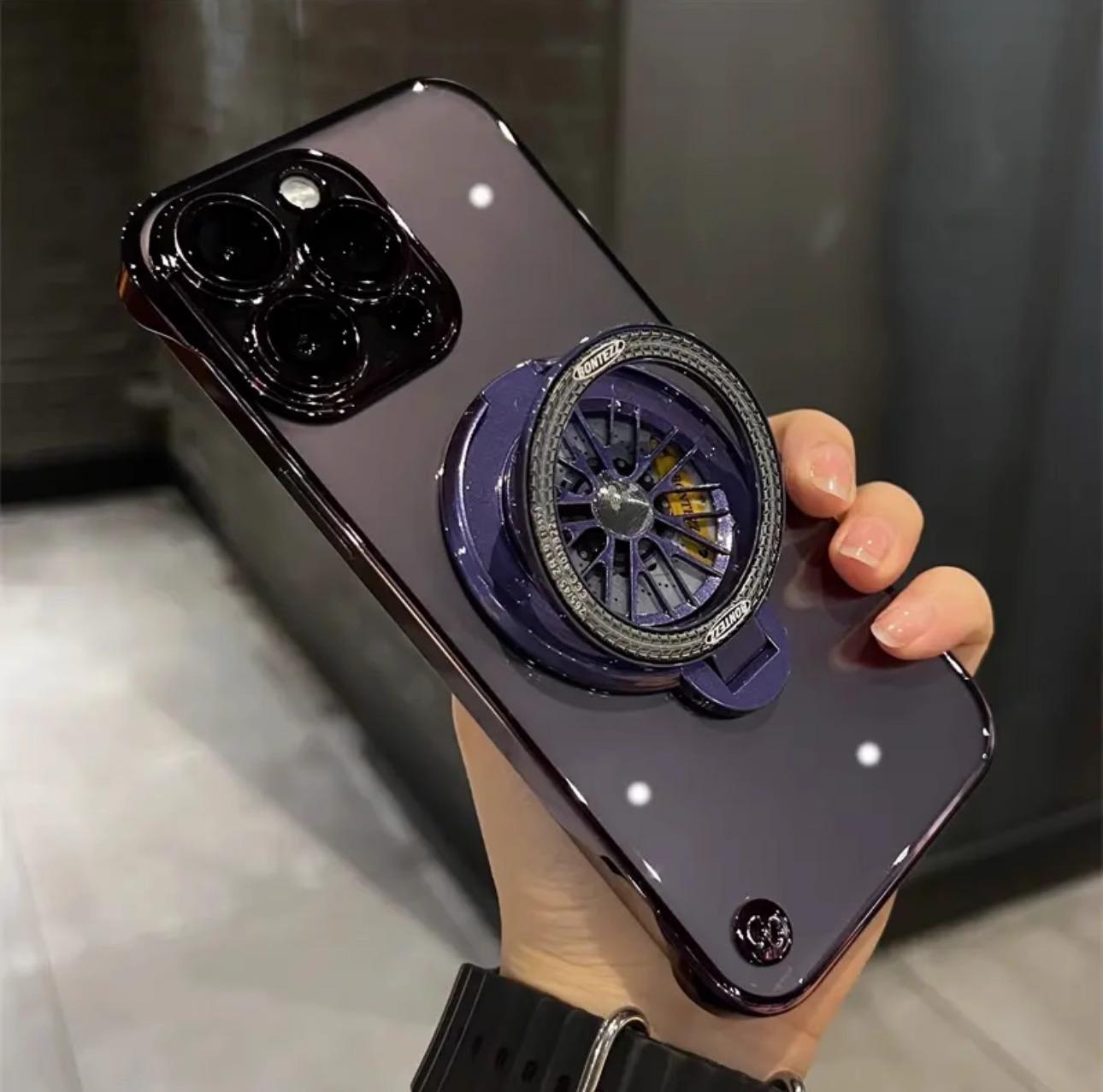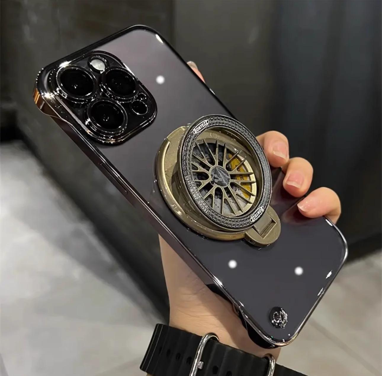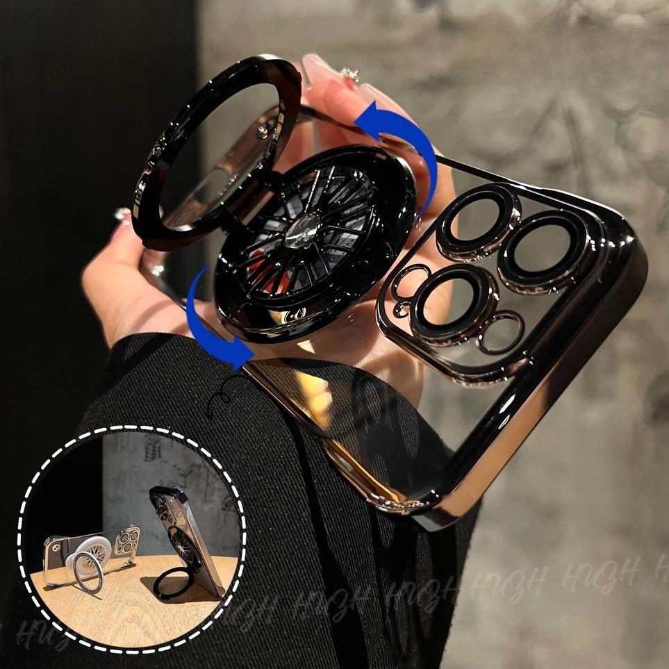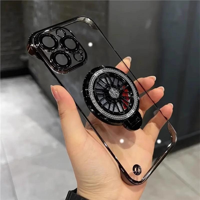 Ultra Slim Frameless Plating PC with Len Protector Phone Case with Metal Magnetic Gyro Rotating Kickstand For iPhone 16ProMax 15 14 13 12 Shockproof Support Wireless Charging Hard Full Cover