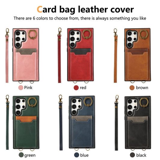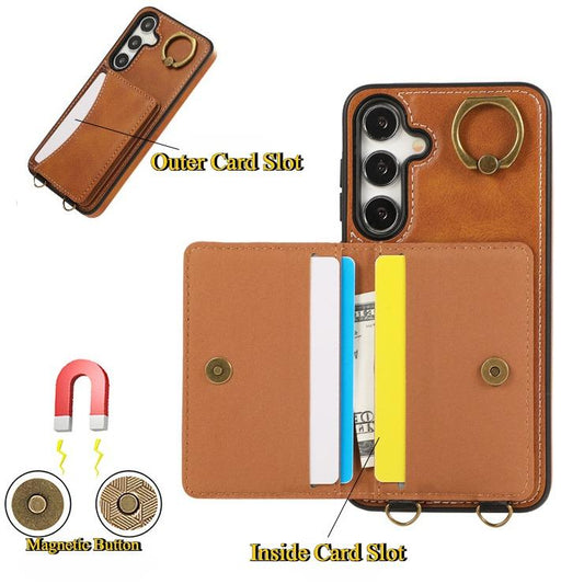 For Samsung S25Ultra S24 S23 S22 A16 A15 A35 A55 Leather Phone Case with Double Folding Wallet Wristband, Anti-Fall Card Slot Ring Kickstand Shockproof Business Hard Full Cover