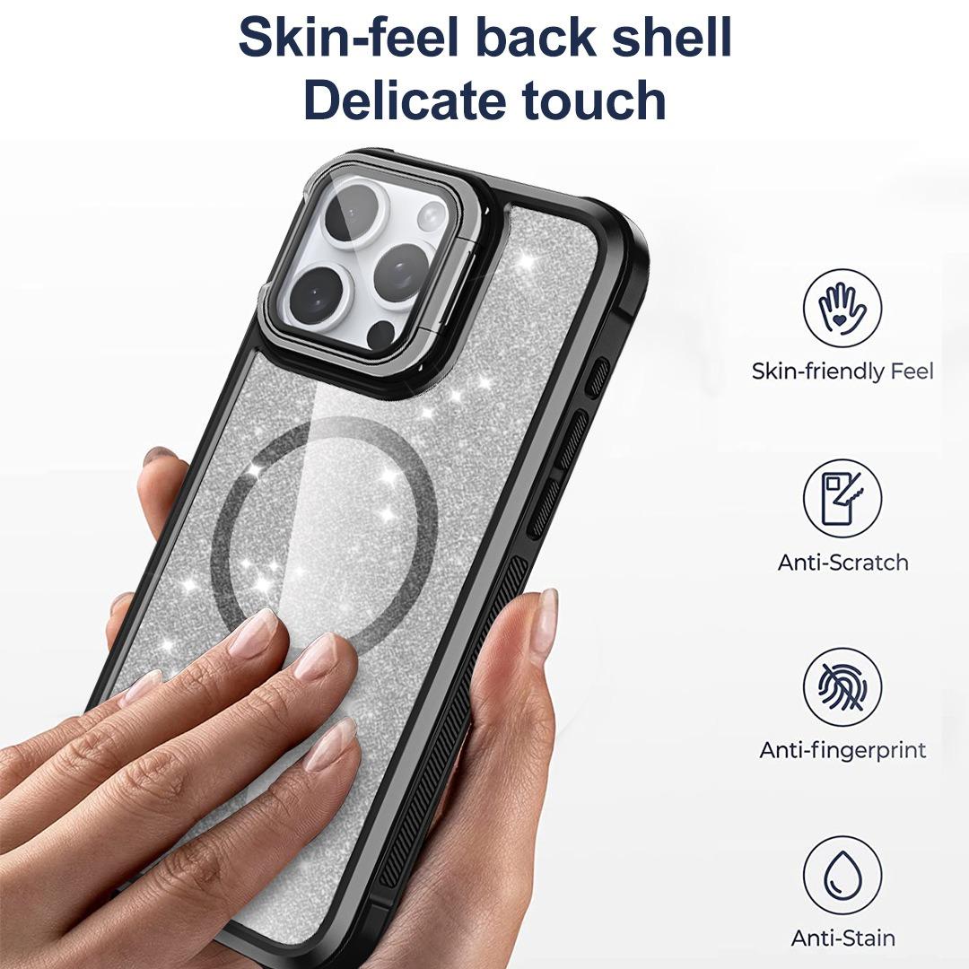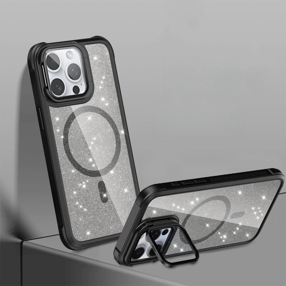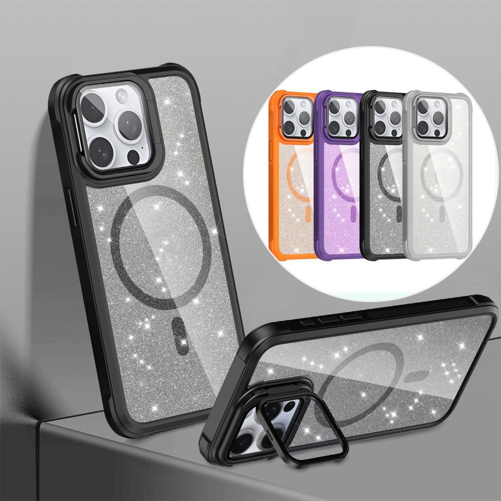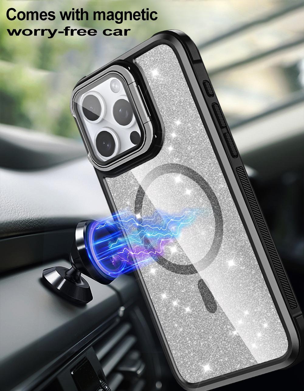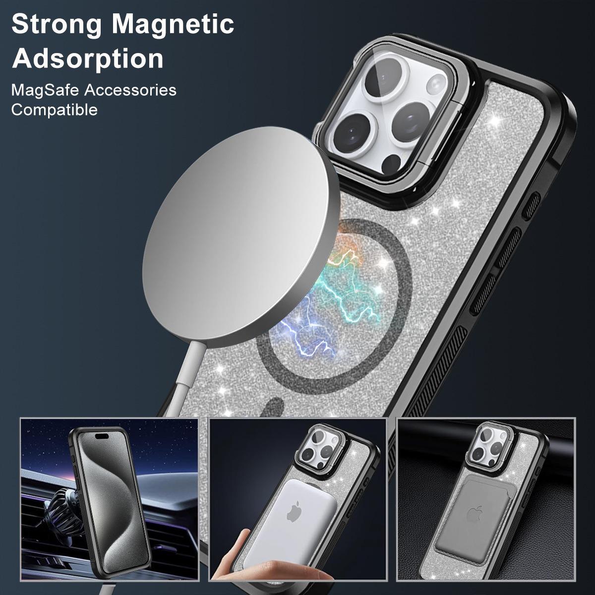 For iPhone 16ProMax 16 15 14 13 12 11 Strong Magnetic Phone Case, Glass Camera Kickstand Protection, Glitter Clear Acrylic Four Corner Shockproof Bumper Hand Feel Hard Full Cover