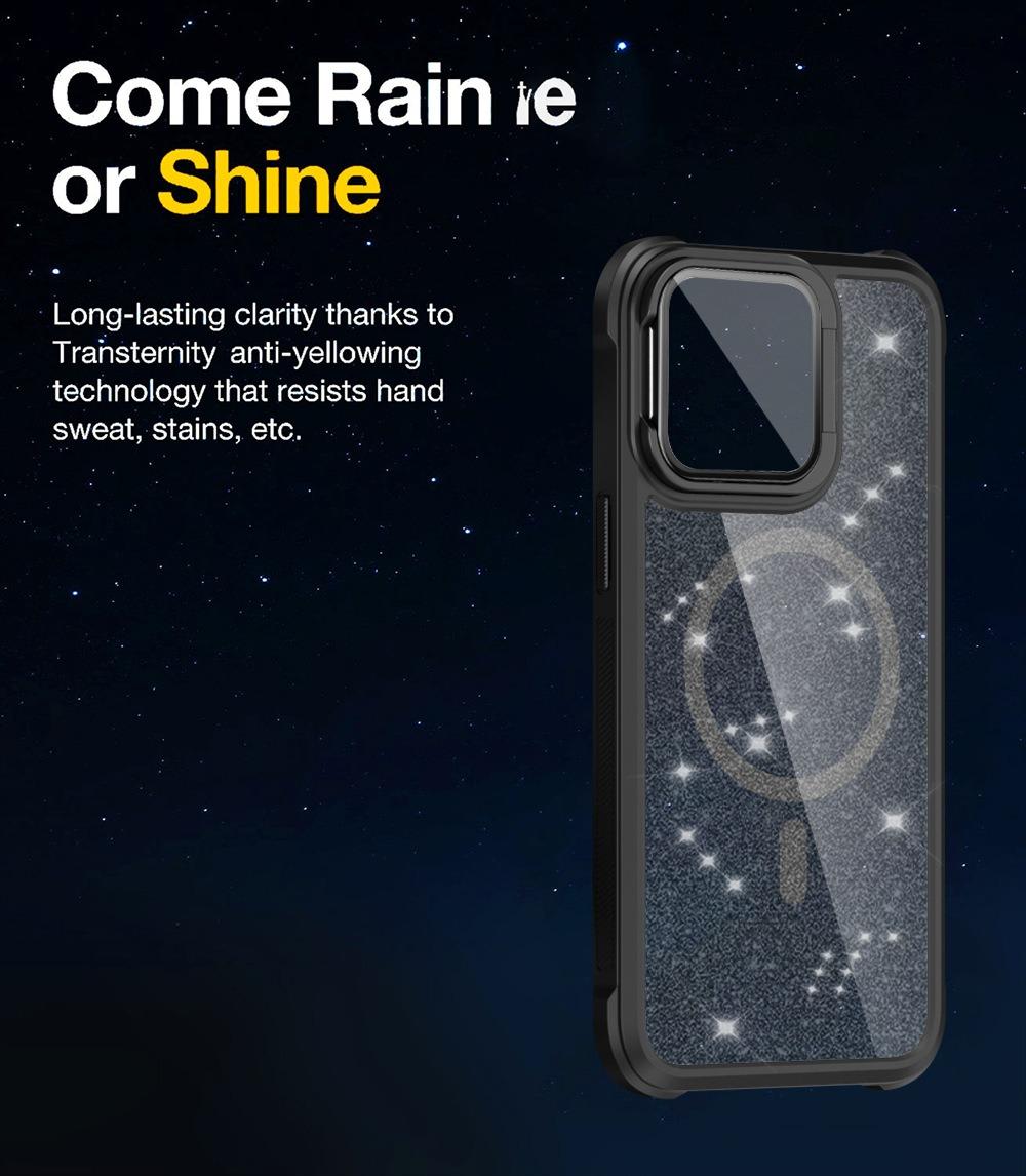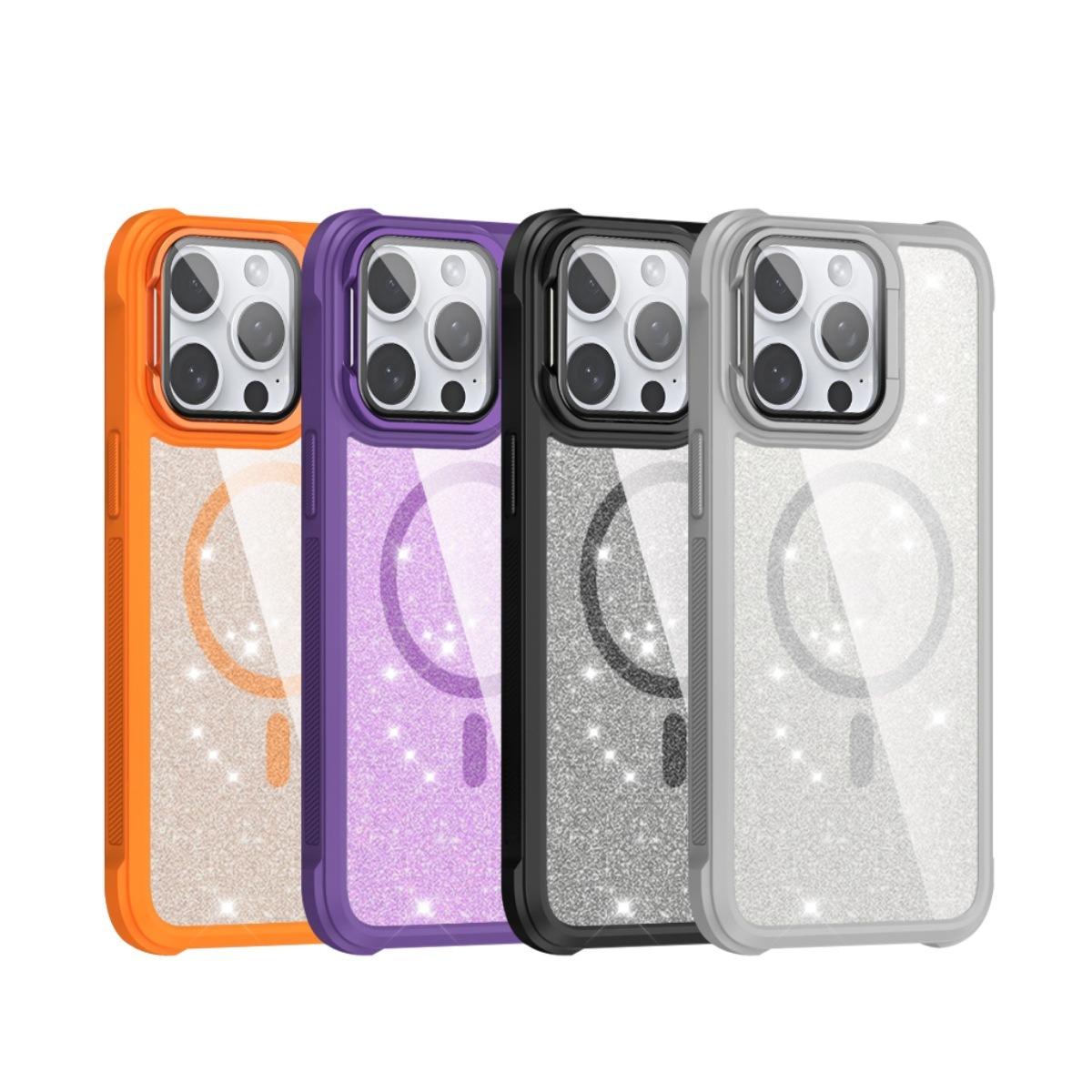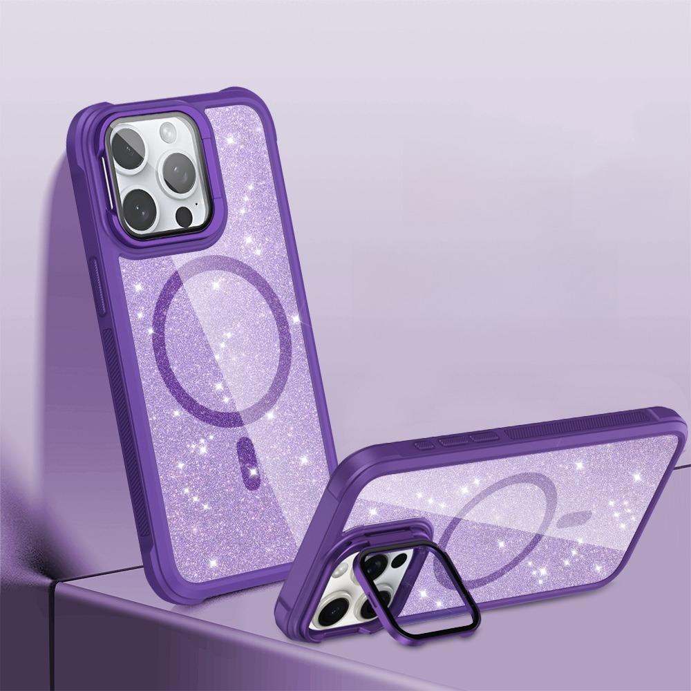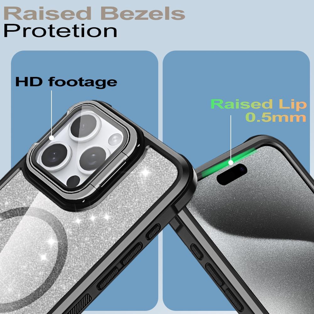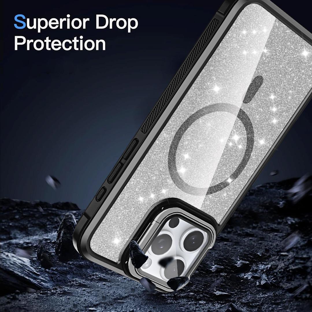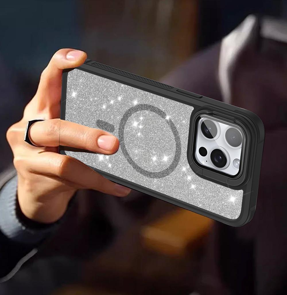 For iPhone 16ProMax 16 15 14 13 12 11 Strong Magnetic Phone Case, Glass Camera Kickstand Protection, Glitter Clear Acrylic Four Corner Shockproof Bumper Hand Feel Hard Full Cover