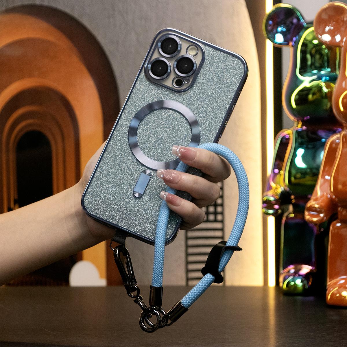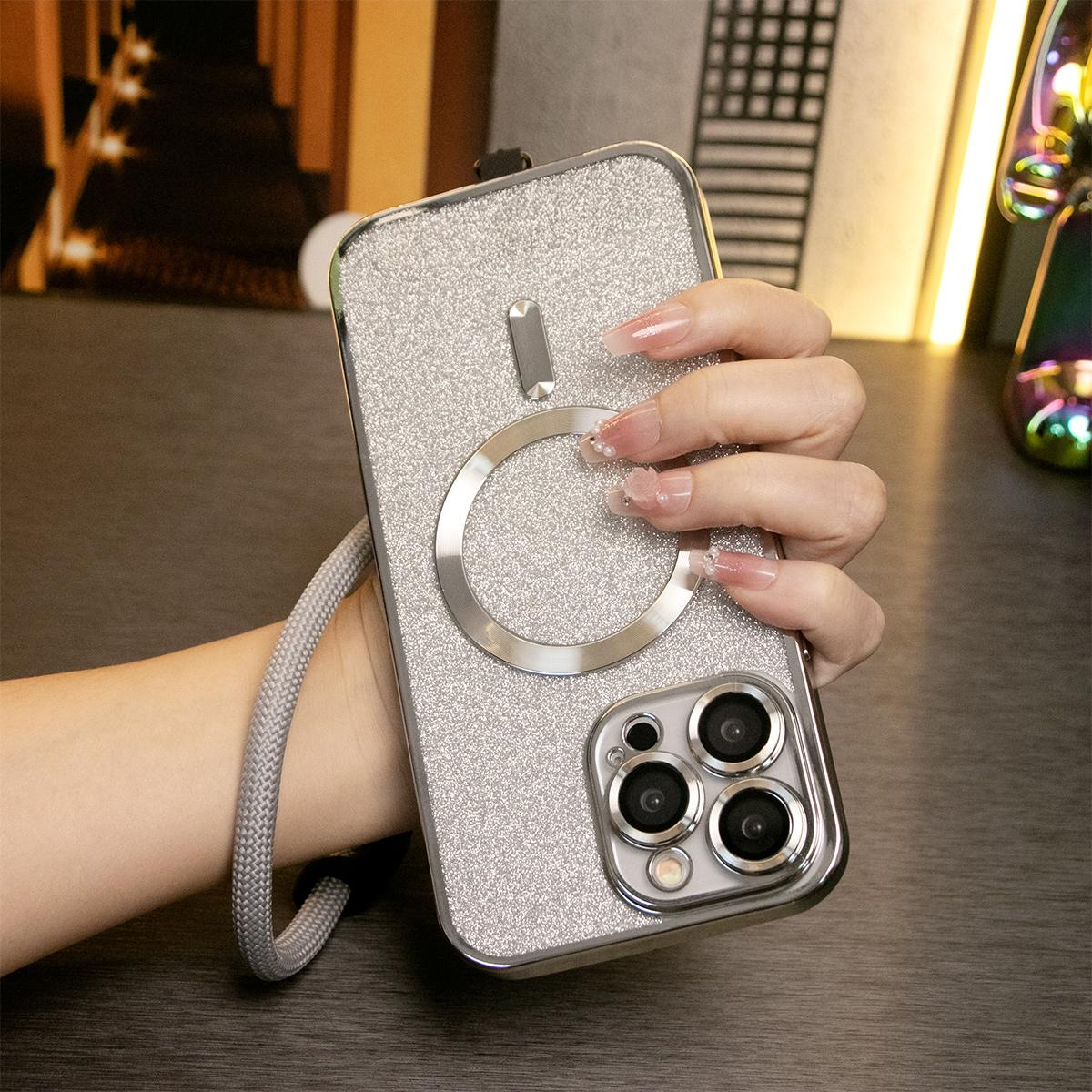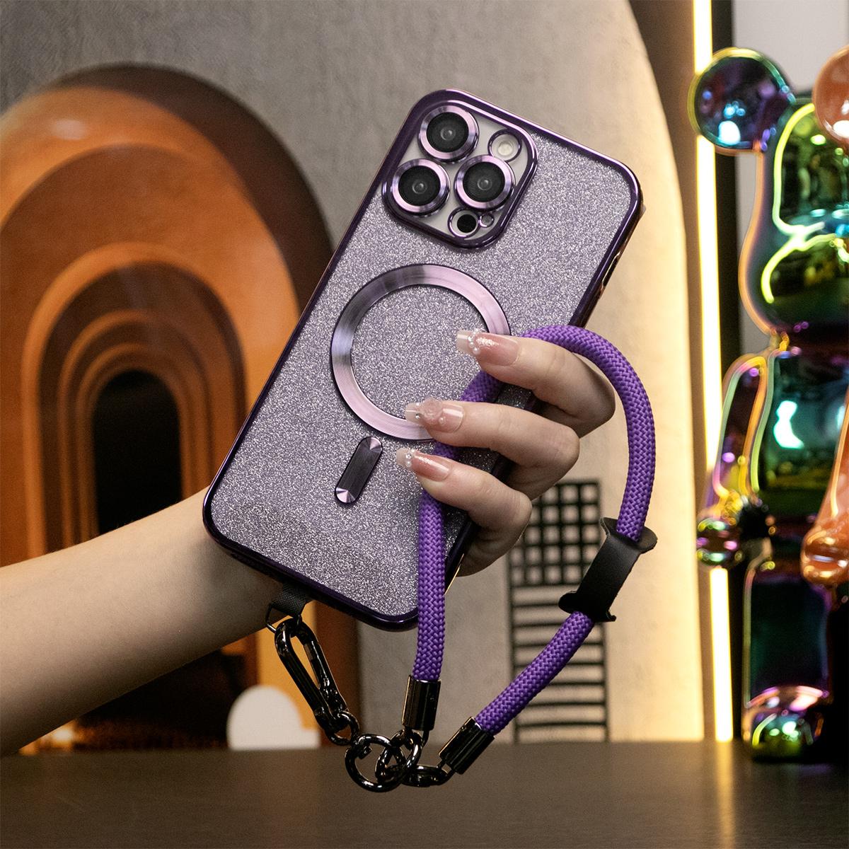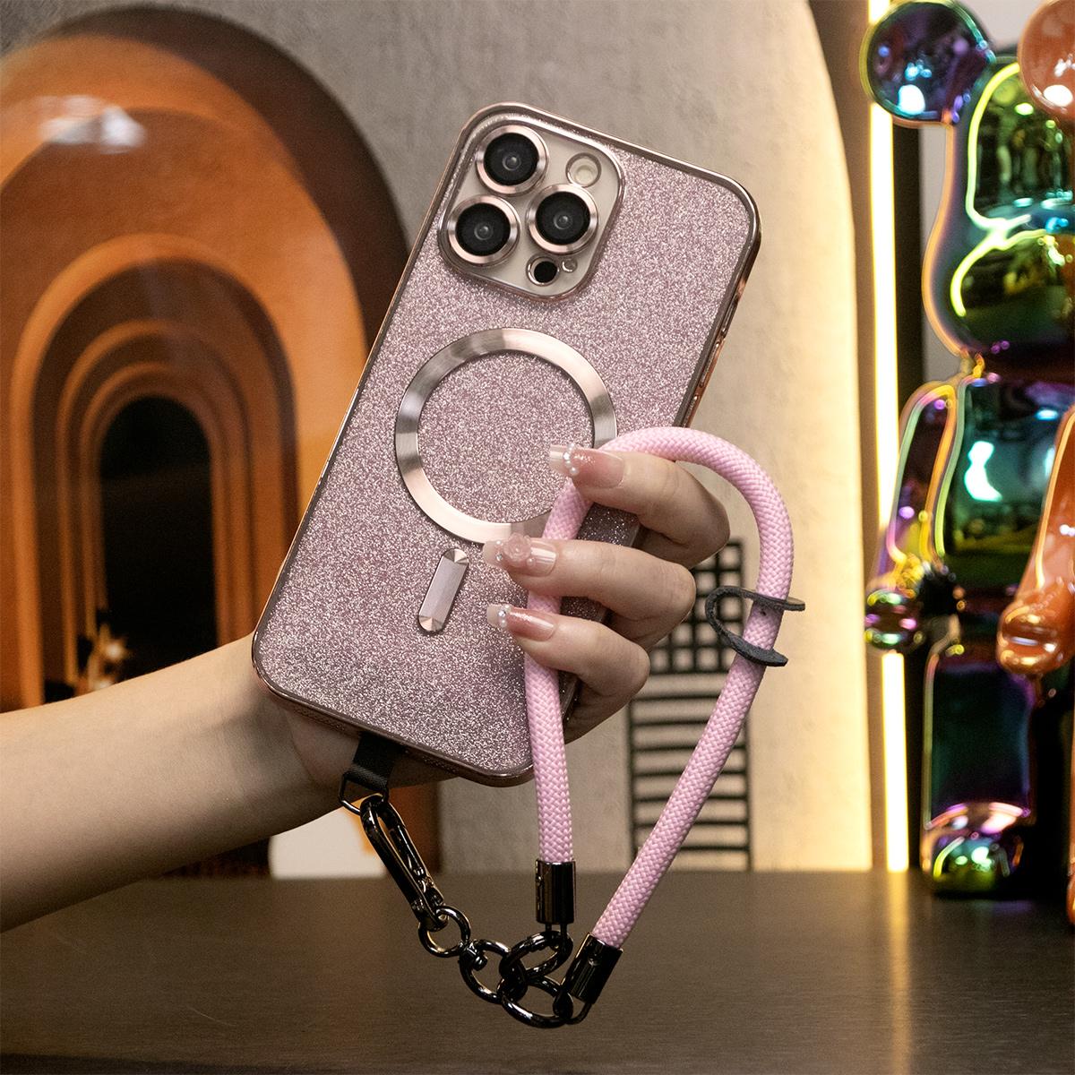 Glitter Magnetic Wireless Charge Transparent Soft Phone Case With Multifunctional Climbing Rope For iPhone 16 15 14 13 12 11 Pro Max
