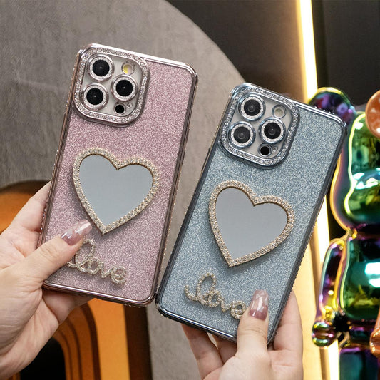 Plating Glitter Diamond Lover Heart Mirror Phone Case For iPhone 16 15 14 13 12 Pro Max