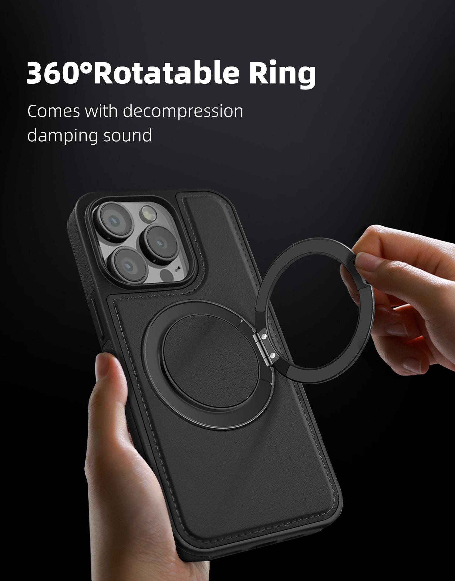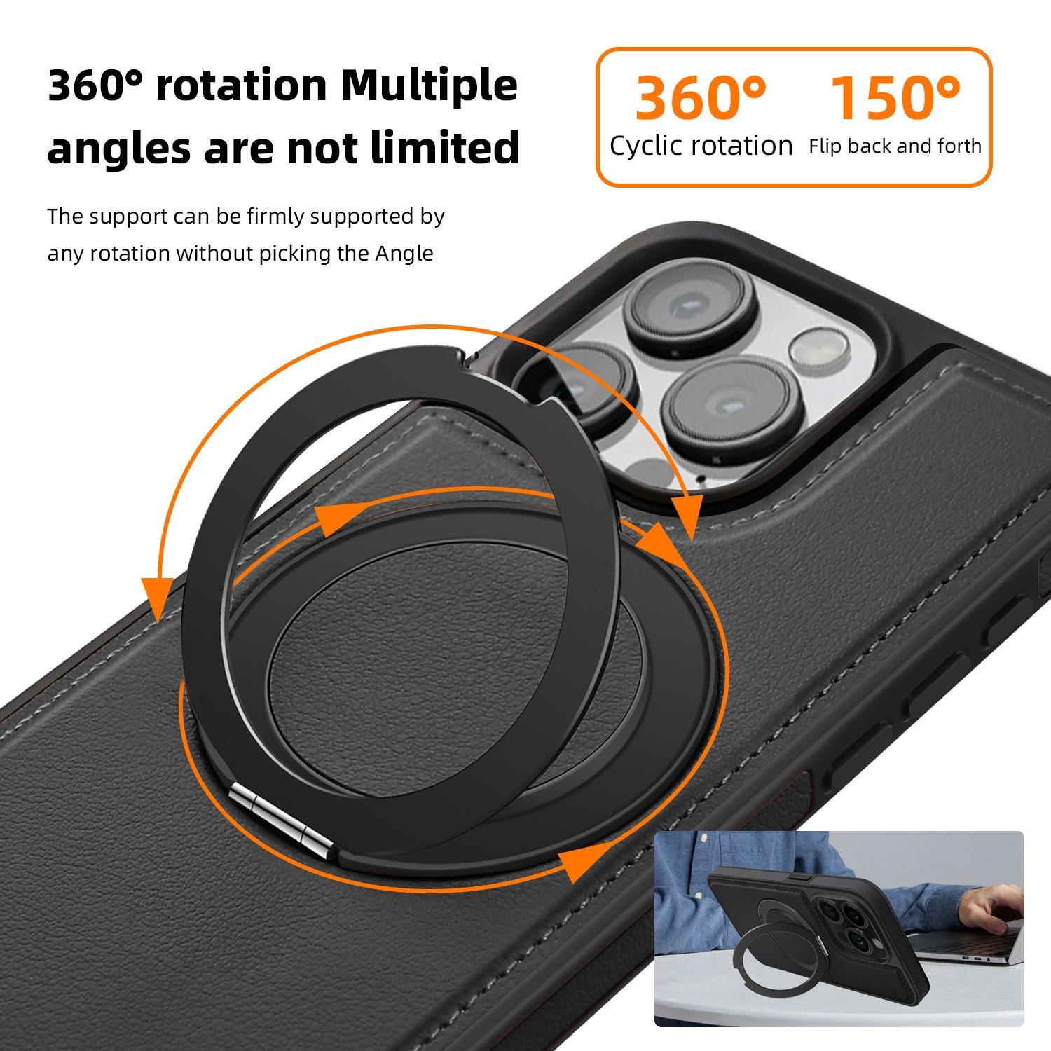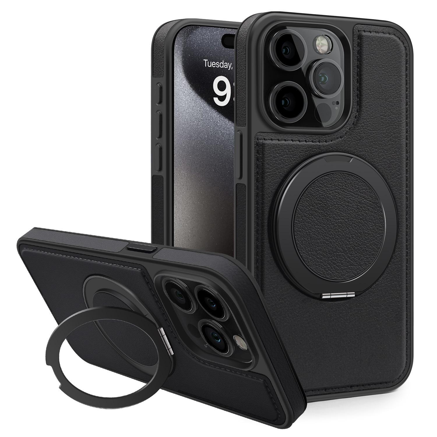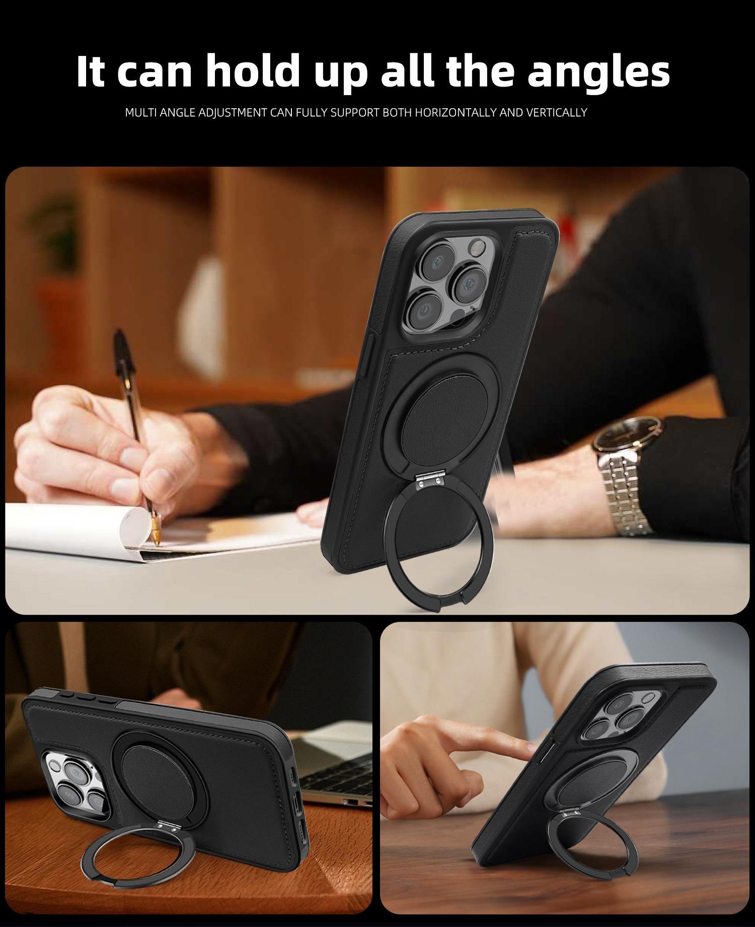 Luxury Full Leather Phone Case For iPhone 16ProMax 16 15 14 13 12 11 Magnetic Rotate Metal Holder Stand Back Cover