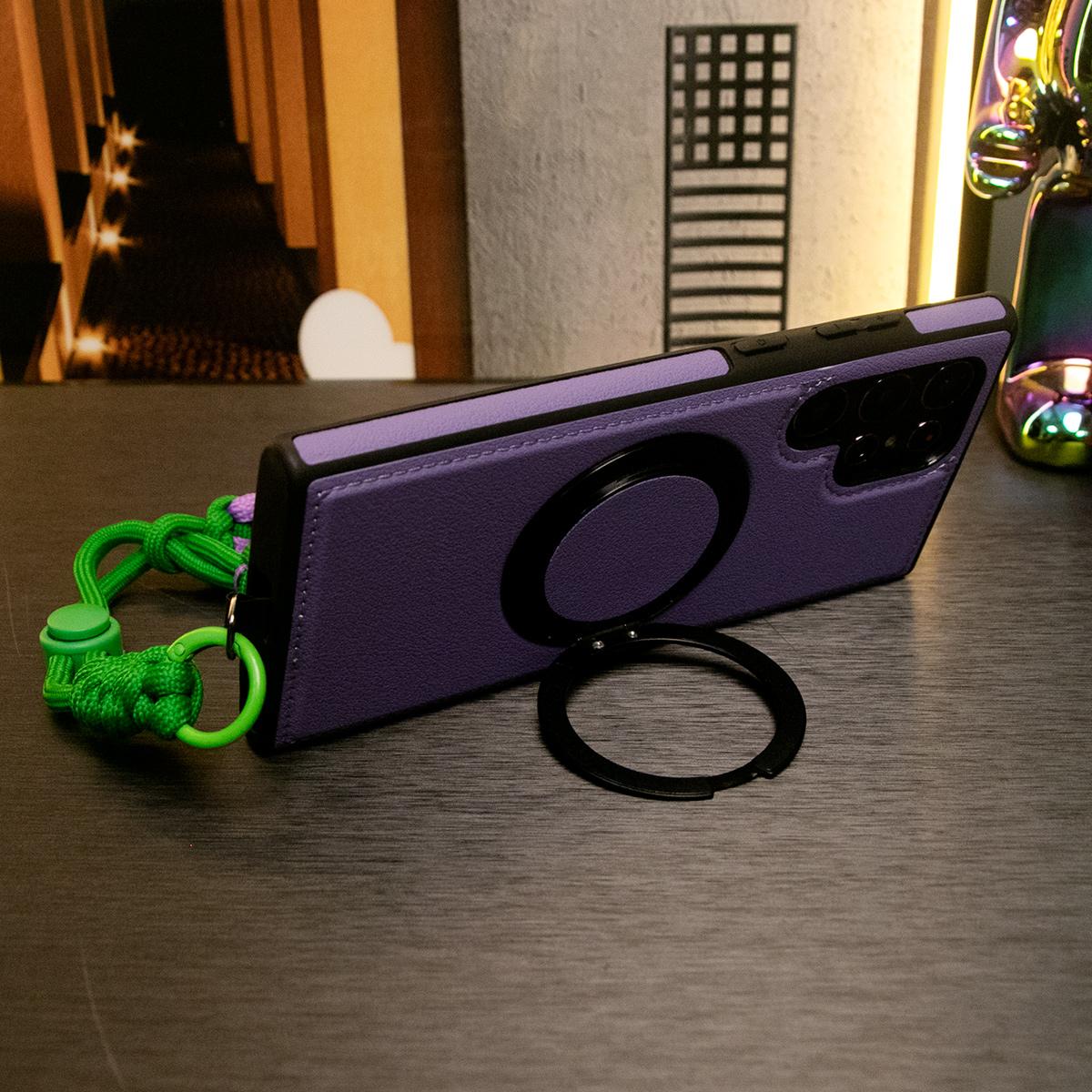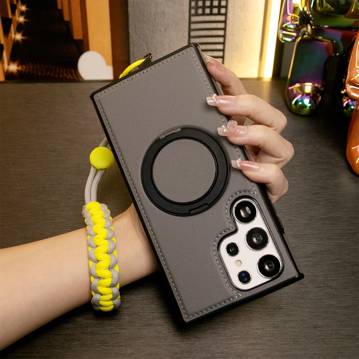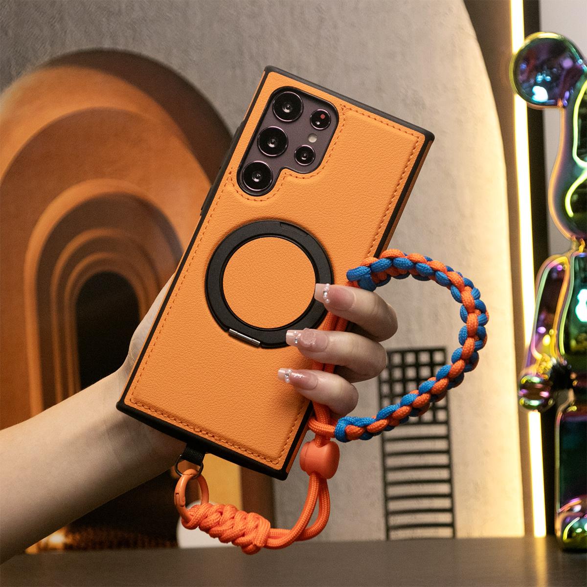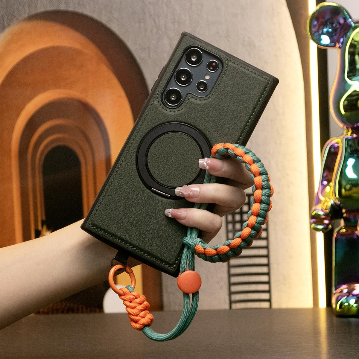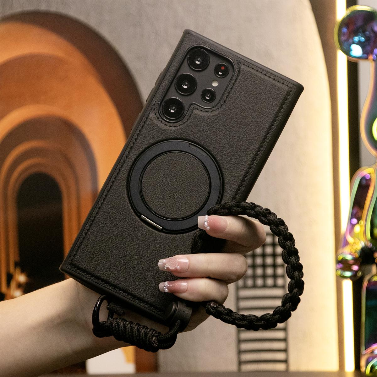 Luxury Full Leather Phone Case With Adjustable Woven Wristband For Magsafe Samsung S24 Ultra S23 S22 Ultra Plus Magnetic Rotate Metal Holder Stand Back Cover