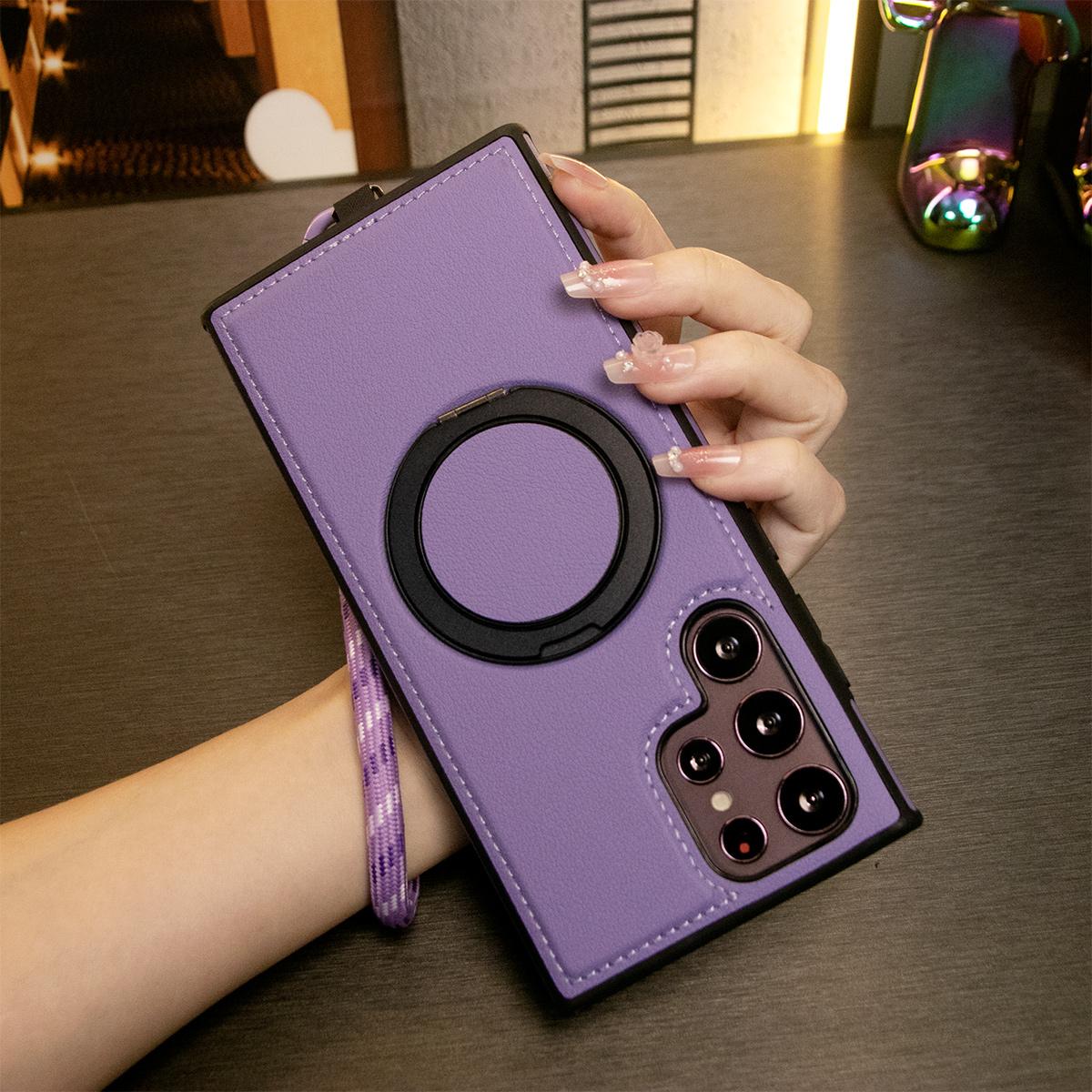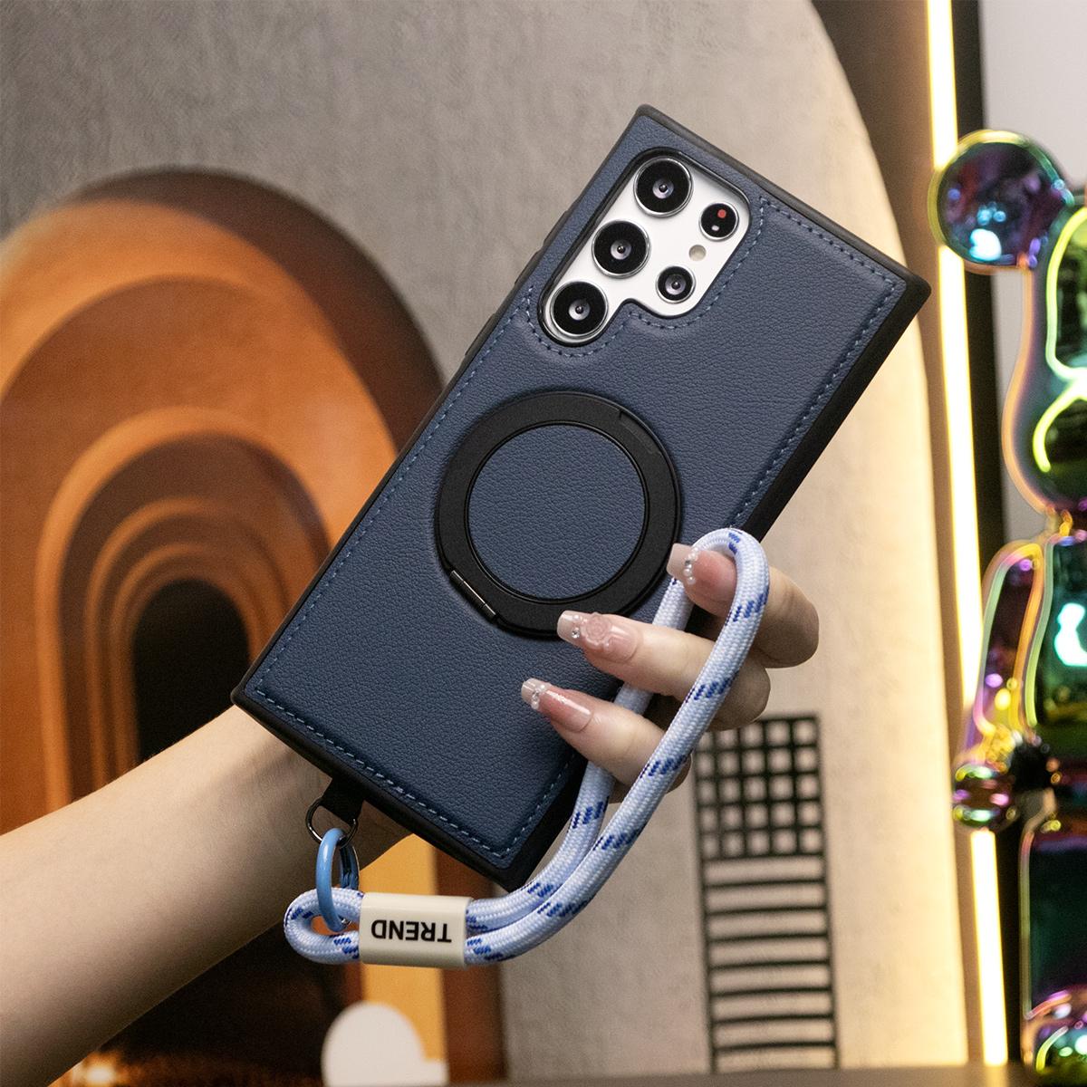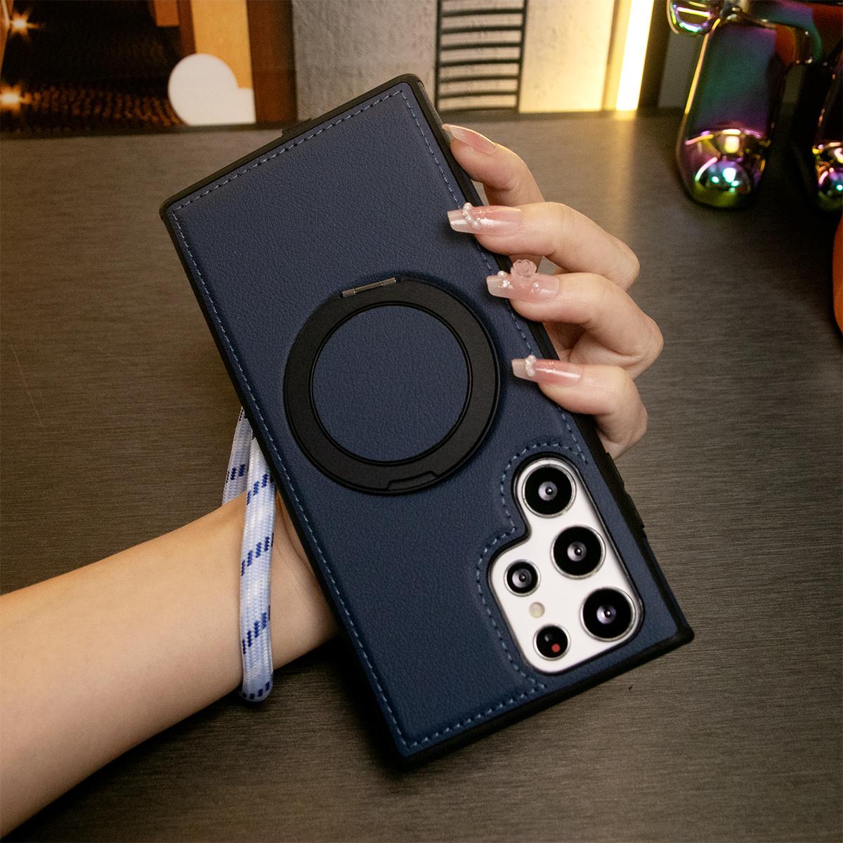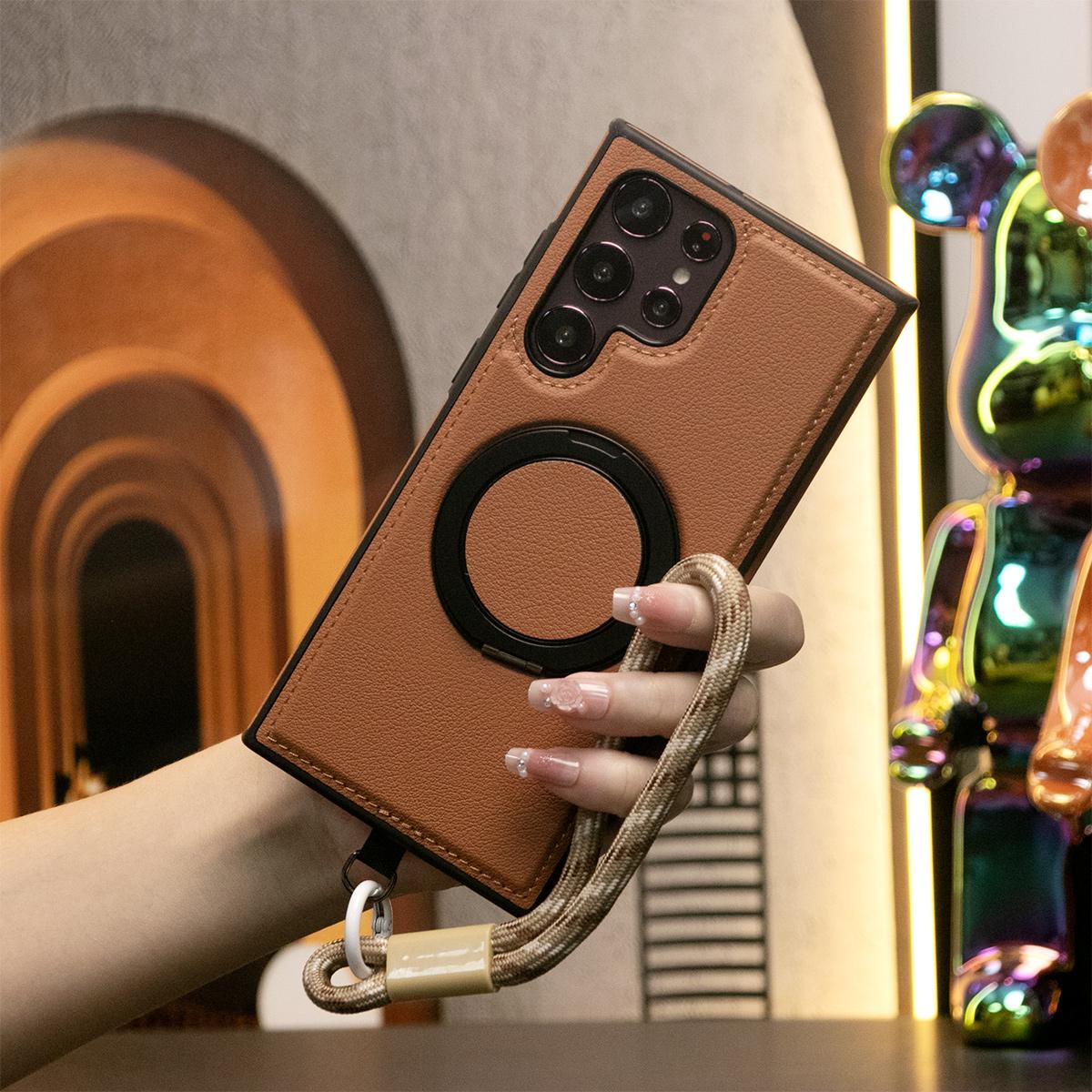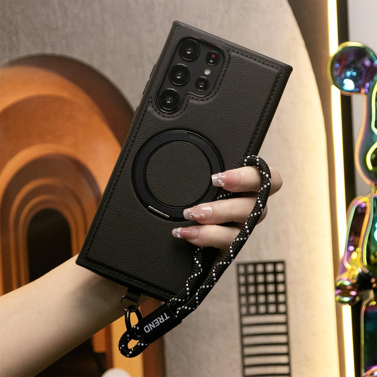 Luxury Full Leather Phone Case With Short Wristband For Magsafe Samsung S24 Ultra S23 S22 Ultra Plus Magnetic Rotate Metal Holder Stand Back Cover