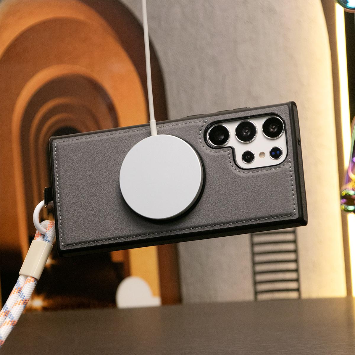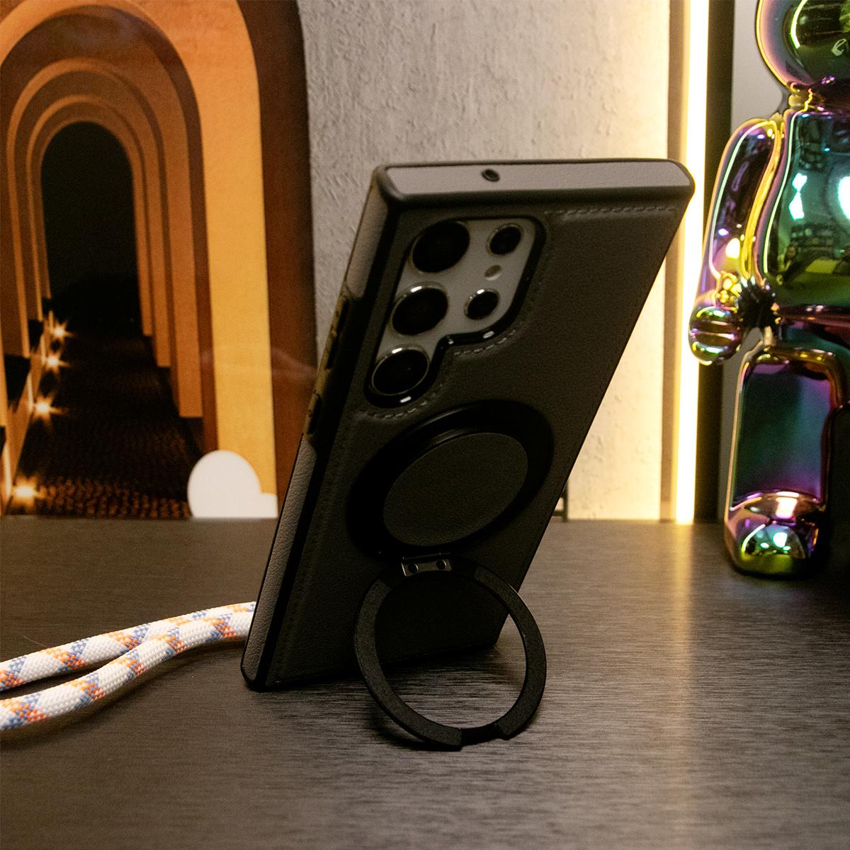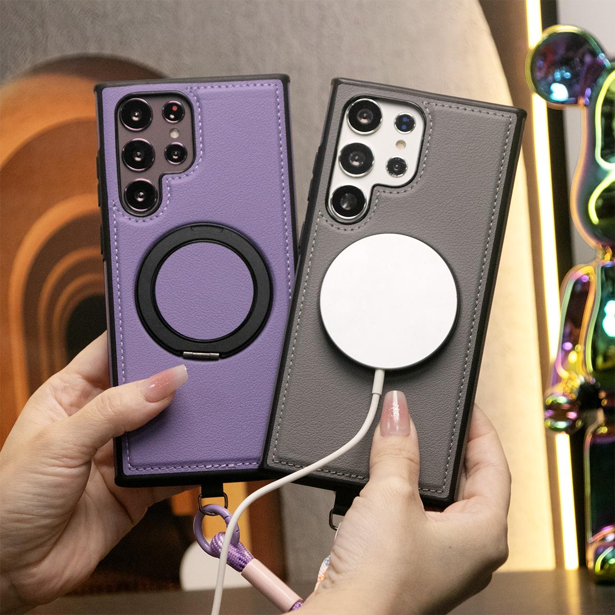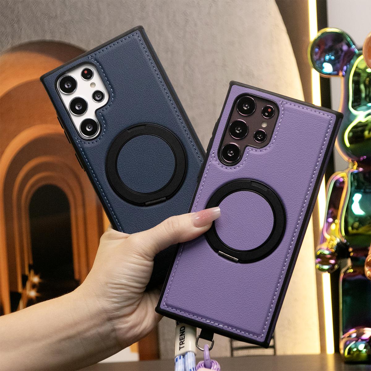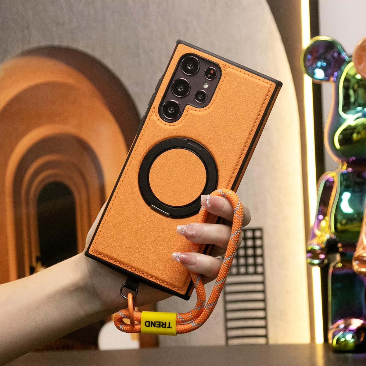 Luxury Full Leather Phone Case With Short Wristband For Magsafe Samsung S24 Ultra S23 S22 Ultra Plus Magnetic Rotate Metal Holder Stand Back Cover