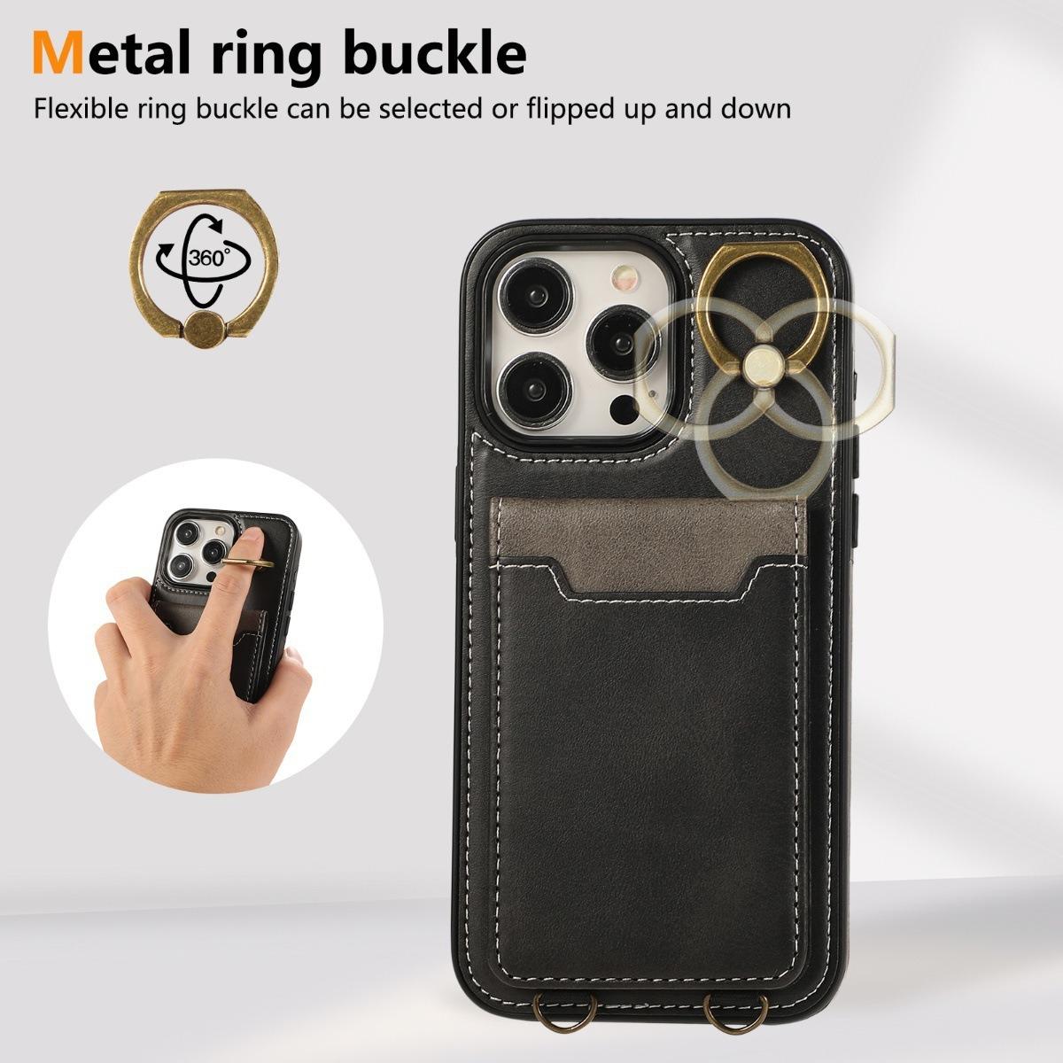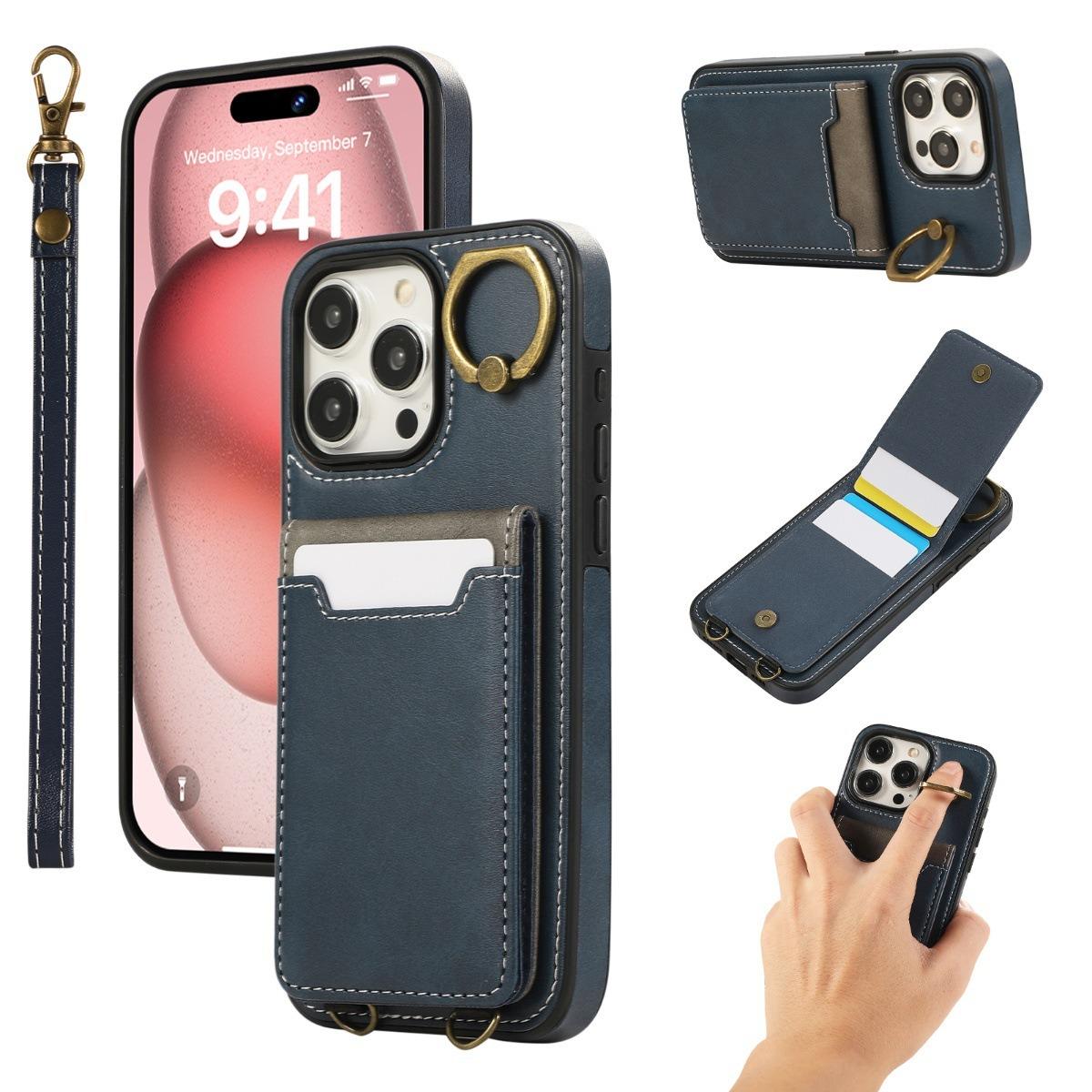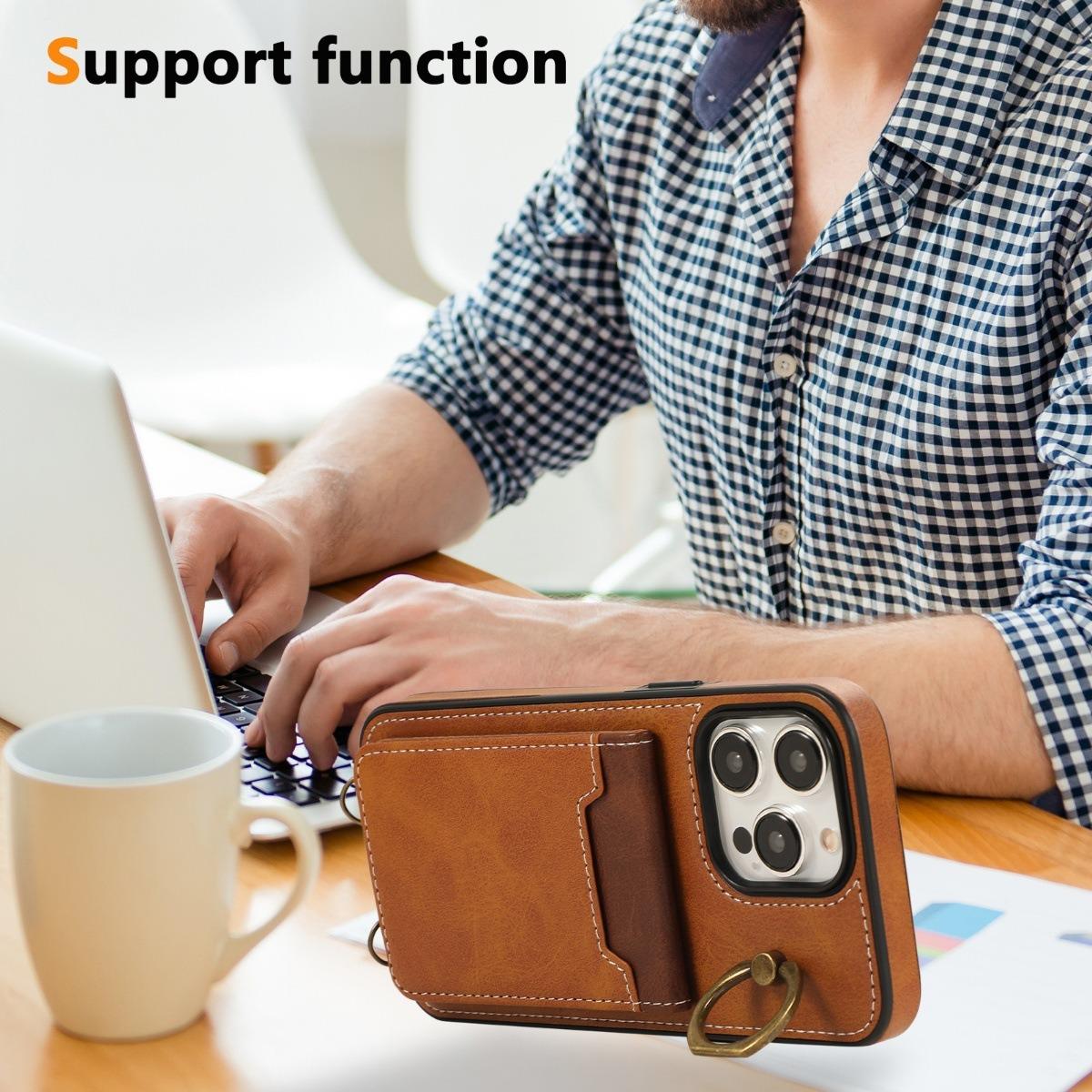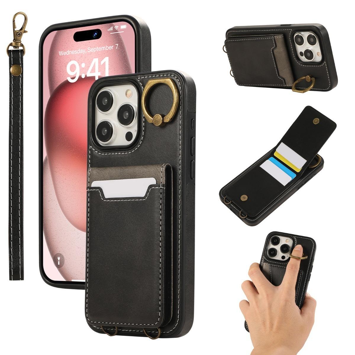 For iPhone 16ProMax 16 15 14 13 12 Leather Phone Case with Double Folding Wallet Wristband, Anti-Fall Card Slot Ring Kickstand Shockproof Business Hard Full Cover