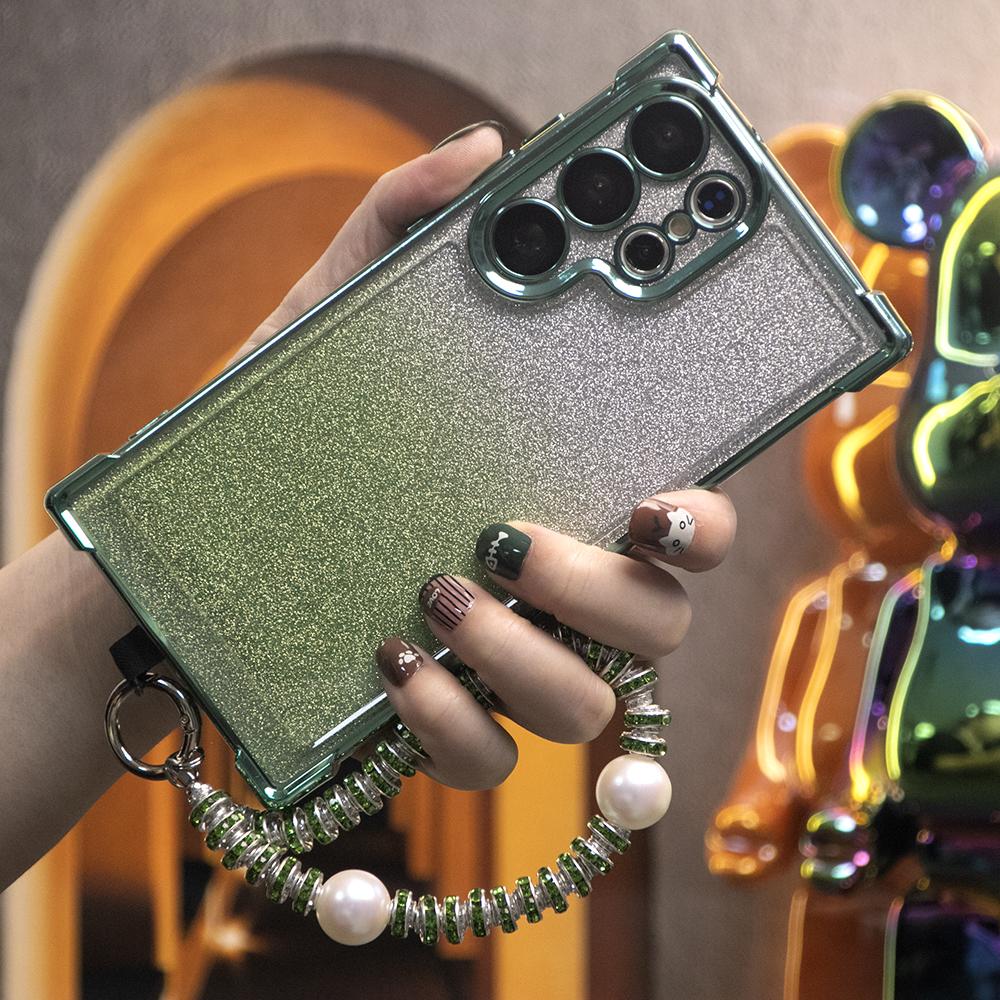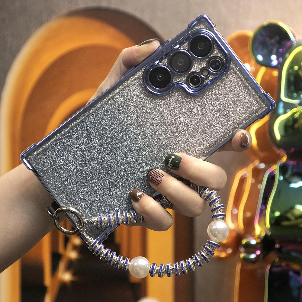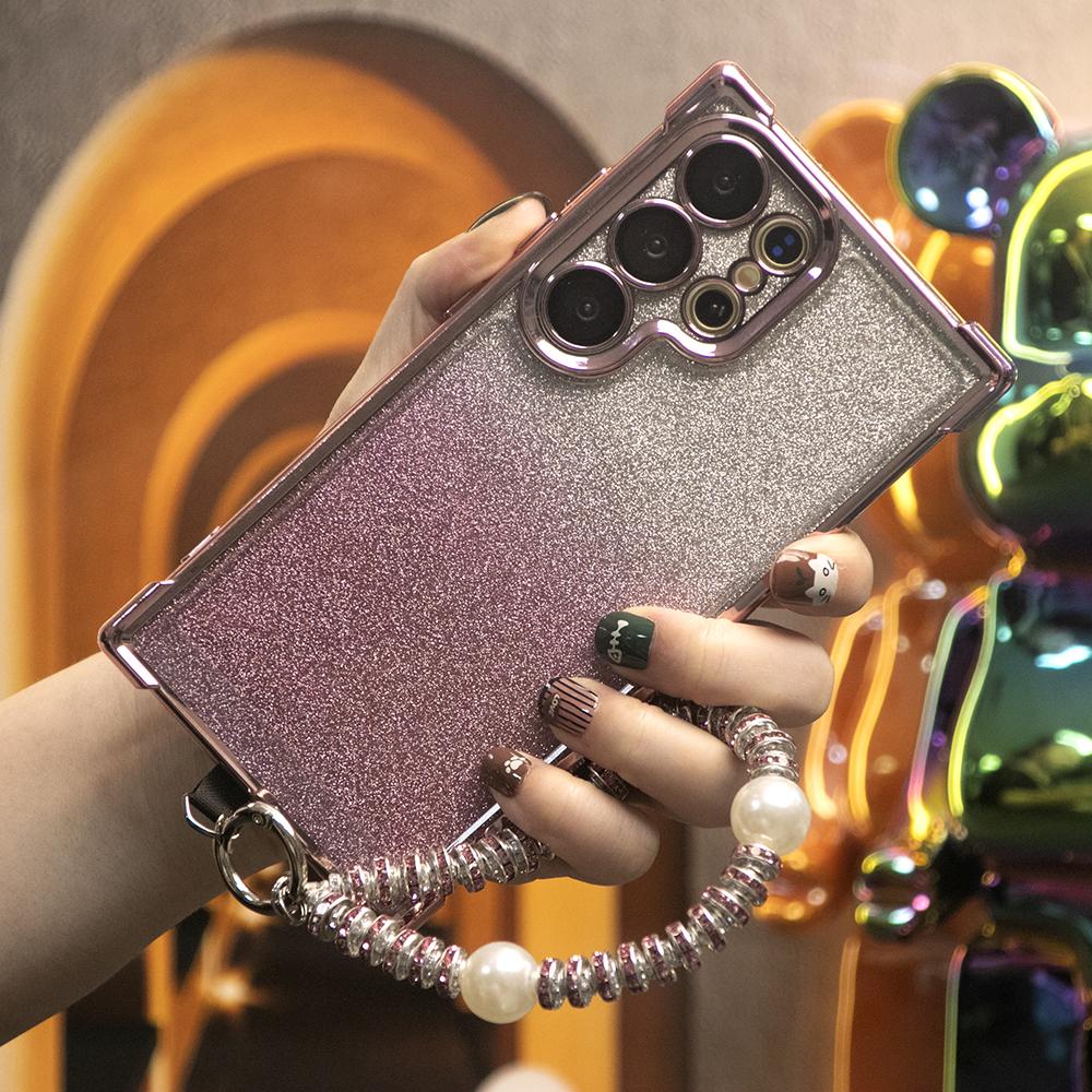 Gradient Plating Four Corners Phone Case with Pearl Diamond Wristband for Samsung S25Ultra S25 S24 S23 S22 S21 Note20 A53 A54 A55 Hard Acrylic Bumper Full Cover