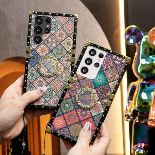 Retro Flower Heavy Duty Protection Lanyard Phone Case For Samsung S25 S24 S23 S22 S21 Note20 Geometric Square For Samsung A55 A54 A53 A35 A34 A24 A25 A14 A15 A16